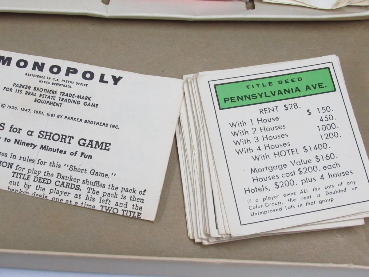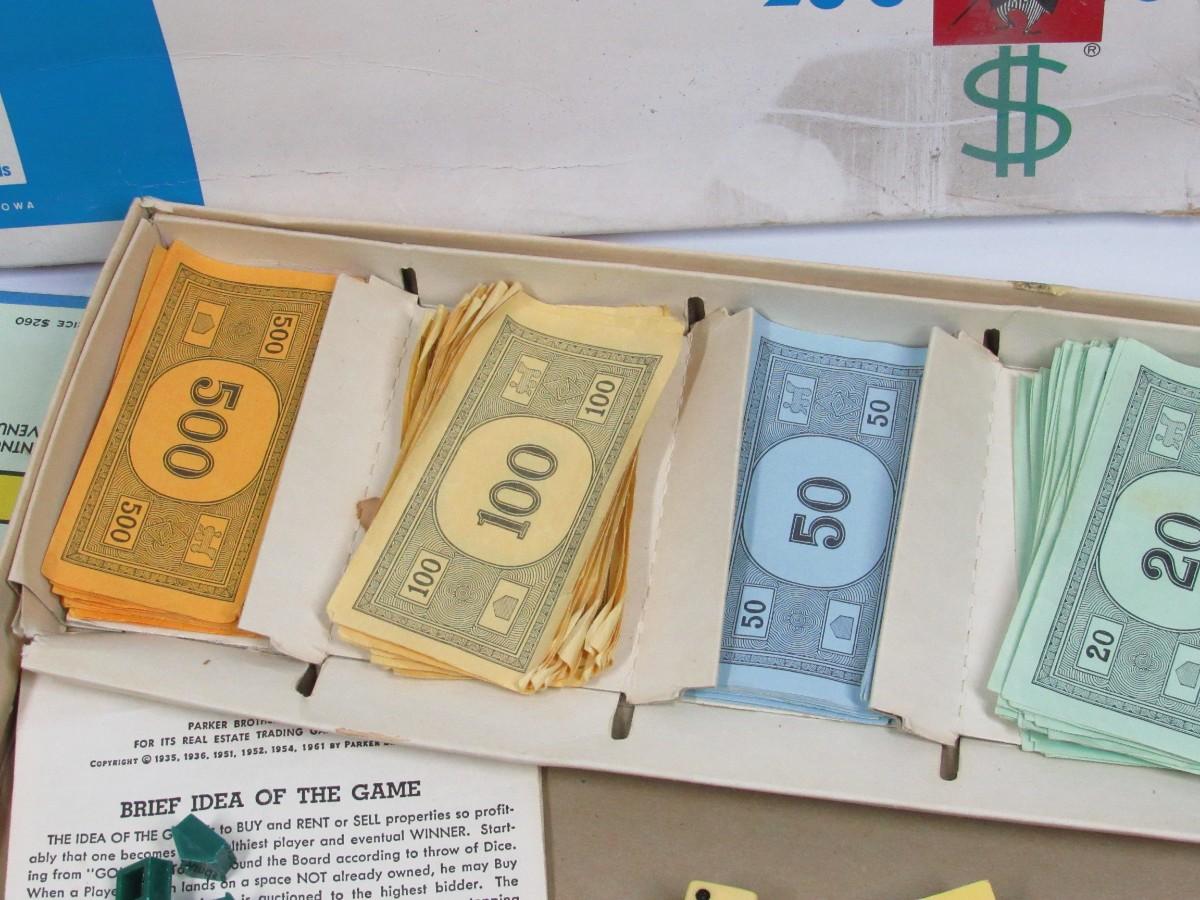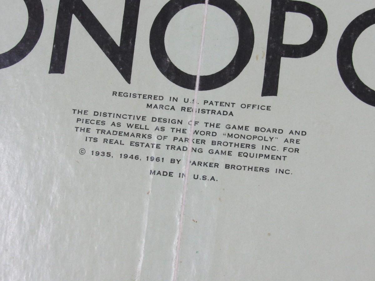 Vintage 1960s Version of Monopoly Real Estate Trading Boardgame. Date on board 1961. In good vintage condition, unsure if 100% complete.
