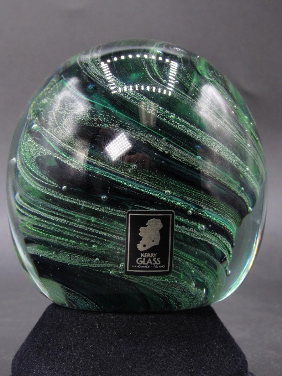 Vintage Emerald Green Swirled Blown Art Glass Paperweight Kerry Glass Ireland. In good condition. Has original maker sticker attached. About 3" size.