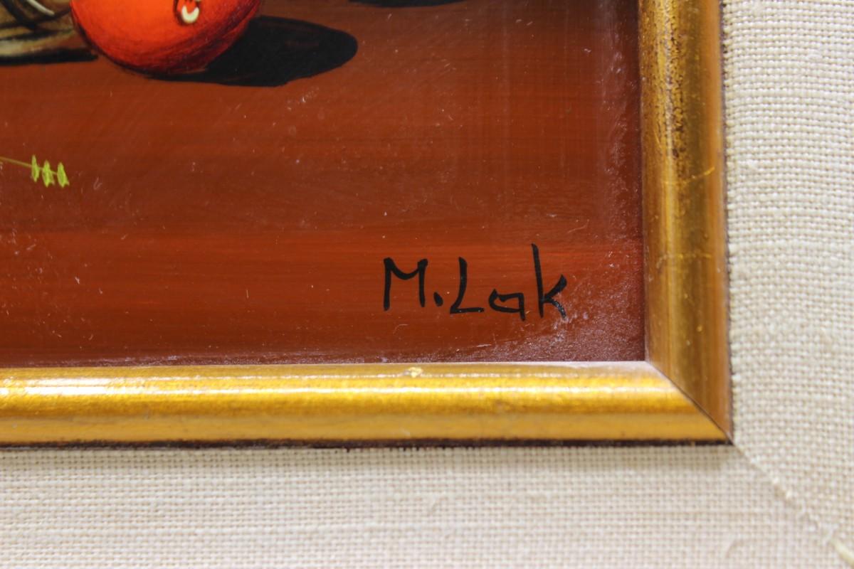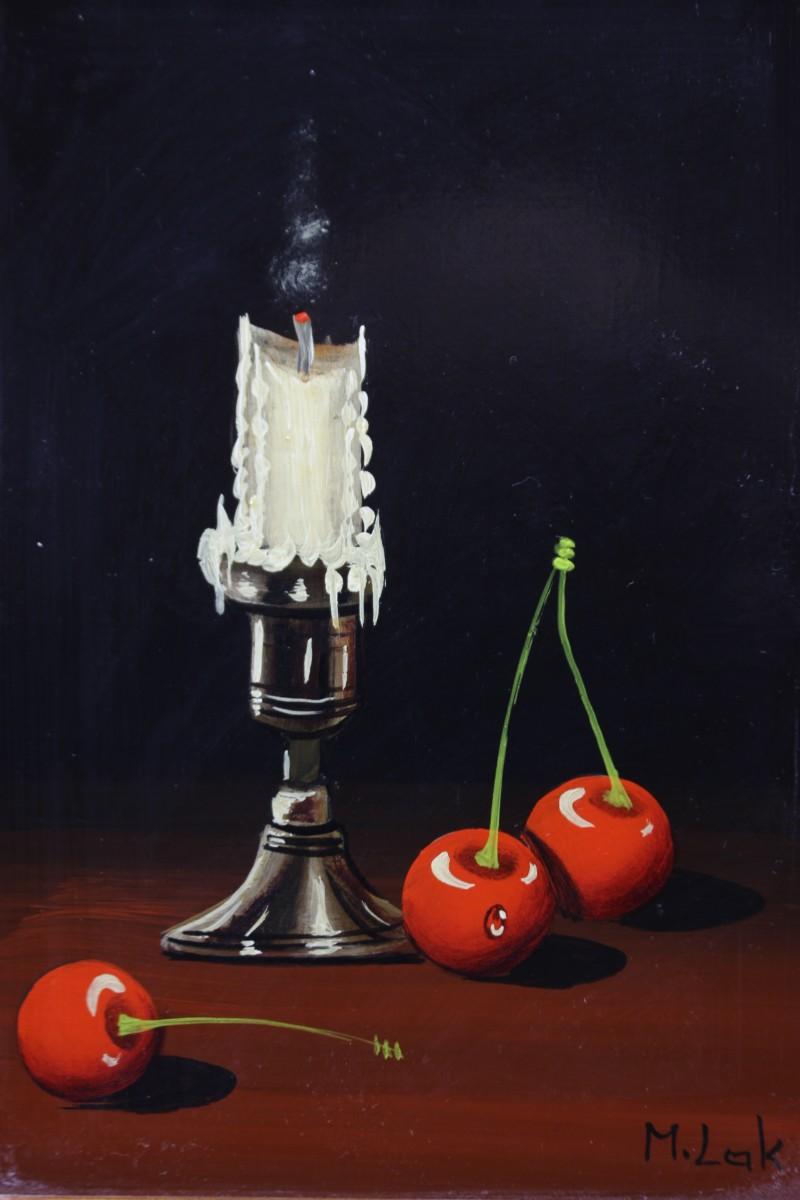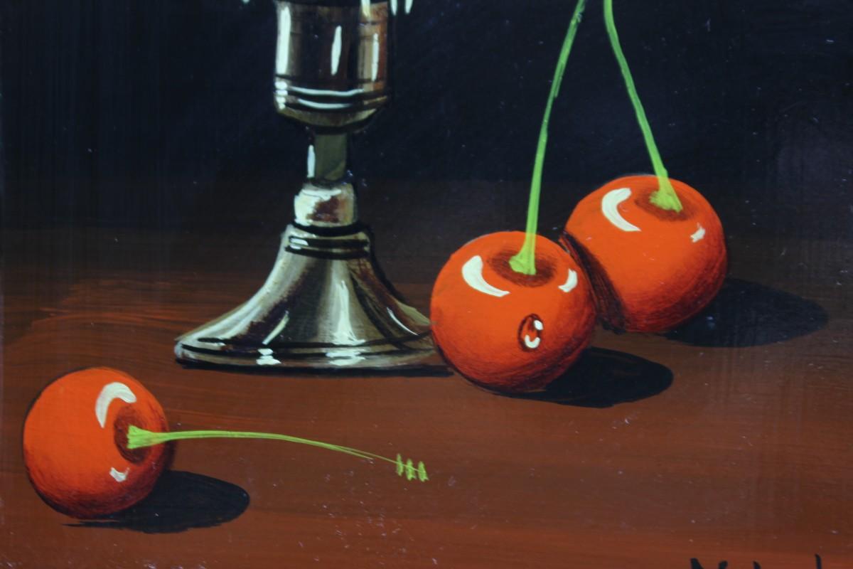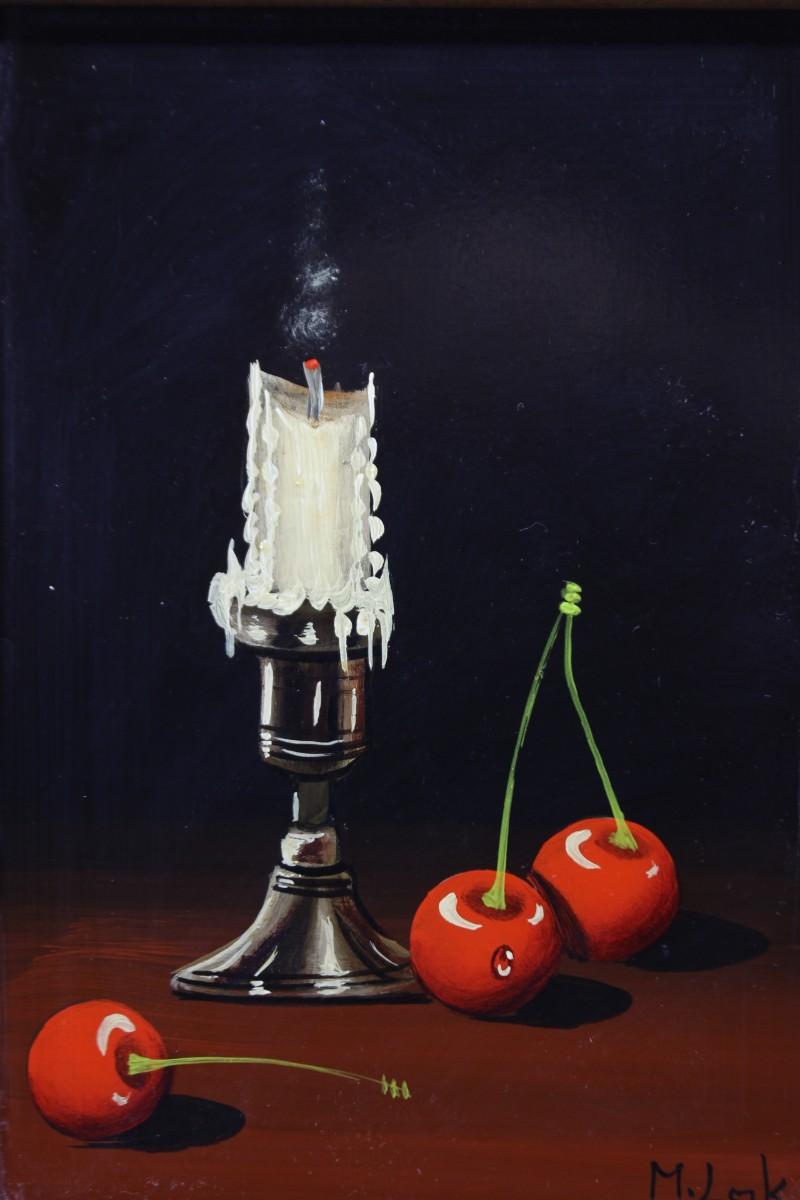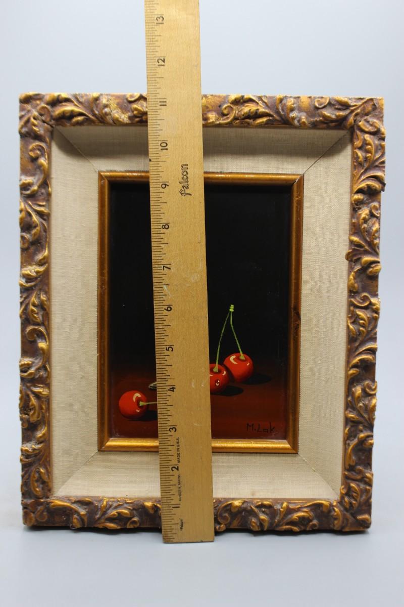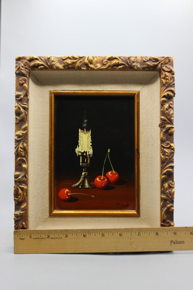 Vintage Dramatic Modern Still Life Candle with Cherries Small Framed Art by Maria M. Lak. Done by known artist Maria Lak. Beautiful use of color to create light. Frame 9x11 roughly.