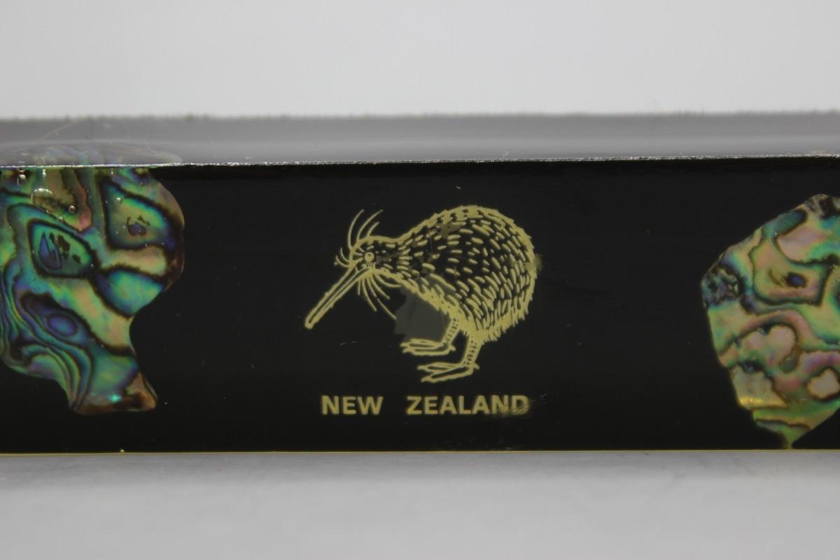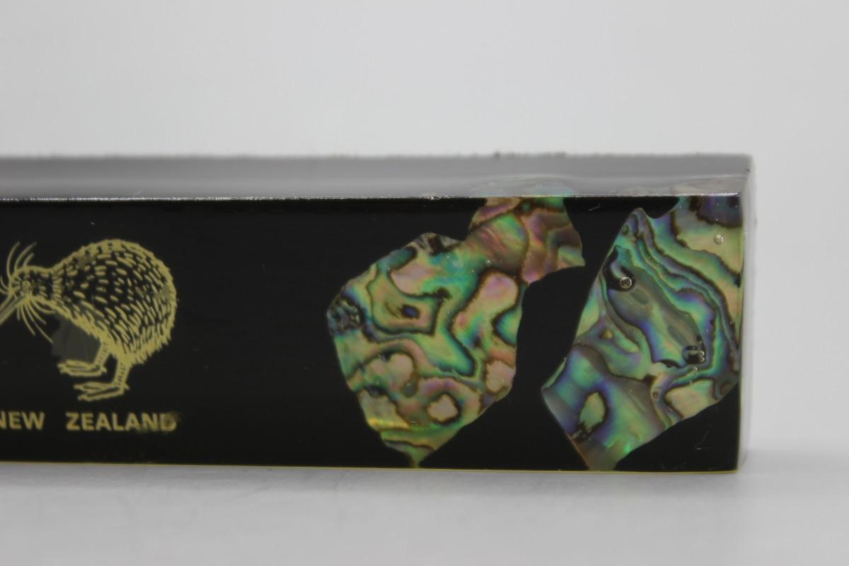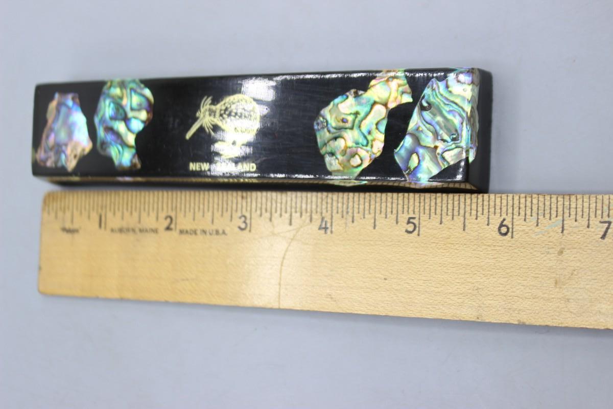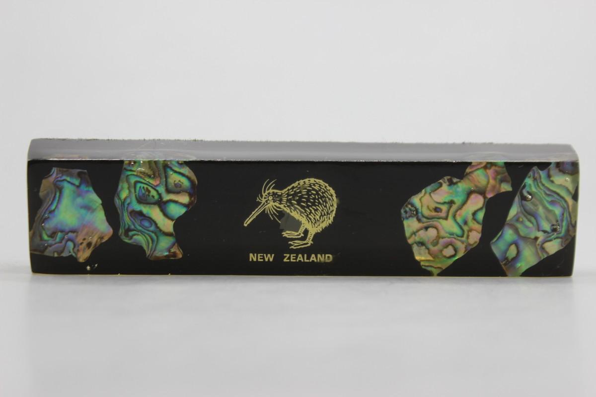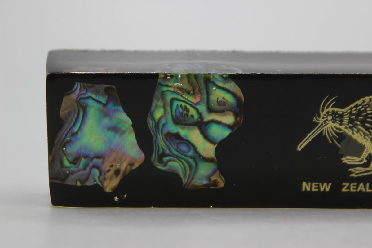 Vintage New Zealand Paua Shell in Resin Vacation Souvenir Plaque Paperweight. Feature Kiwi bird and shell pieces. In good condition. 6" length.