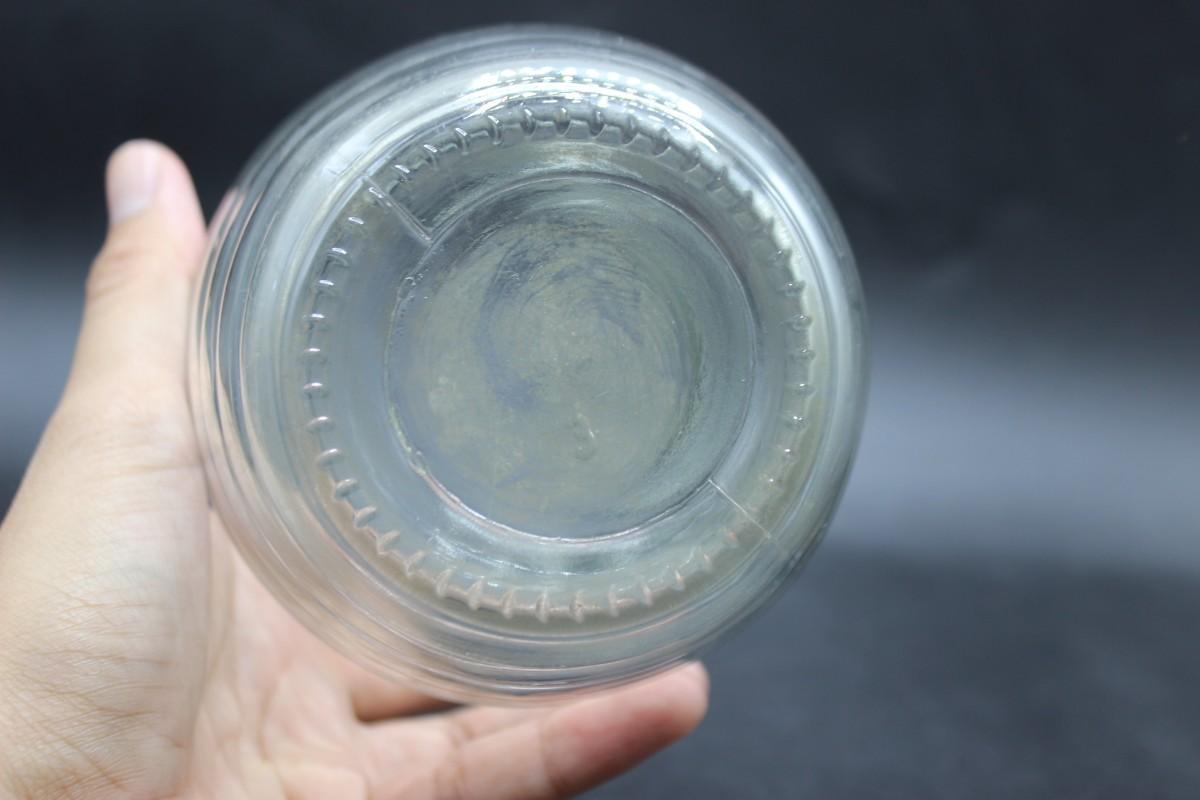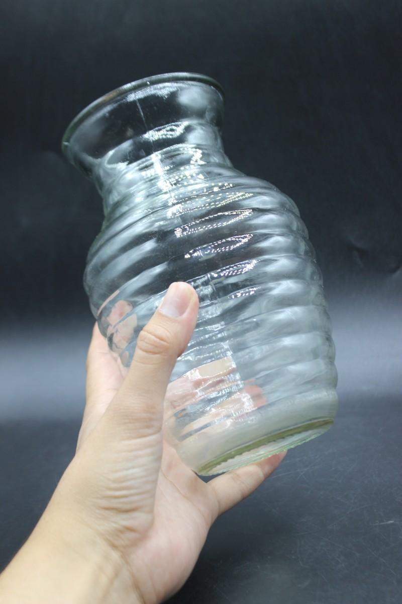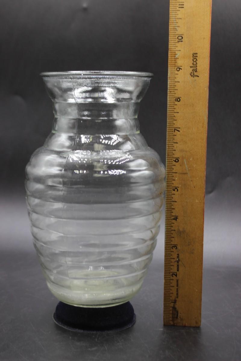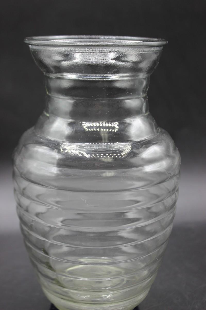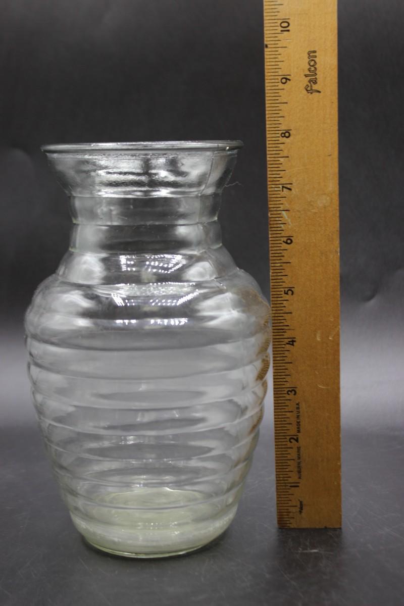 Vintage Clear Ribbed Glass Bottle Vase Carafe. Has signs of age and use but no chips. About 9" size.