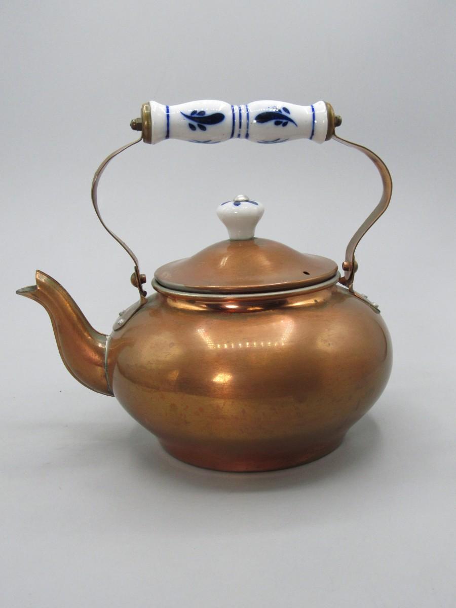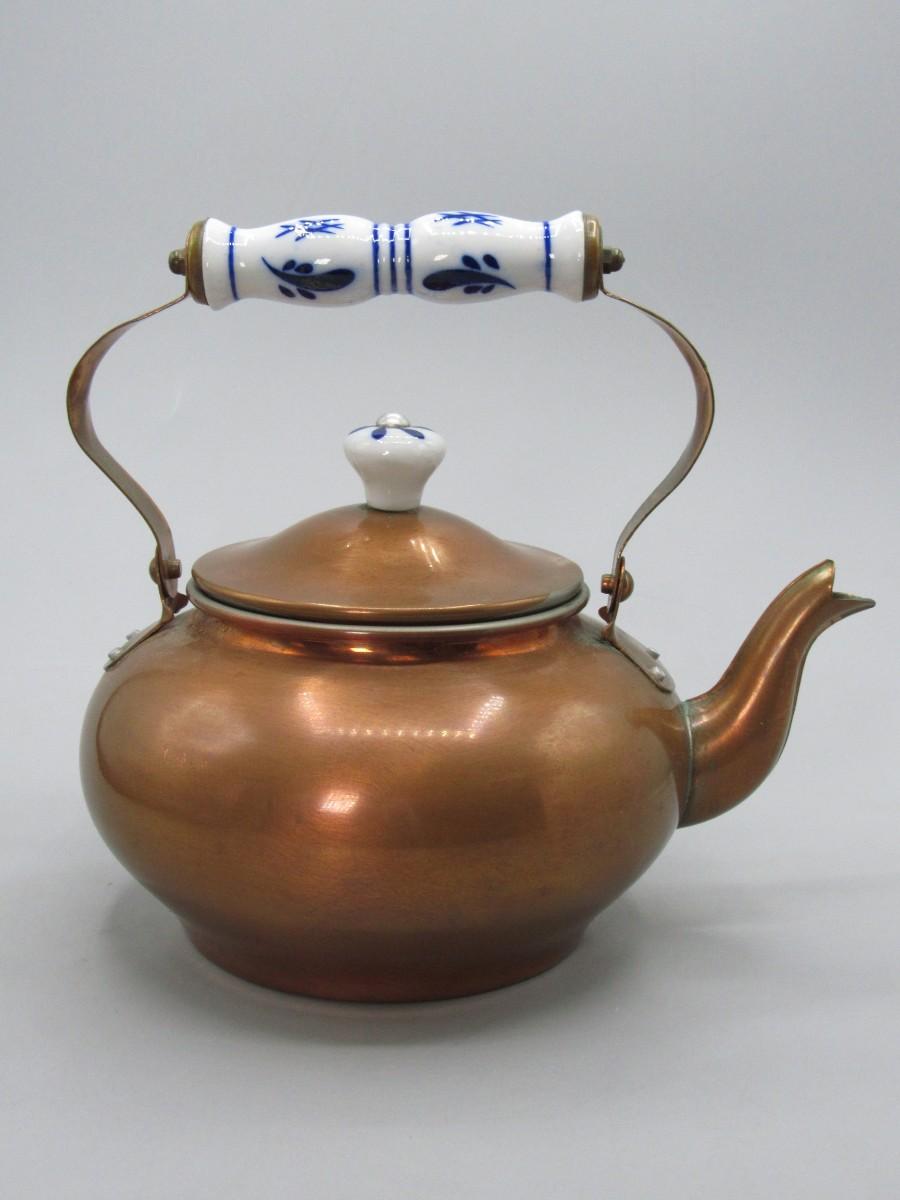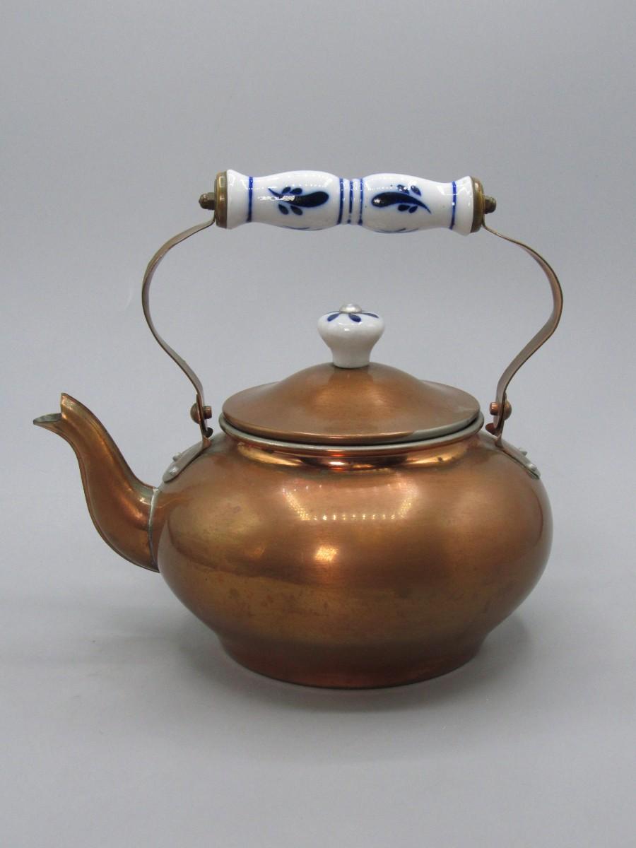 Vintage Copper Teakettle with Ceramic Blue and White Handle