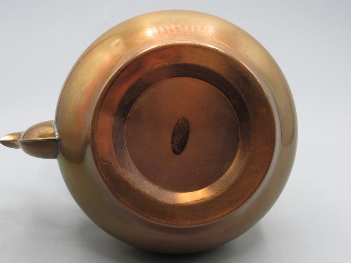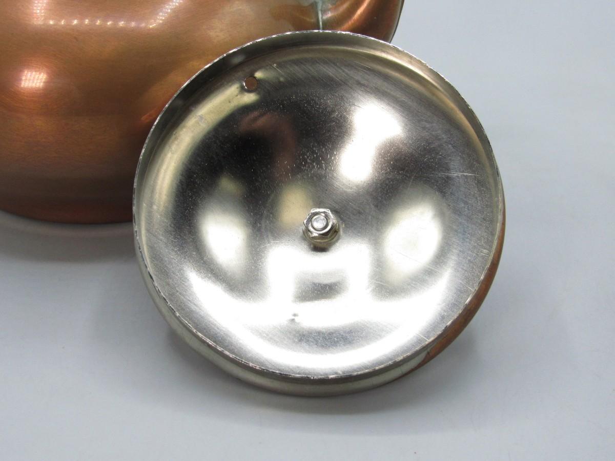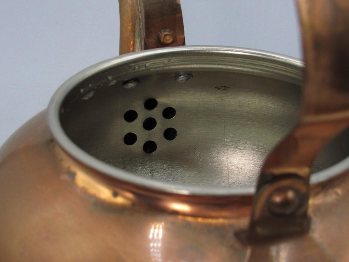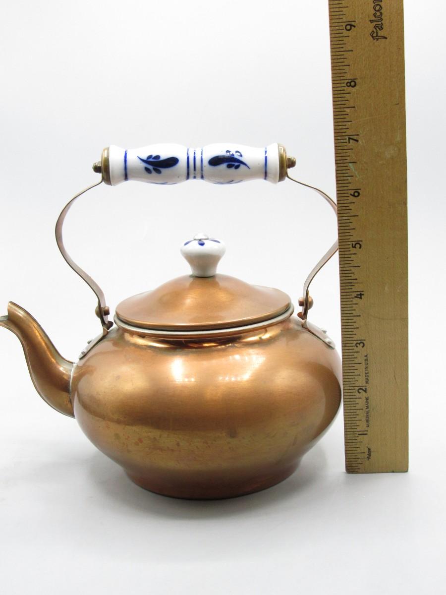 Vintage Copper Teakettle with Ceramic Blue and White Handle. Copper outer, stainless inside it looks like. In good condition. Displays nice. 7" tall with handle up.