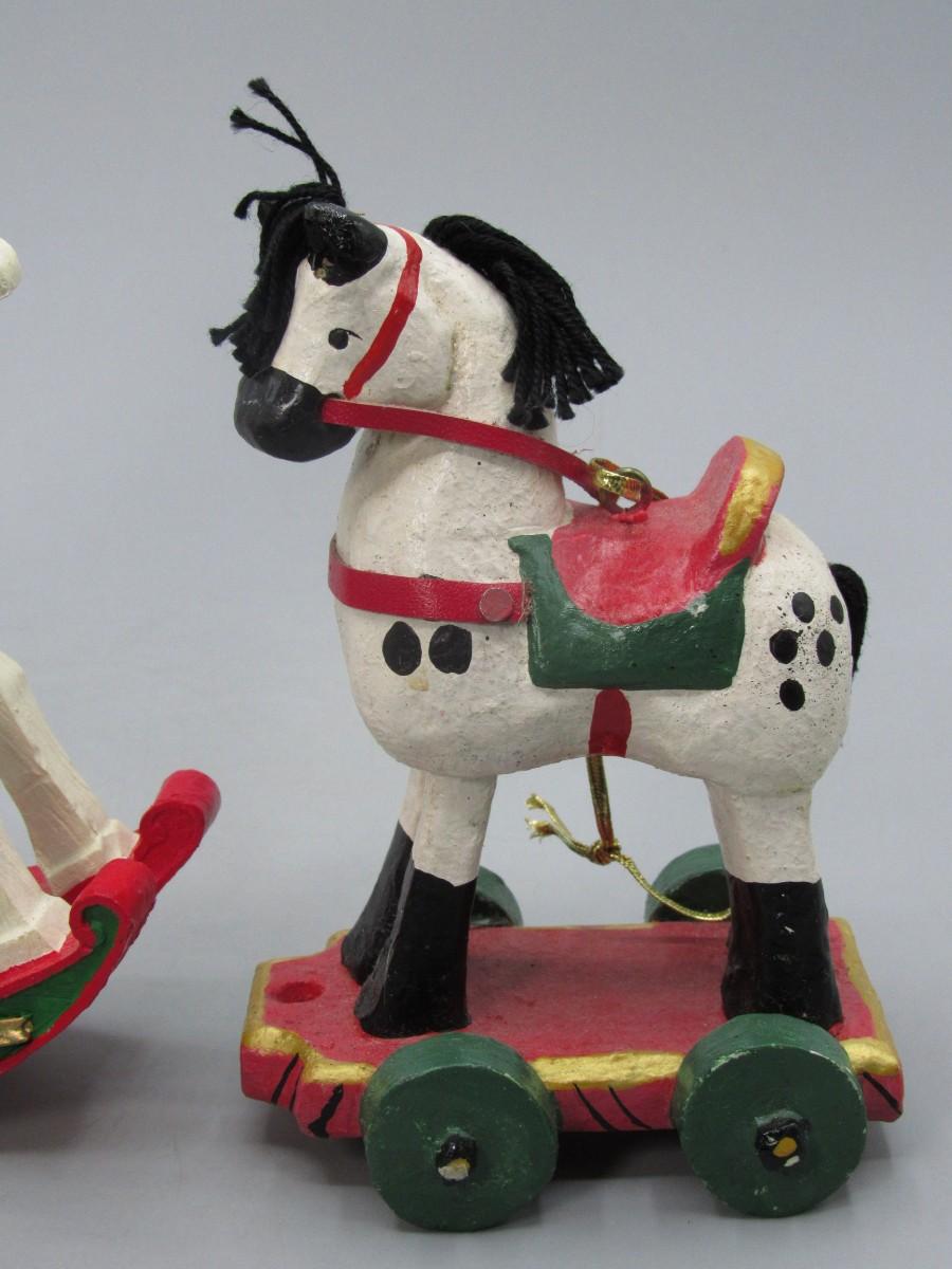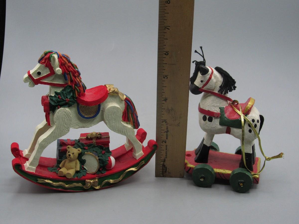 Pair of Christmas Holiday Rocking Toy Horses Unbranded and House of Hatten. The horse on wheels is from House of Hatten, the other is unbranded. Both are in good condition.