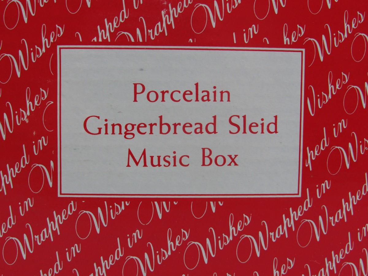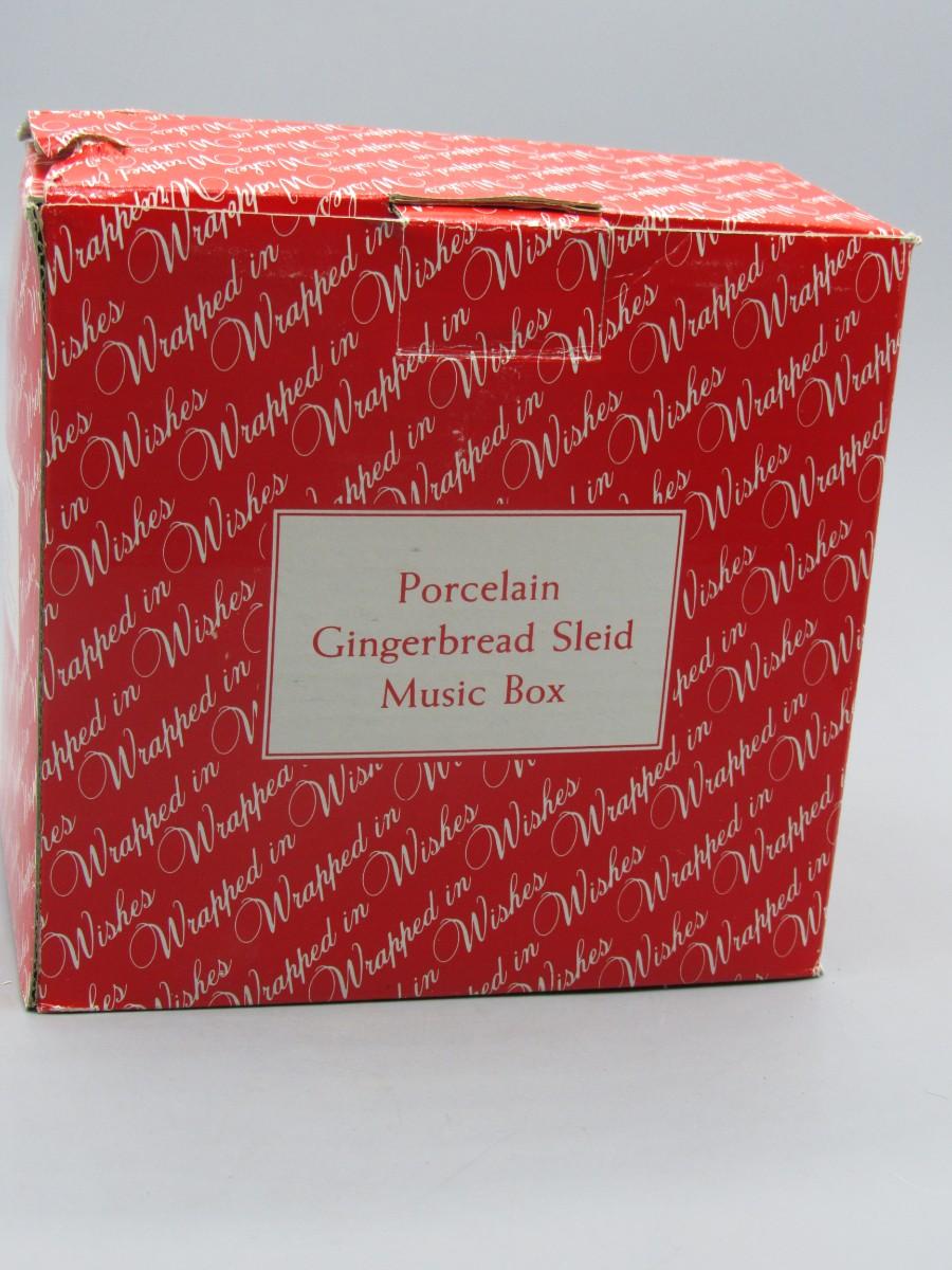 Porcelain Gingerbread Sled Music Box Wind Up in Original Box. In good condition. May have been received as a gift as the date 1996 is written on the bottom. About 6" size.