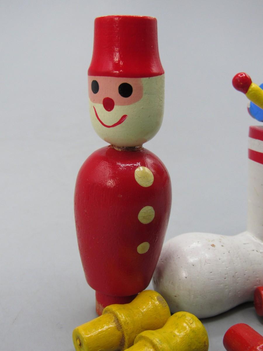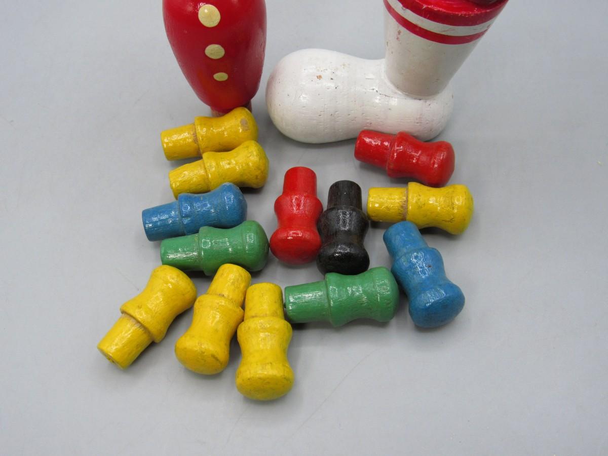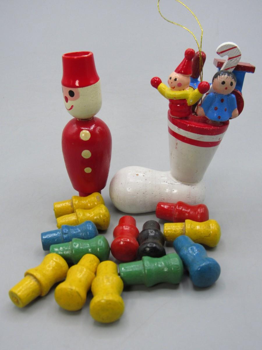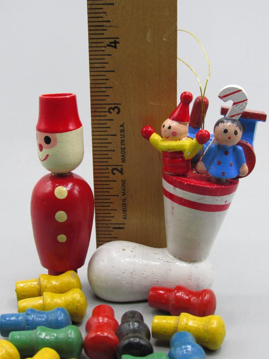 Mixed Lot of Paint Wood Ornament Figurine and Game Pags for Decor & Crafting. In vintage condition. Not sure what game the pegs may have gone to but could be repurposed.