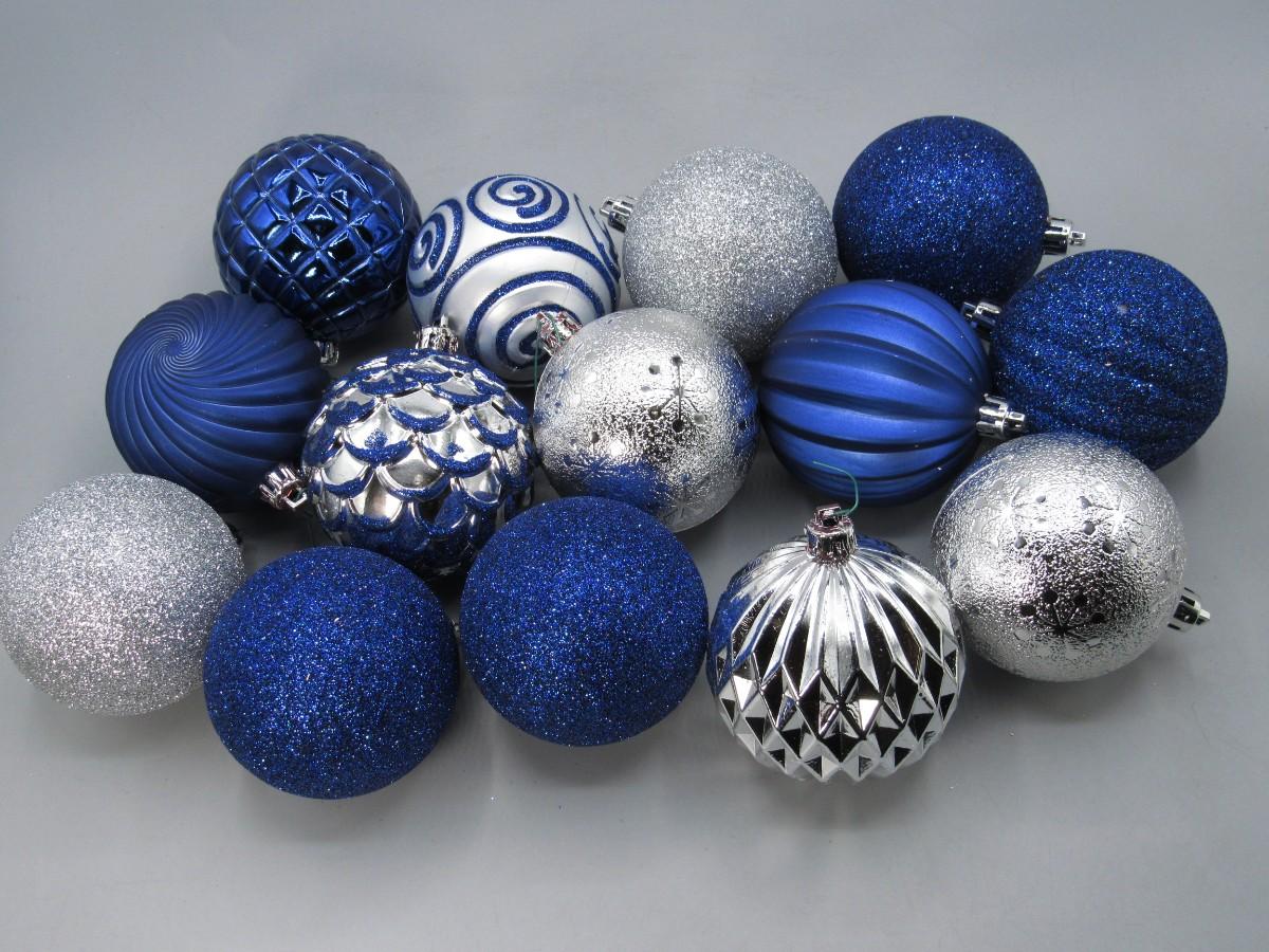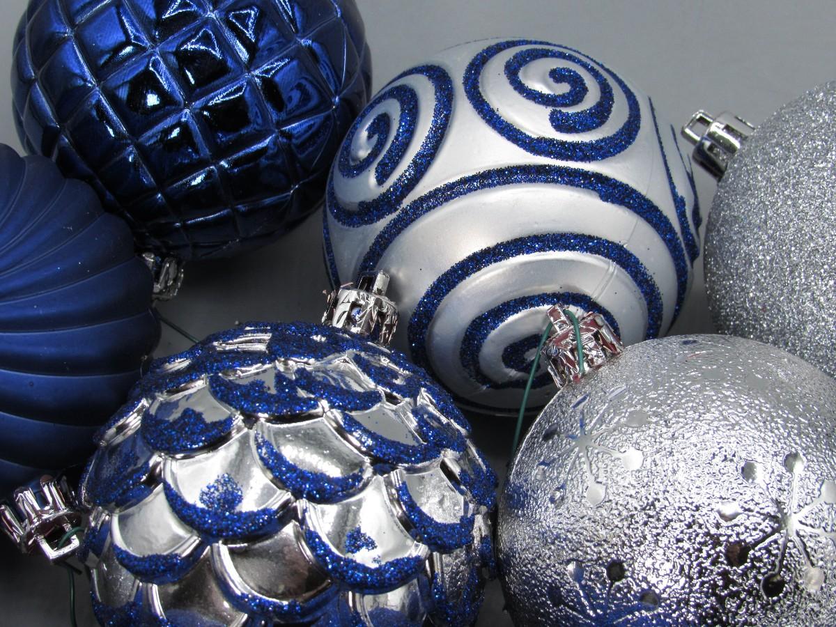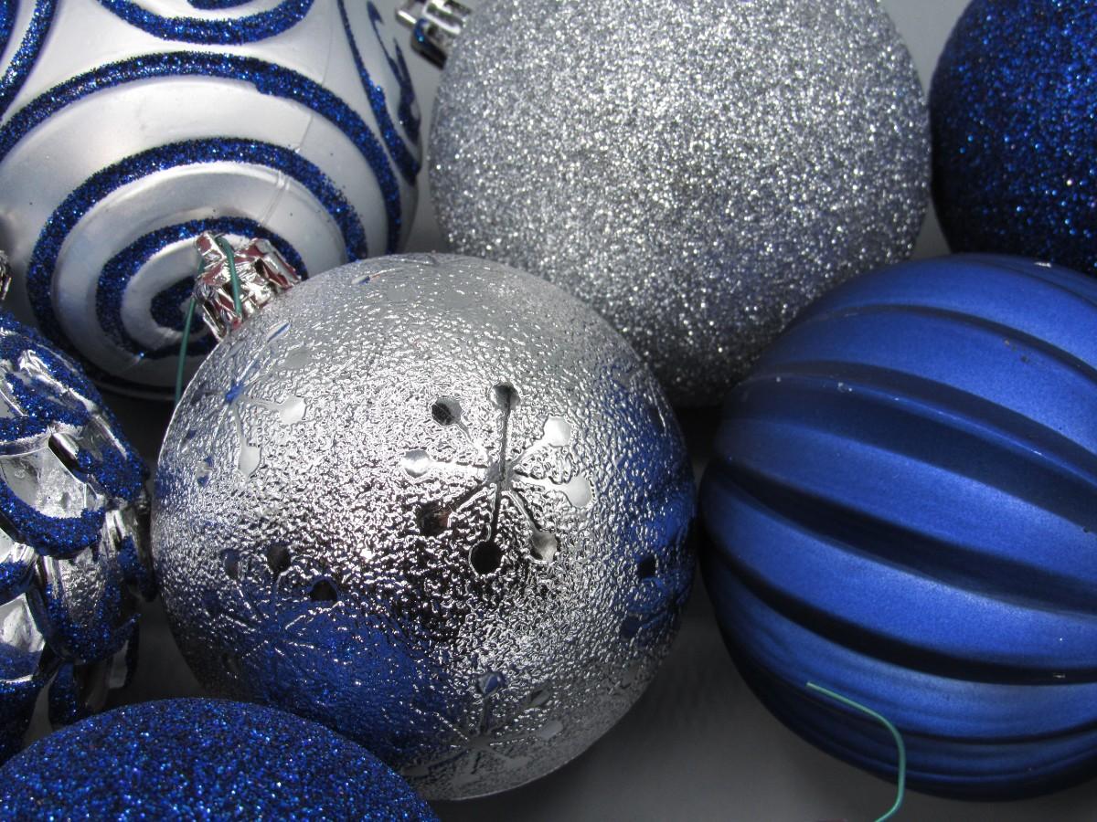 Blue and Silver Plastic Christmas Holiday Tree Hanging Ornaments. Variety of finishes, in good used condition.