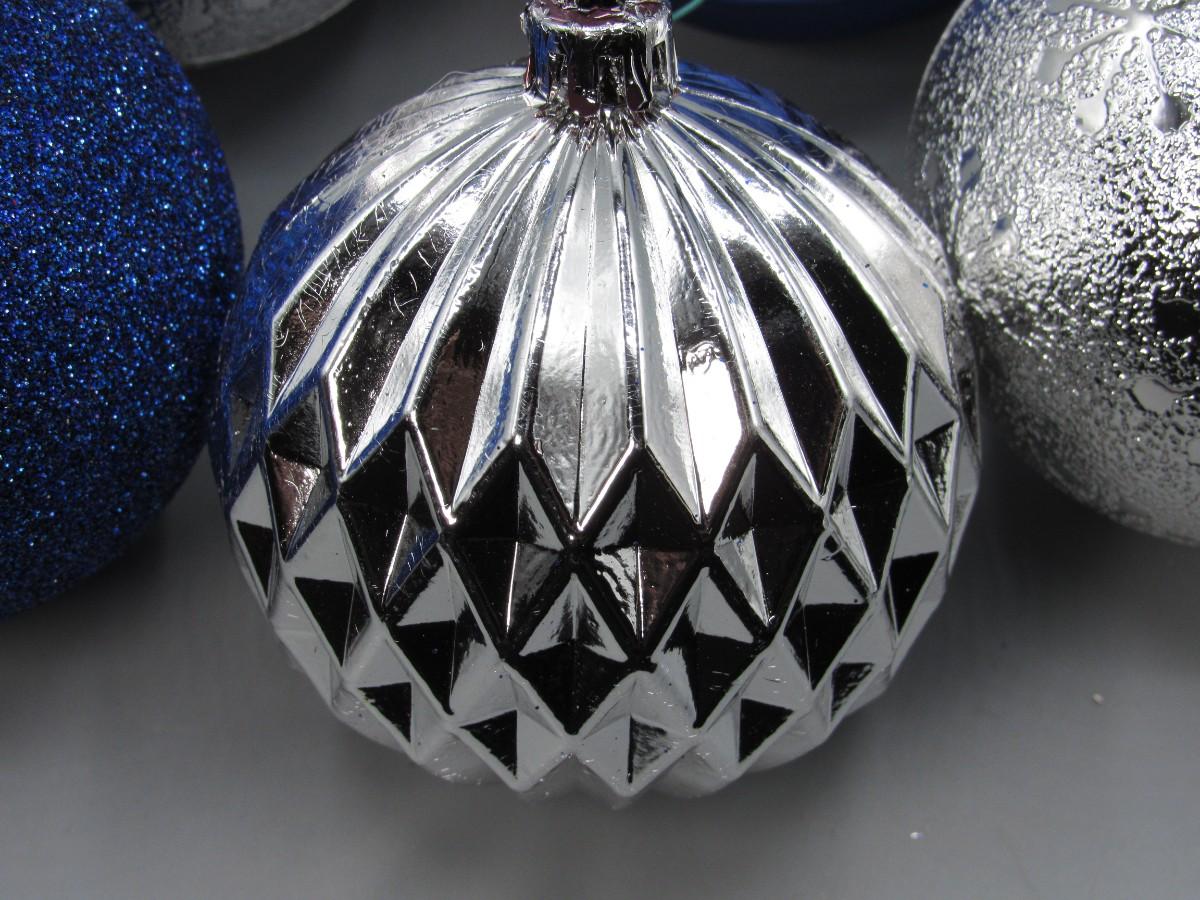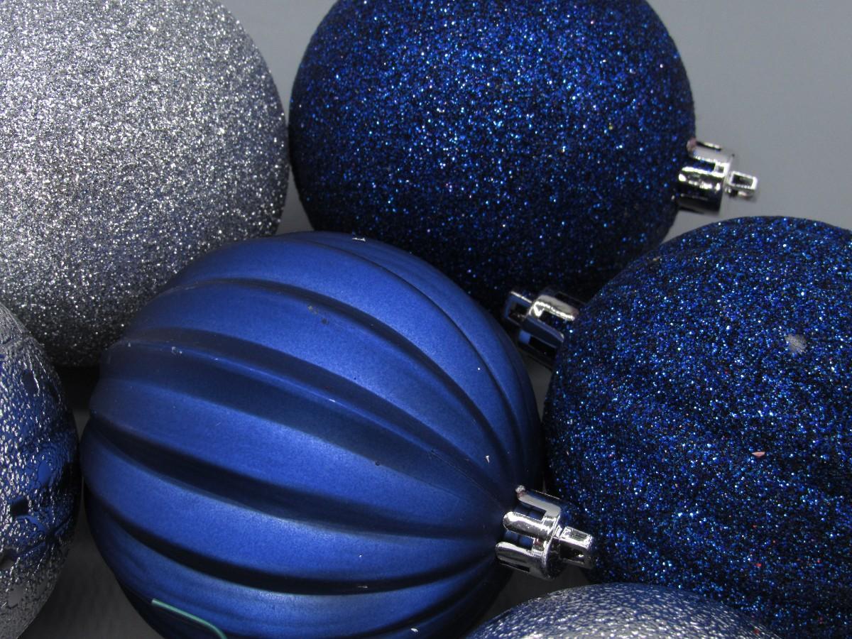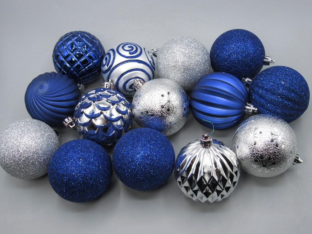 Blue and Silver Plastic Christmas Holiday Tree Hanging Ornaments. Variety of finishes, in good used condition.