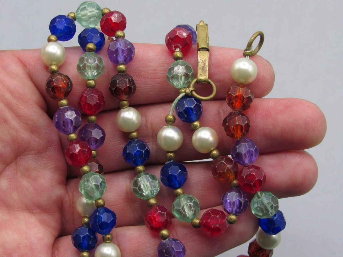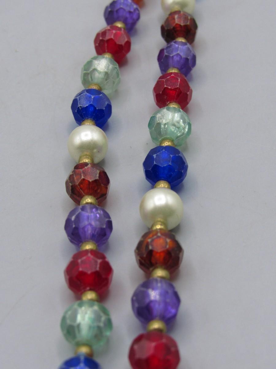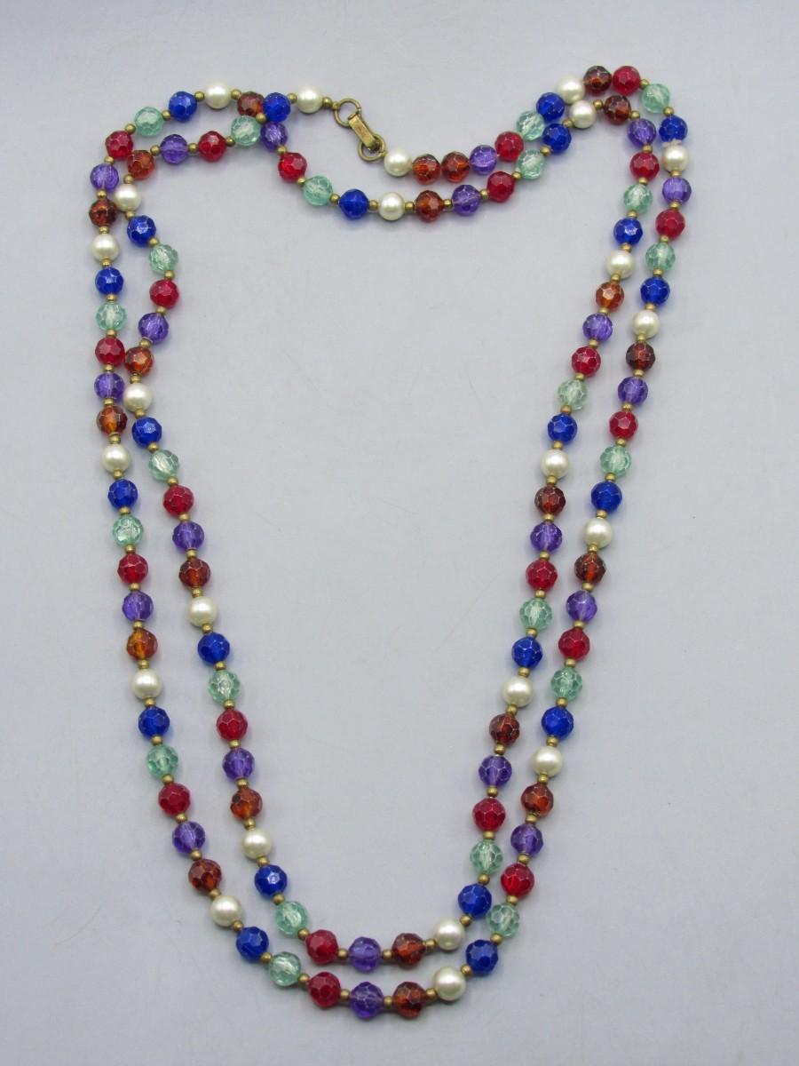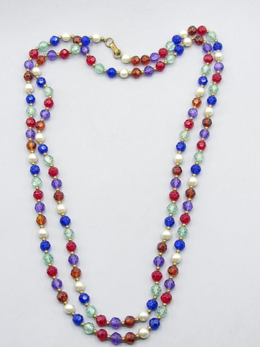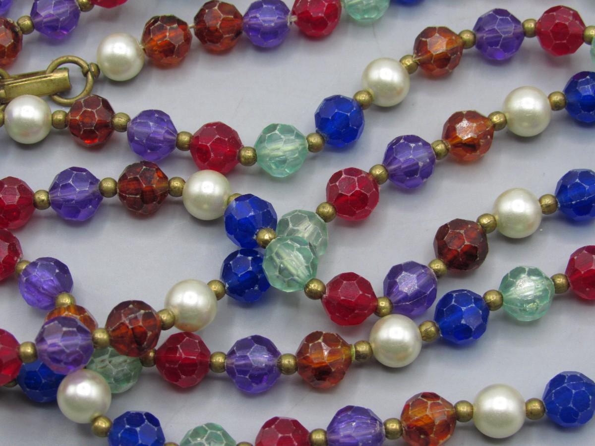 Vintage Extra Long Faceted Plastic Bead and Faux Pearl Beaded Necklace. In vintage condition.