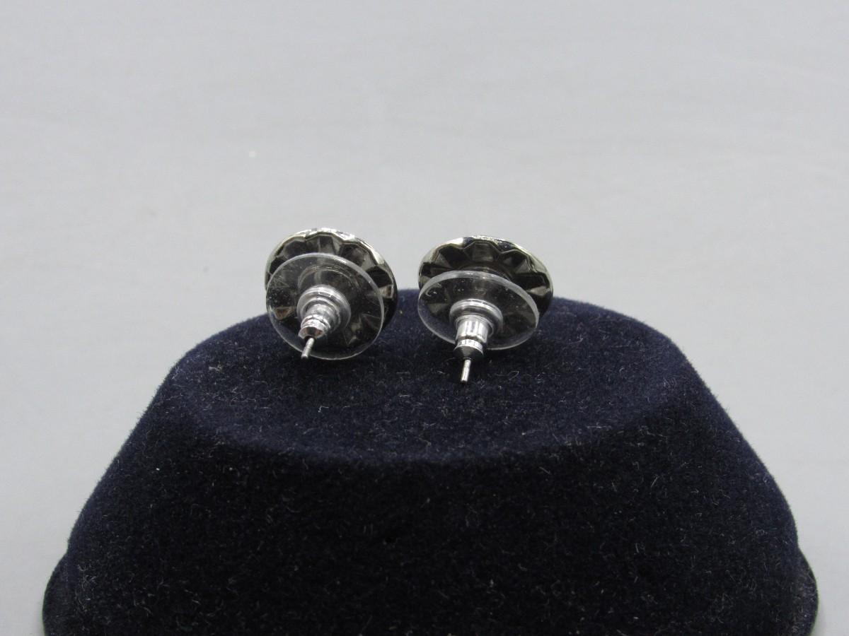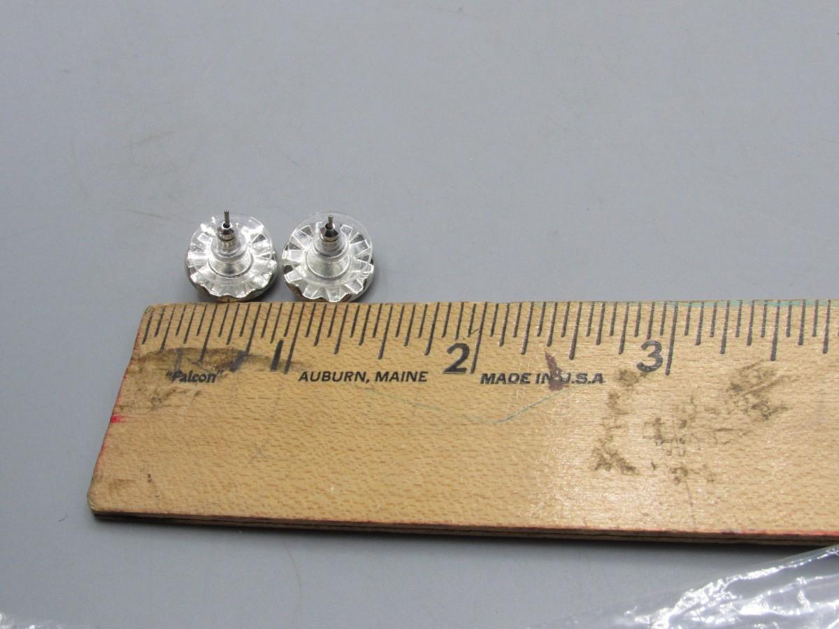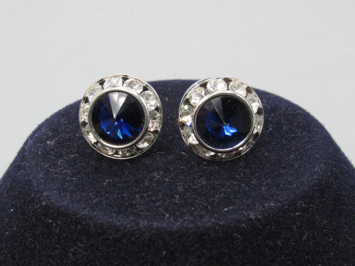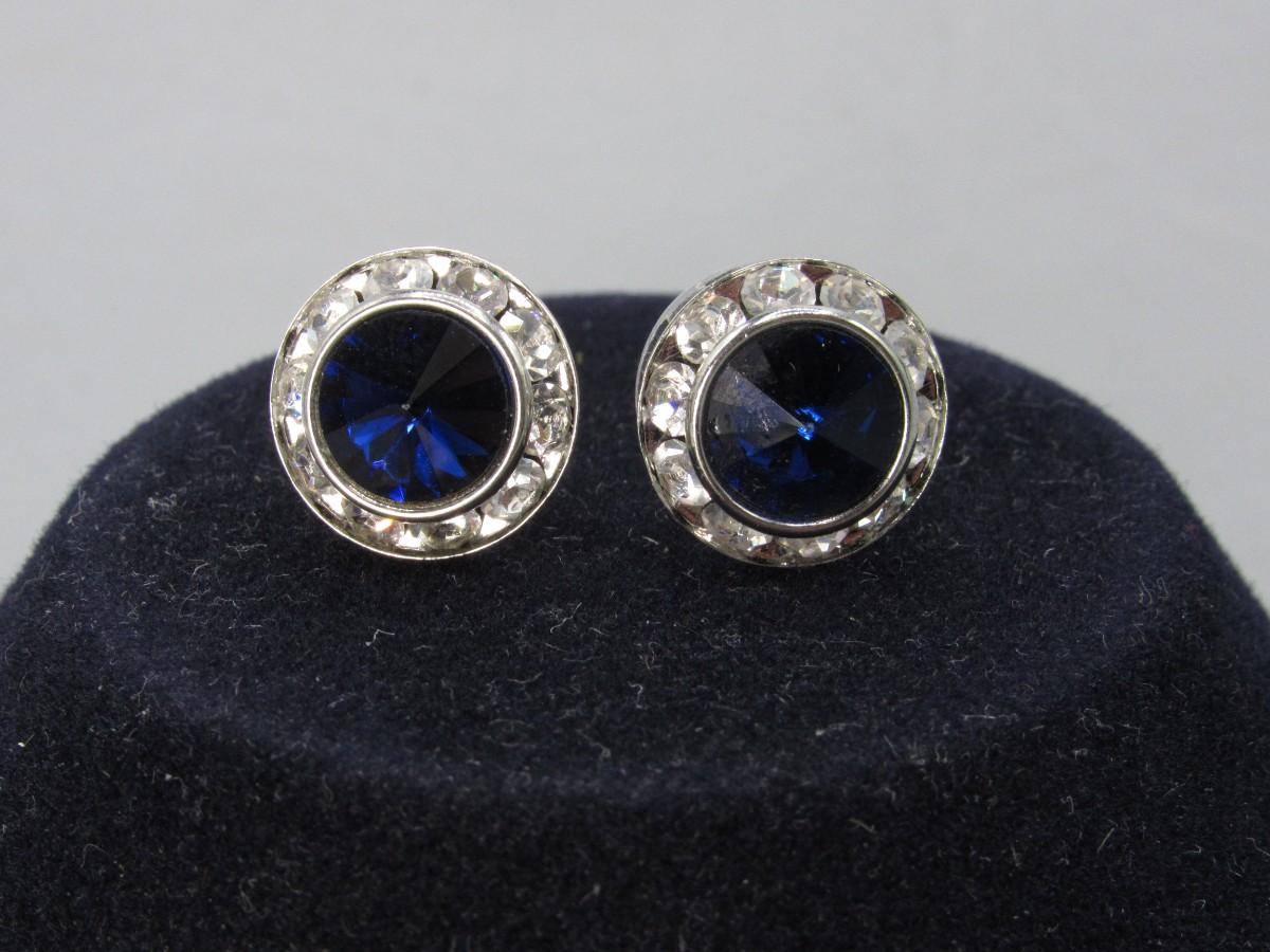 Pair of Blue Rhinestone Button Earrings with CZ Clear Rhinestone Halo in Silver Tone Setting. in good condition. Great deep blue color.