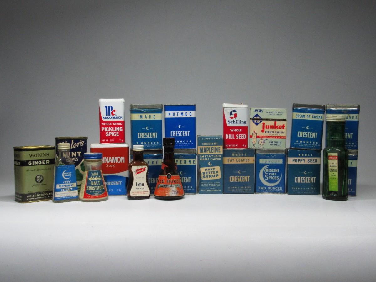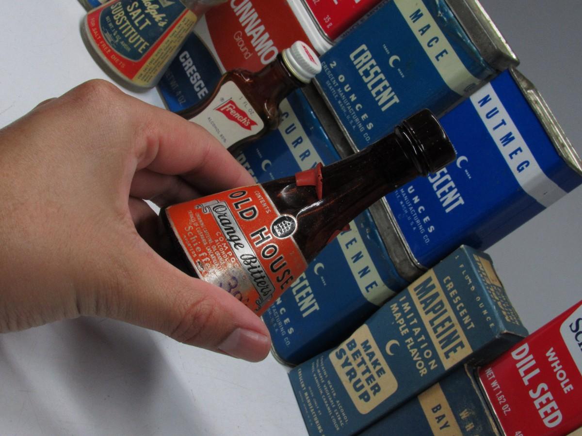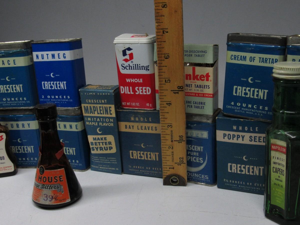 Vintage Retro Lot of Tin Glass Bottles Kitchen Ingredients Peppermint Extract, Dill Seed, & More
