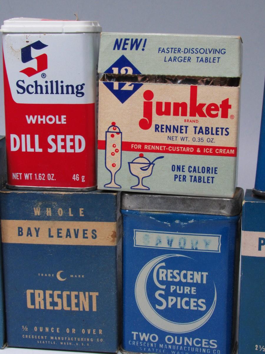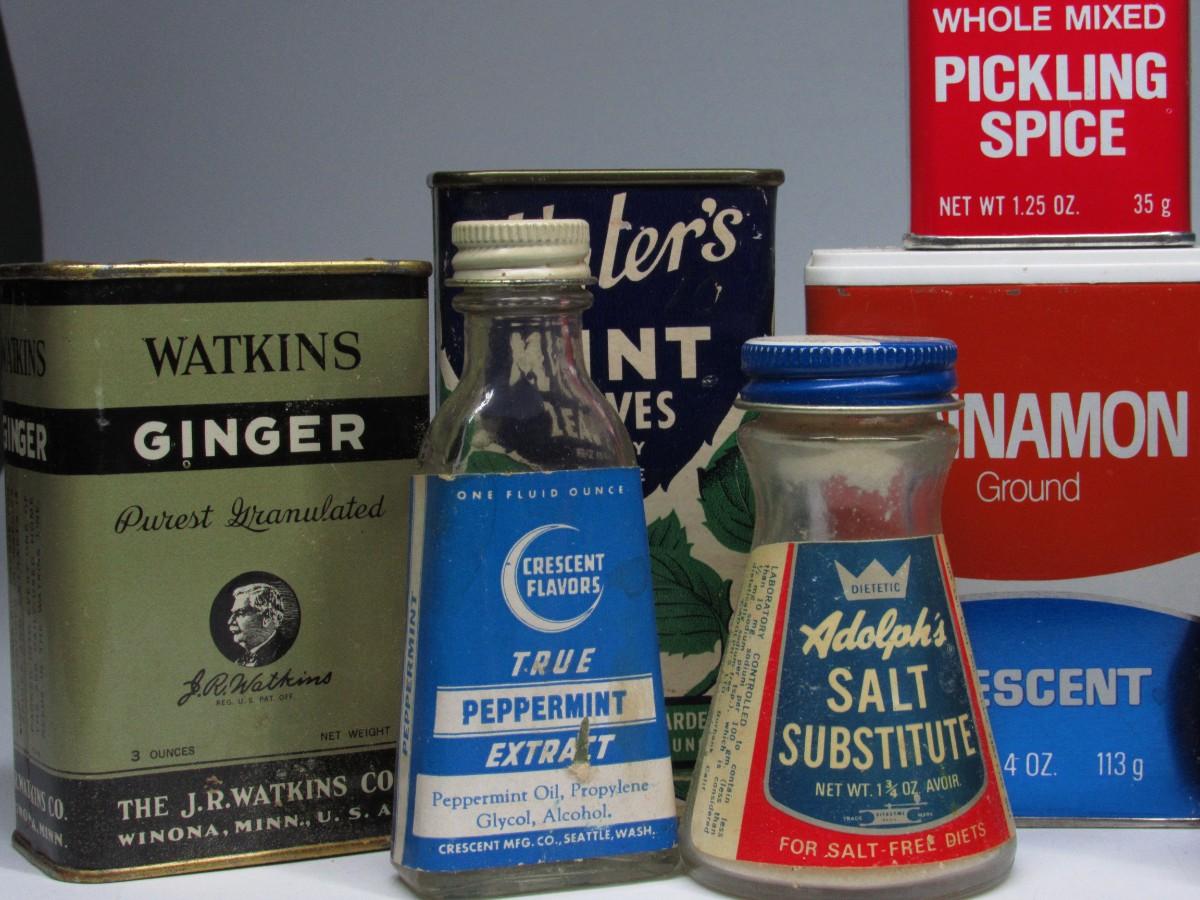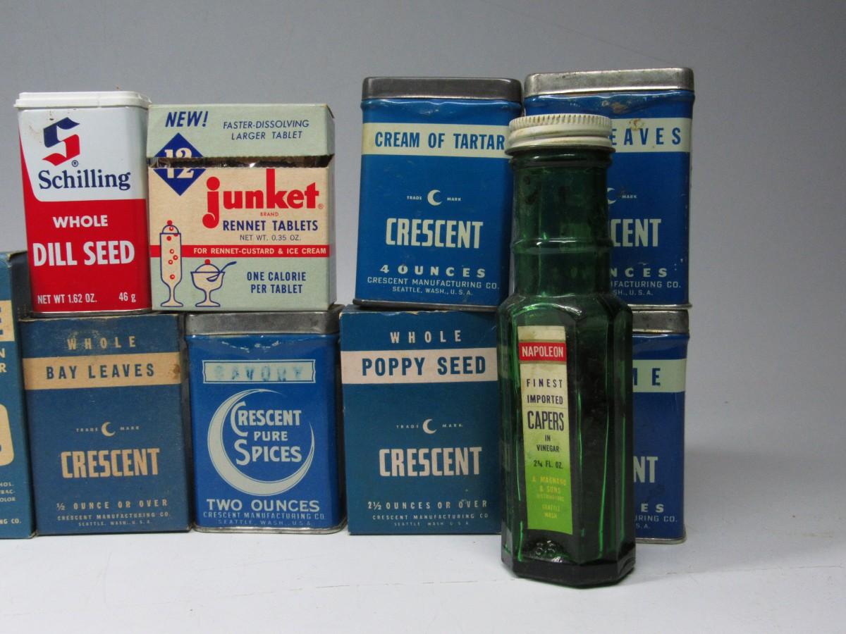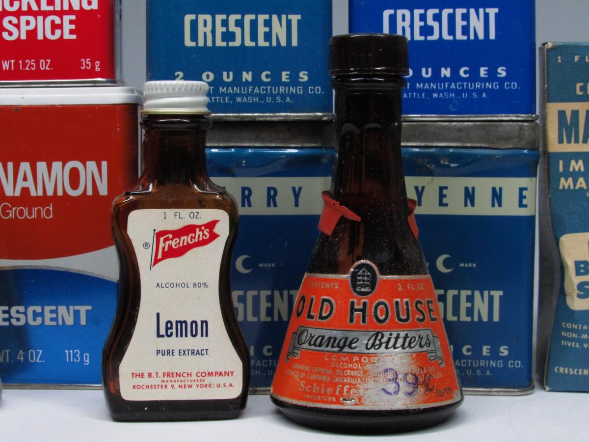 Vintage Retro Lot of Tin Glass Bottles Kitchen Ingredients Peppermint Extract, Dill Seed, & More