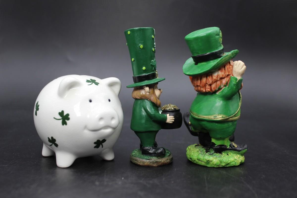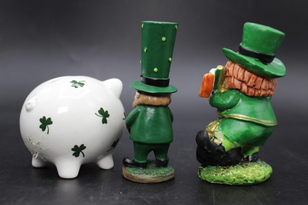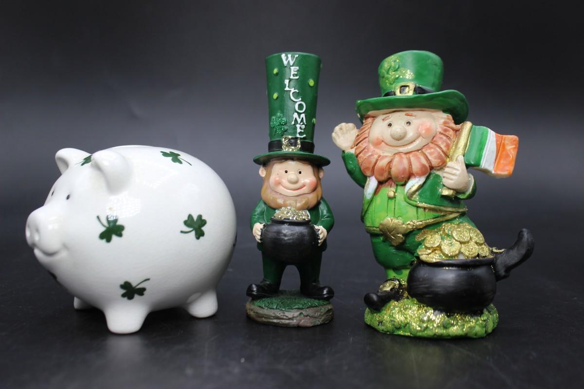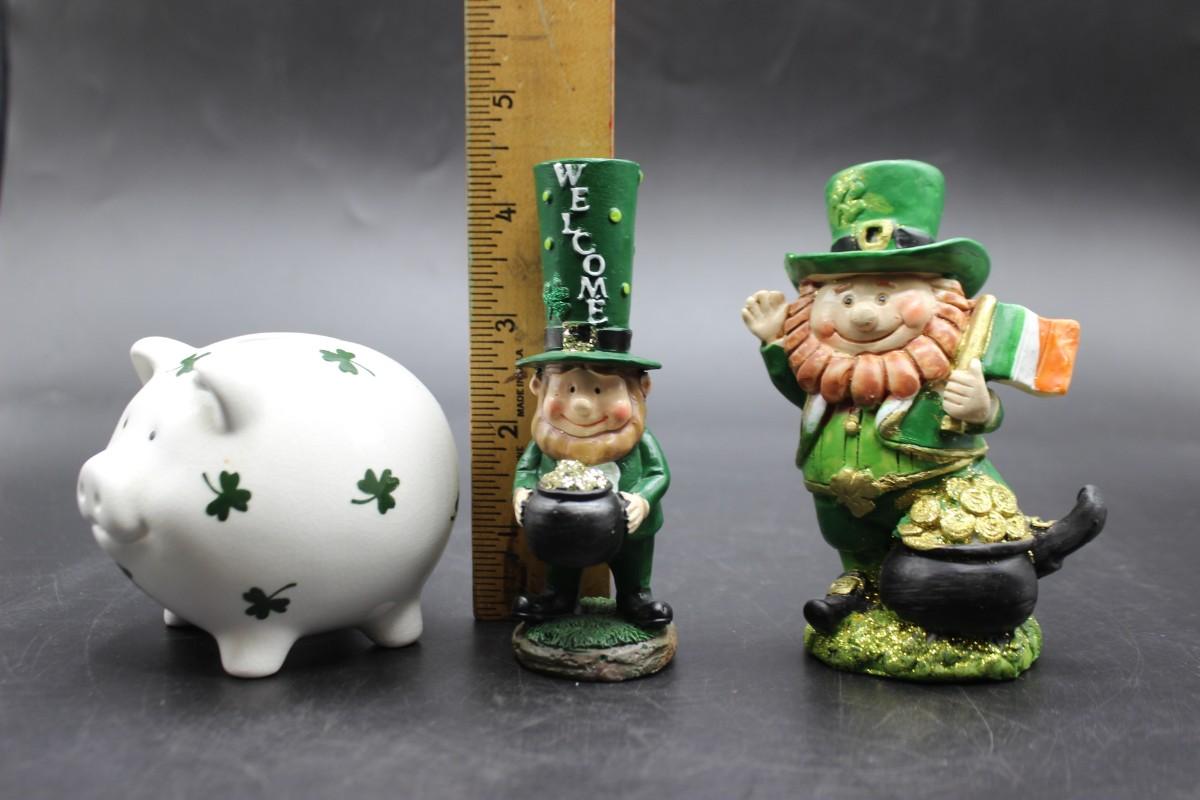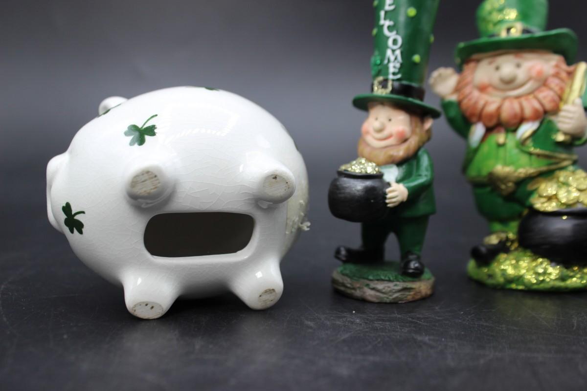 Lot of St. Patrick's Day Leprechaun Pot of Gold Figurines & Shamrock Piggy Bank