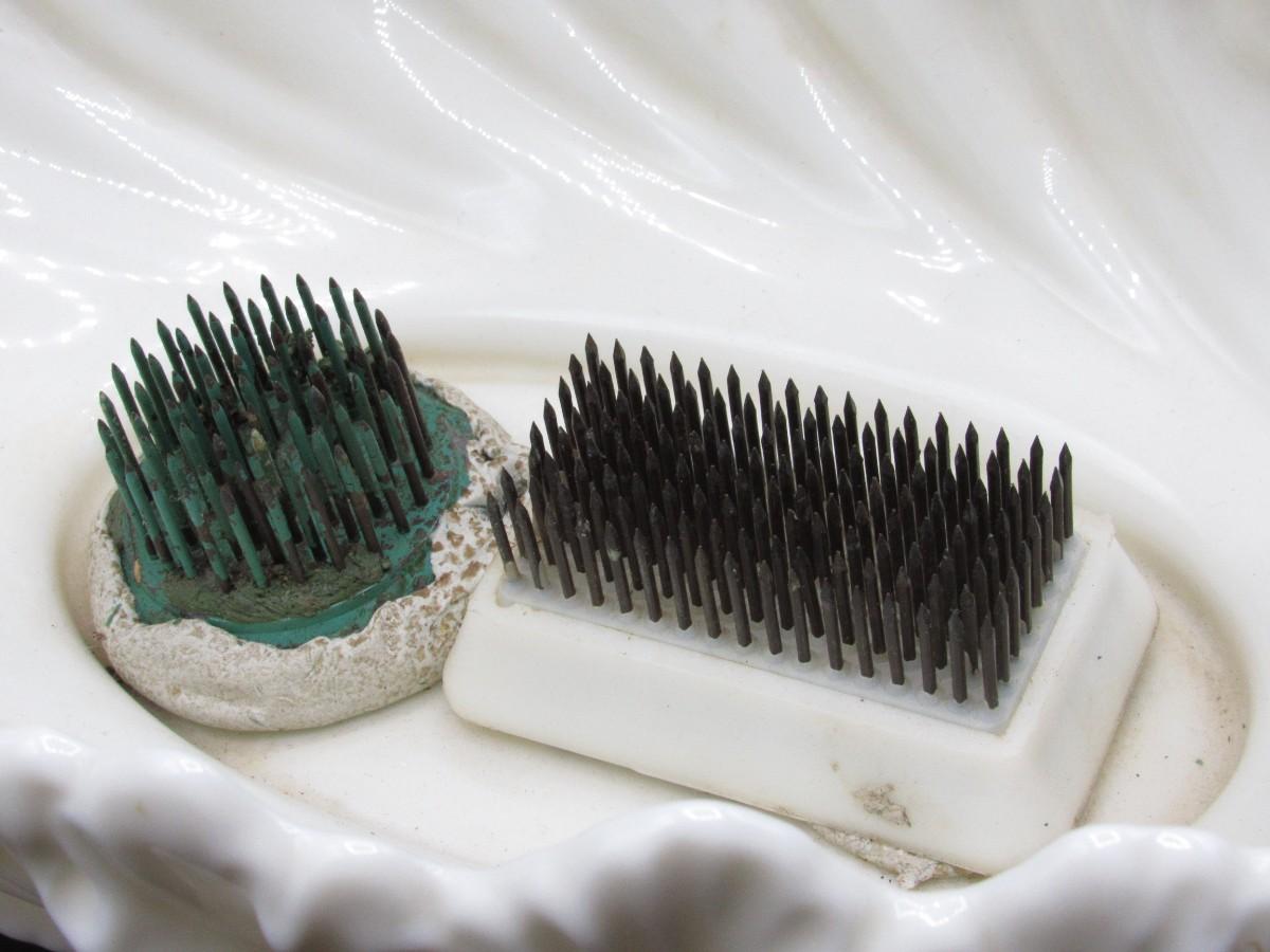 There is a pair of flower frogs that is attached to the bowl. Can possibly be removed, but needs to some work, check pictures for more details and sizing! Overall good condition.