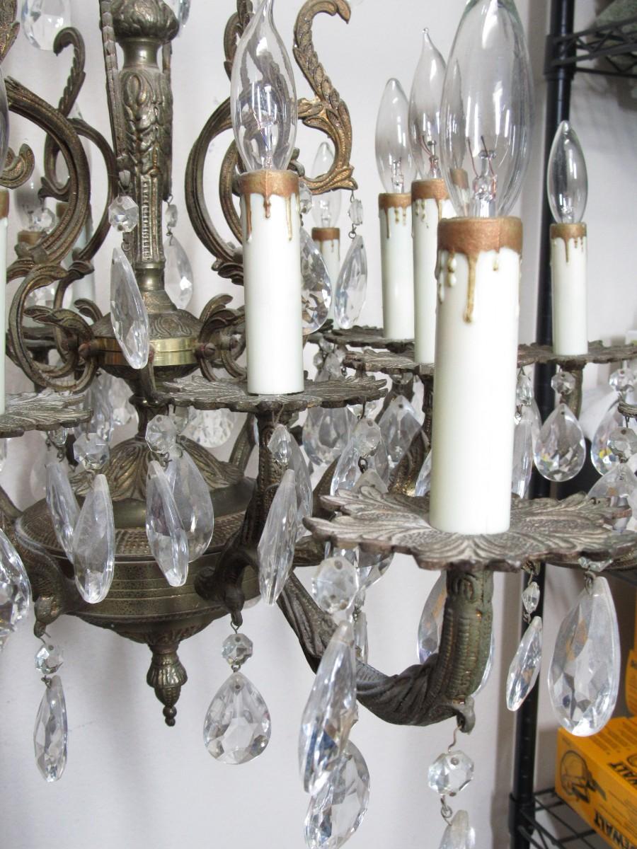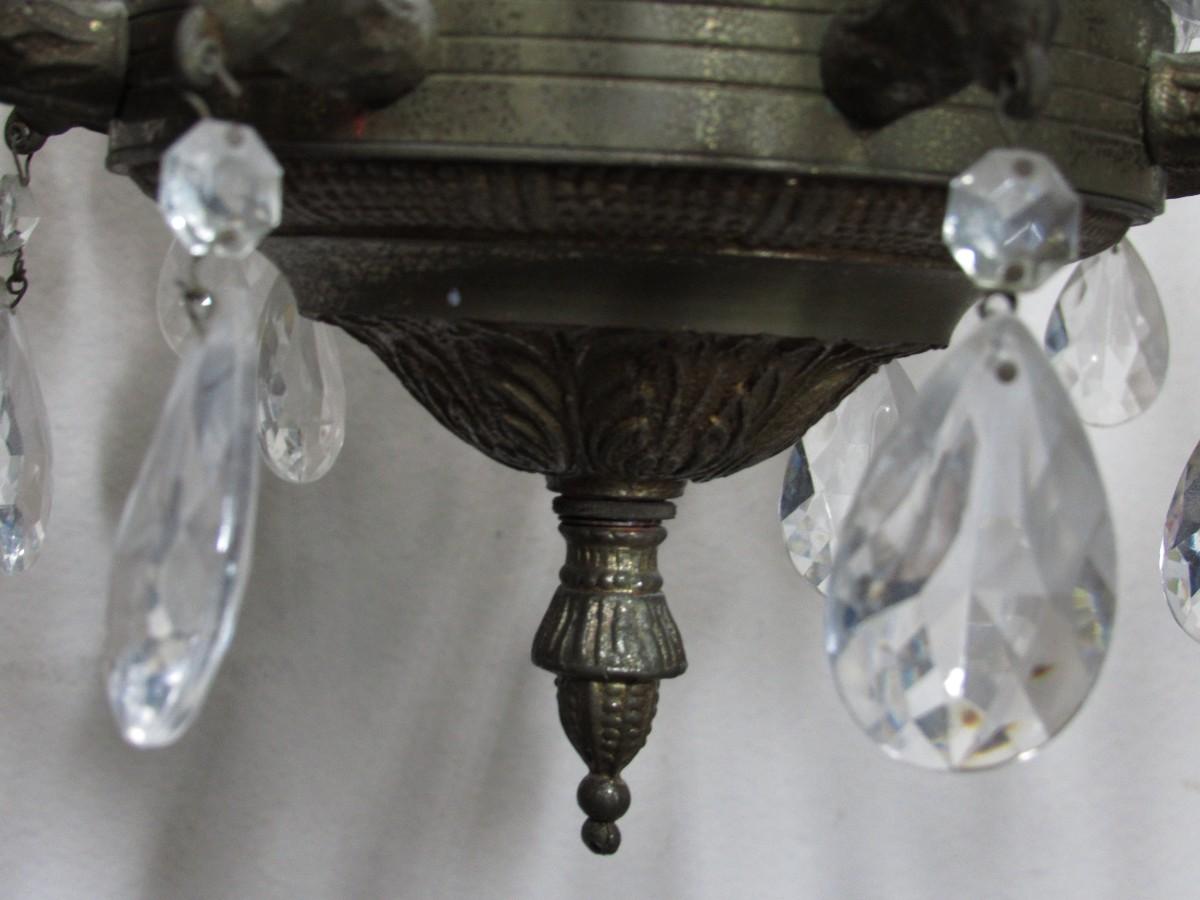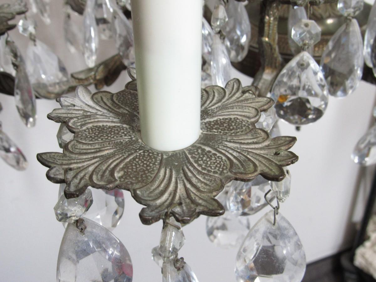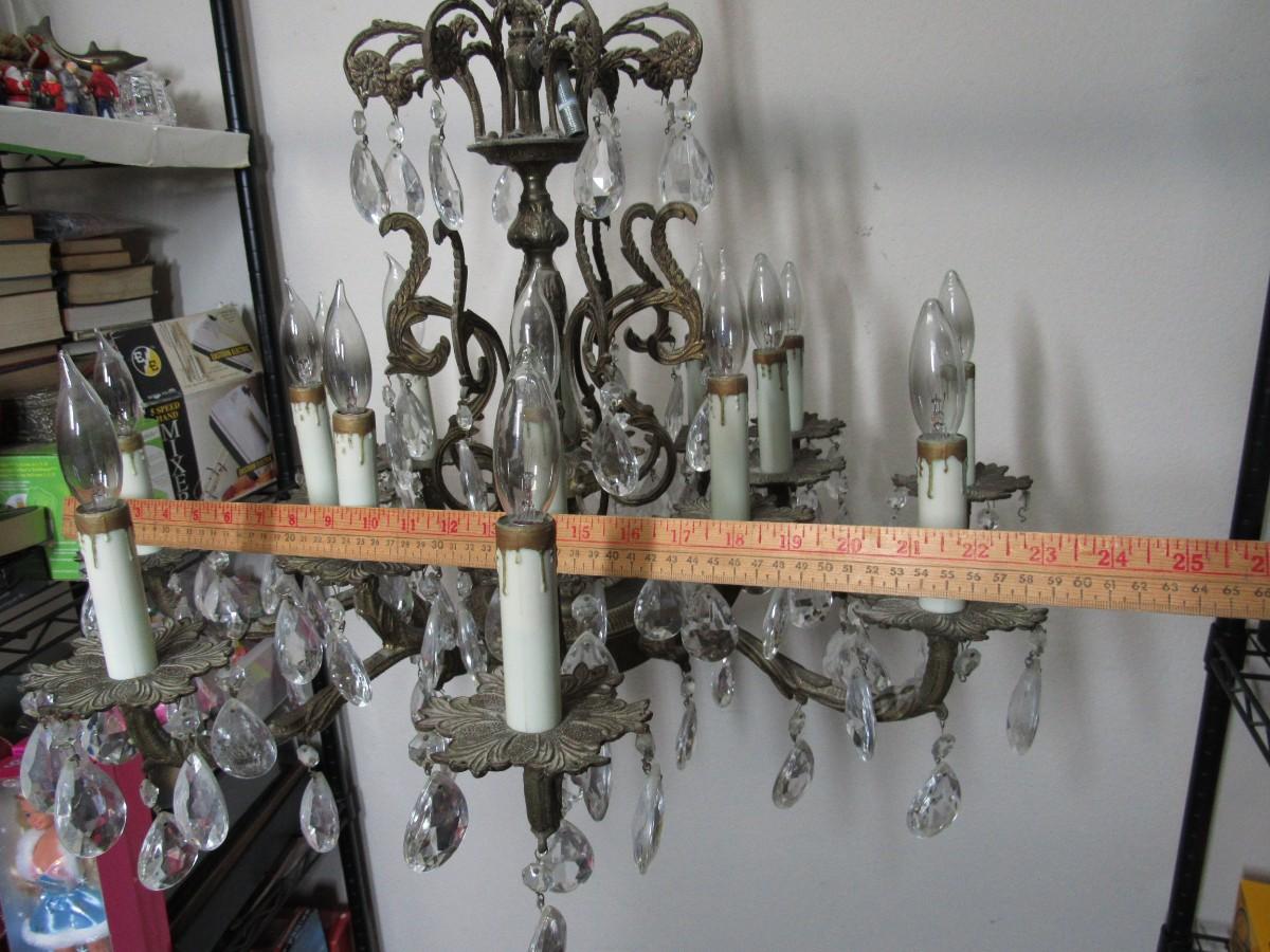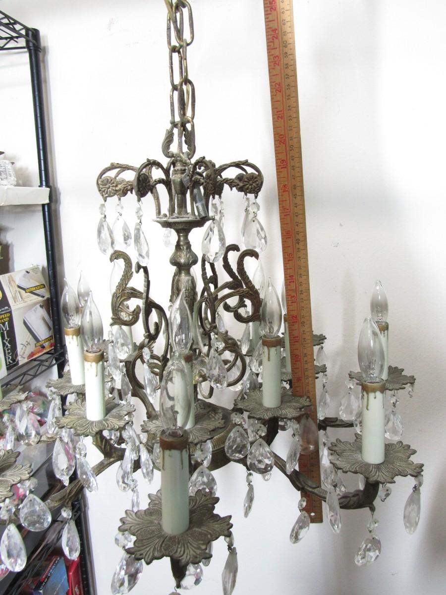 Vintage Art Deco Mid Century Hanging Brass & Crystal Glass Light Bulb Candlestick Chandelier
