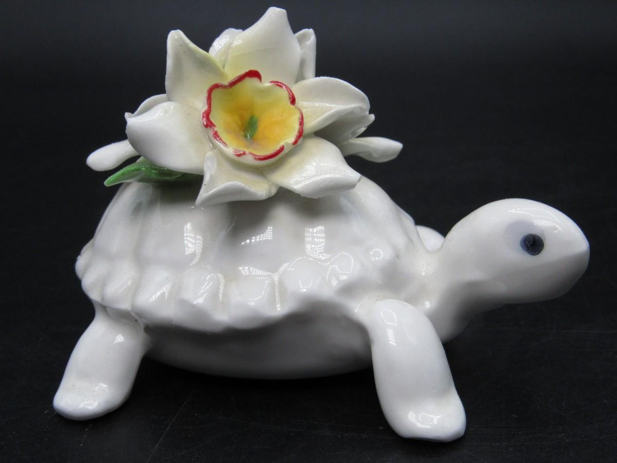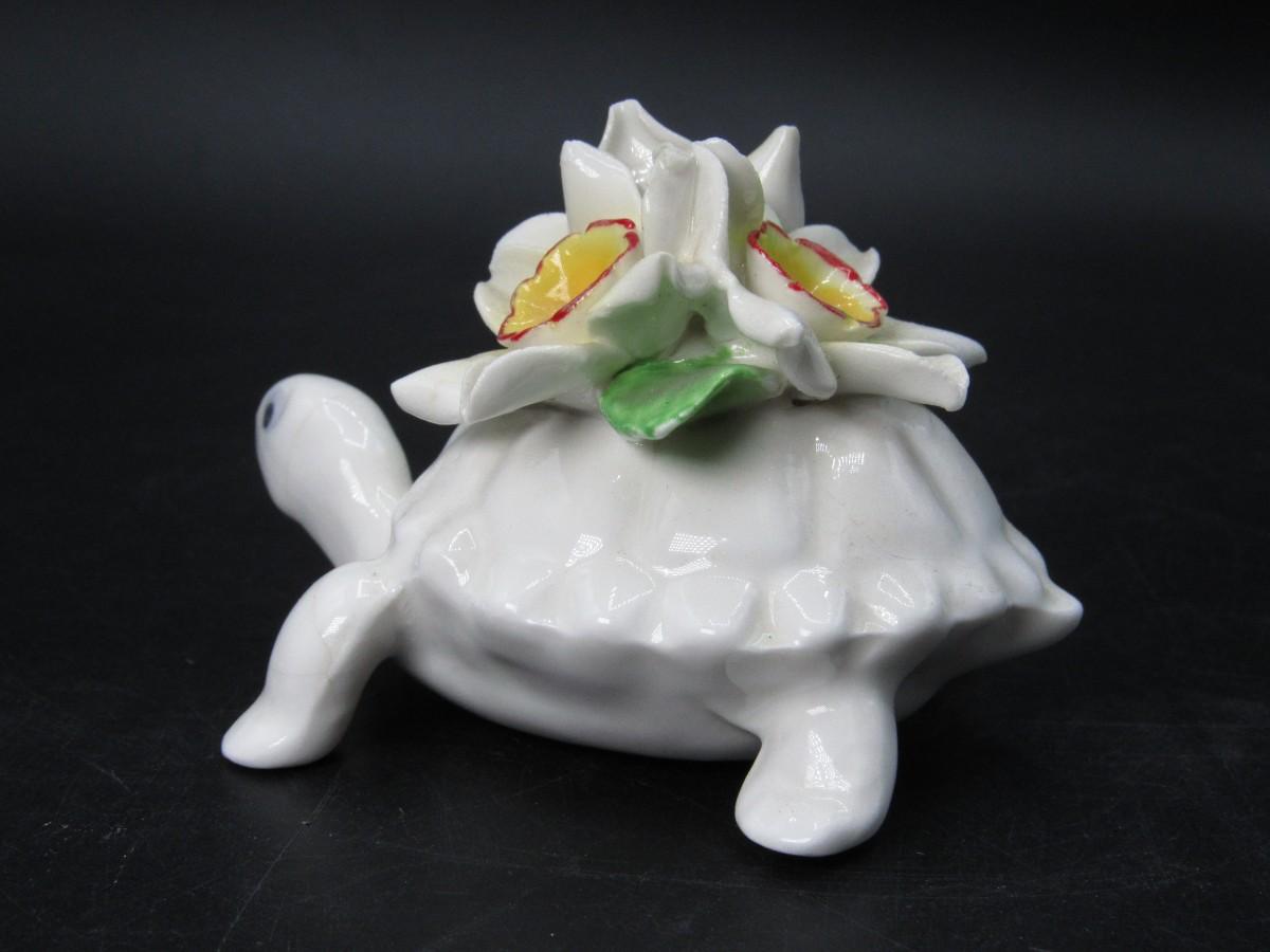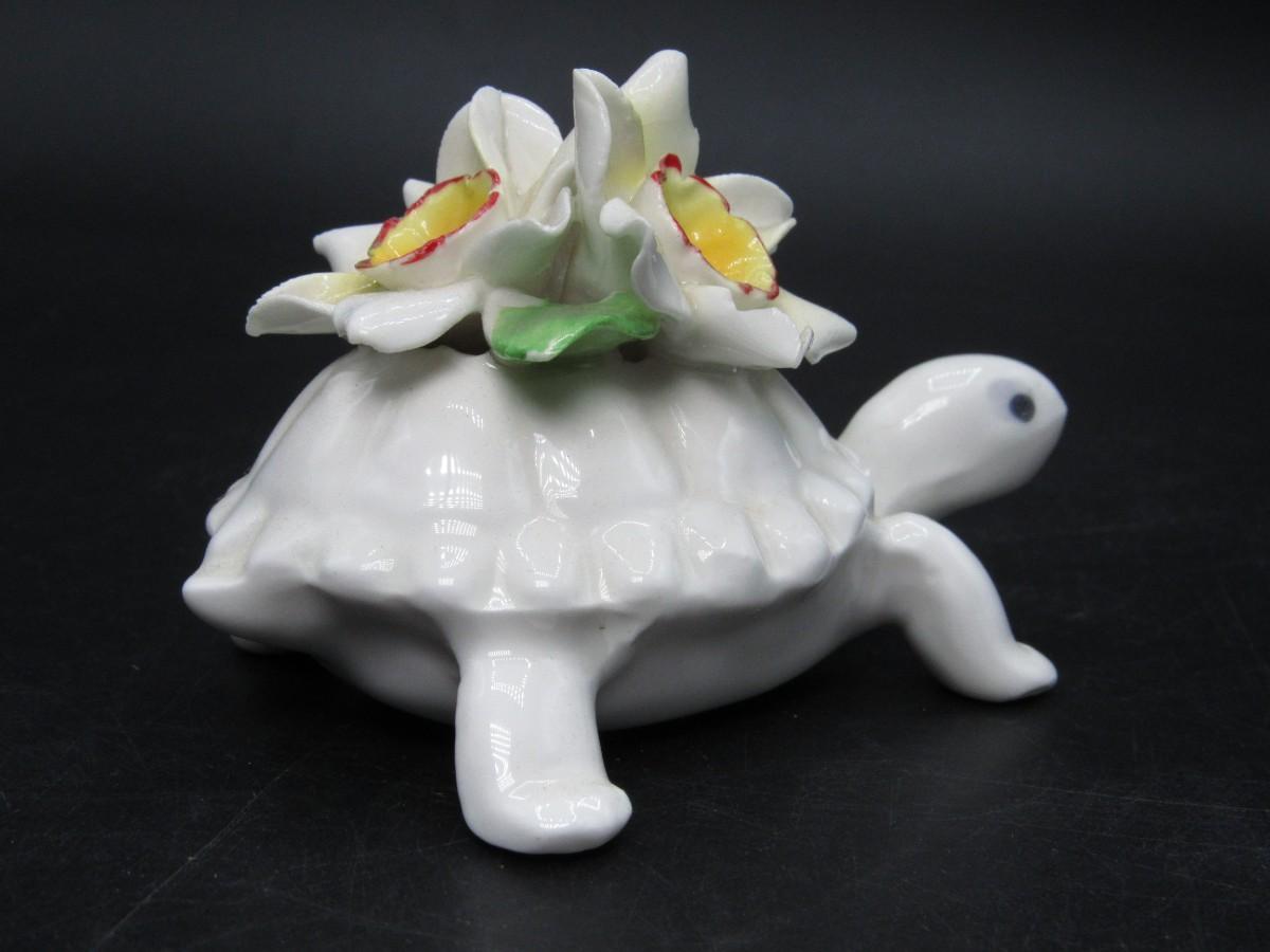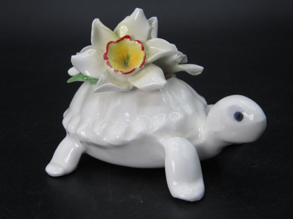 Raybur Bone China Staffordshire Turtle Figurine. Has flower on top of shell. Great condition, no visible damage. Approx. 4" long, 3" tall.