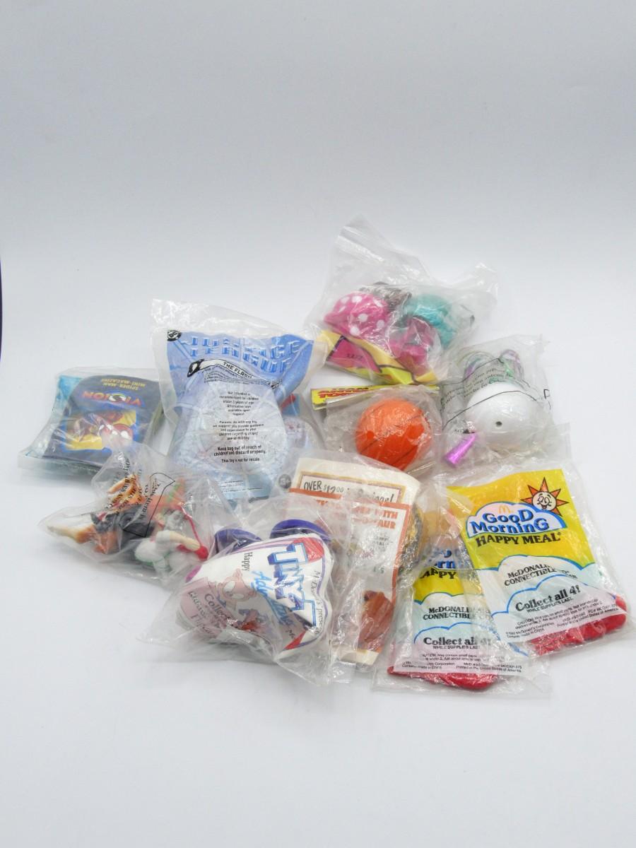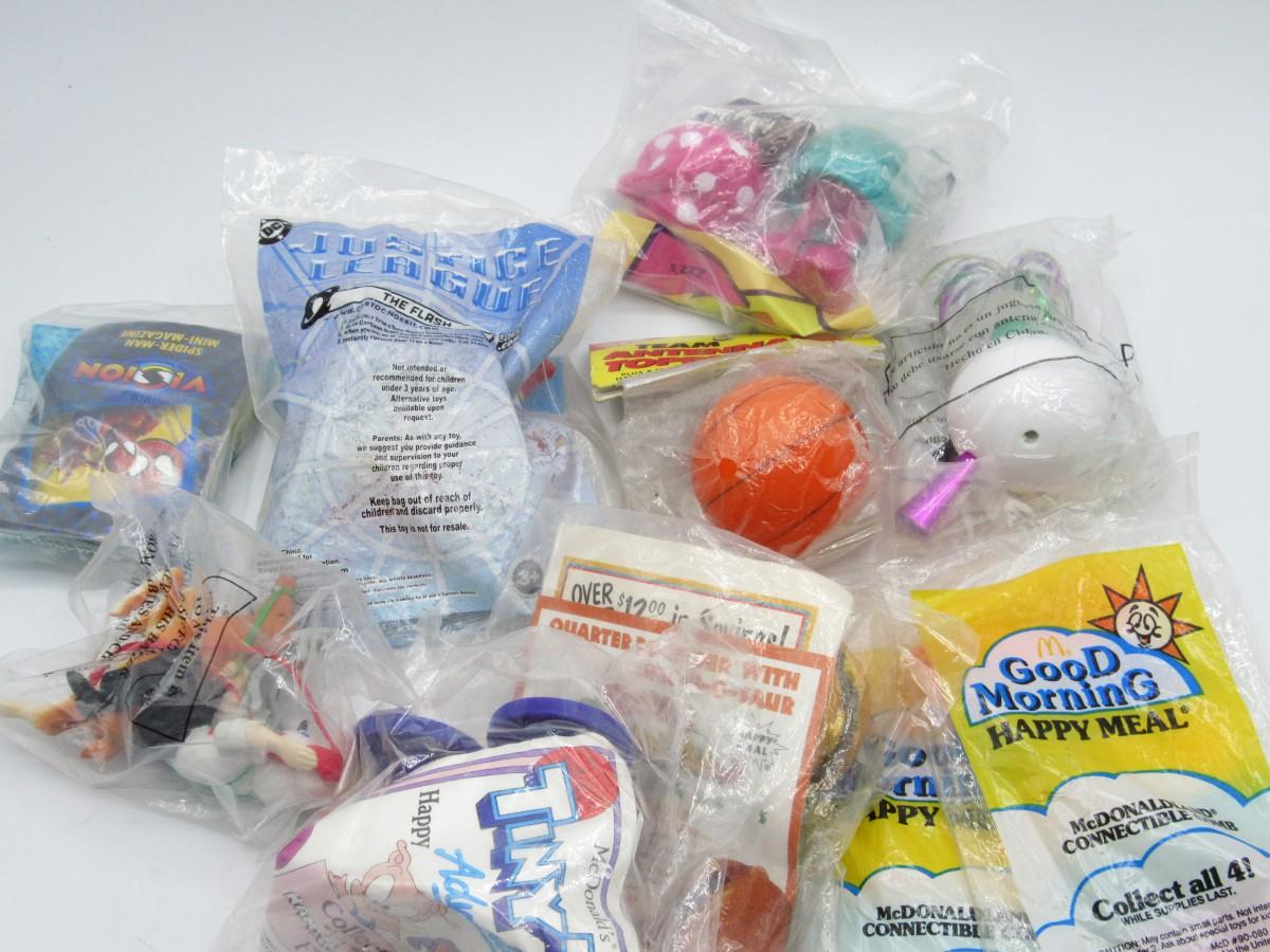 Lot of Various Happy Meal Type toy in packages. 10+ pcs. Sealed in original plastic bags. Official NBA Los Angeles Lakers Team Antenna Basketball Topper, Justice League & Marvel Comics Spider-Man Subway Burger King Kids Toys, Jack in the Box 2000 New Years Antenna Topper & Jack Riding Tiny Toons, McDino, & Funny Fry Friends Retro McDonald's Happy Meal Good Morning Happy Meal McDonald Land Connectable Combs Unopened!