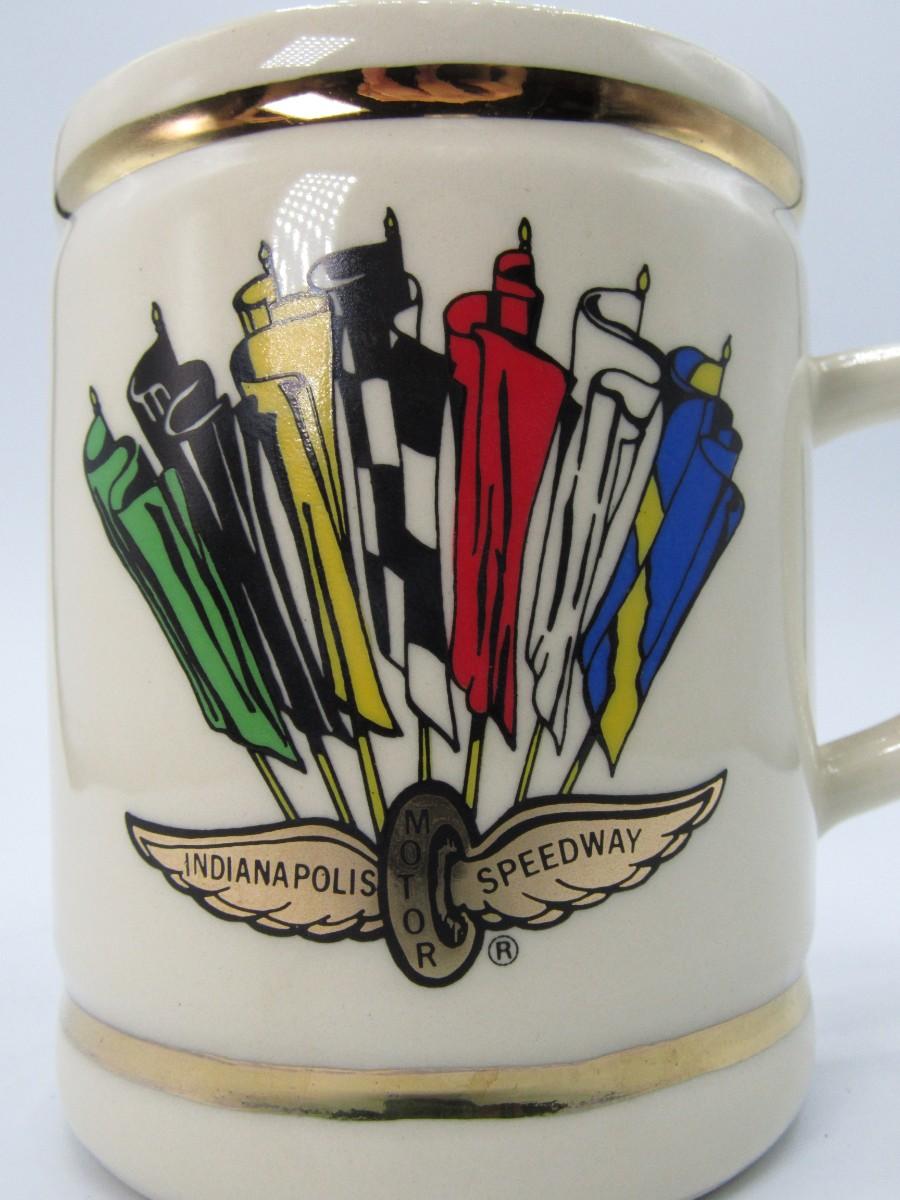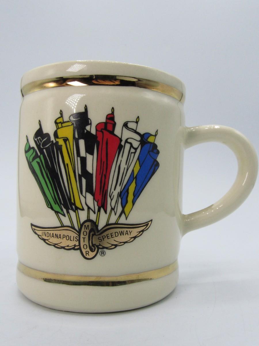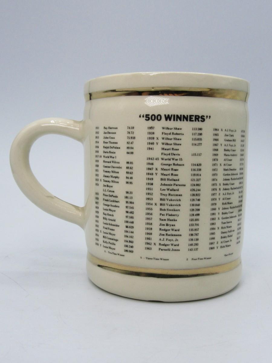 Indy 500 Collectible Winners Ceramic Mug. Indianapolis Motor Speedway "winged tire" logo with colorful flags on front, list of race winners on back for years 1911-1988. A few marks on bottom edge of mug, see photos for details of condition.