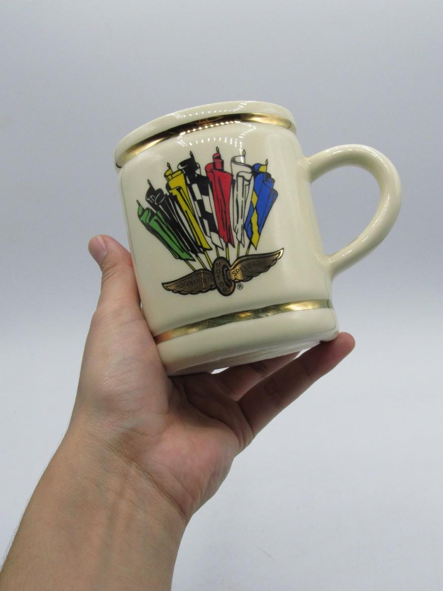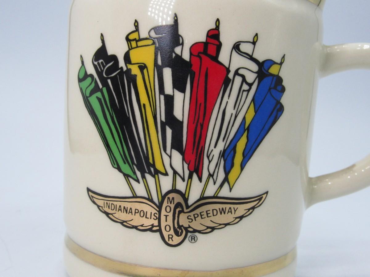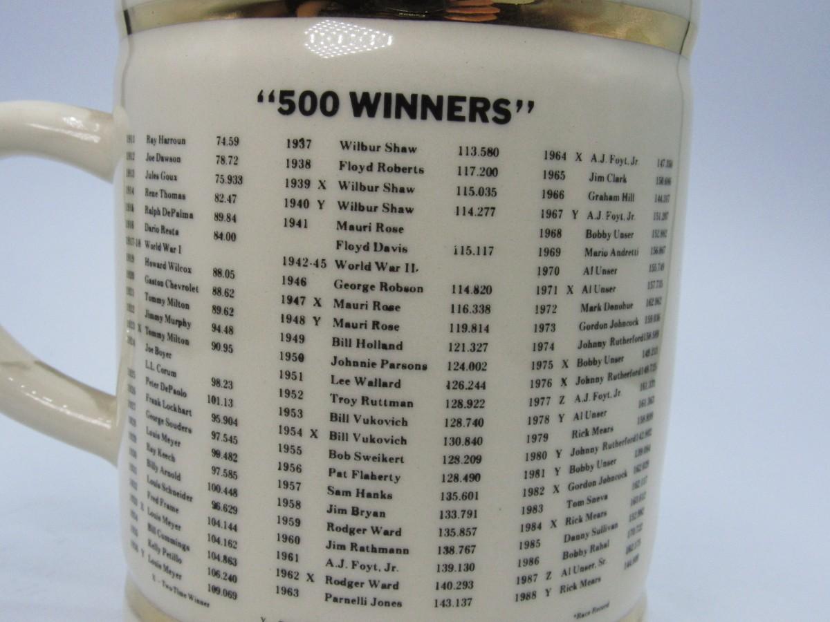 Indy 500 Collectible Winners Ceramic Mug. Indianapolis Motor Speedway "winged tire" logo with colorful flags on front, list of race winners on back for years 1911-1988. A few marks on bottom edge of mug, see photos for details of condition.