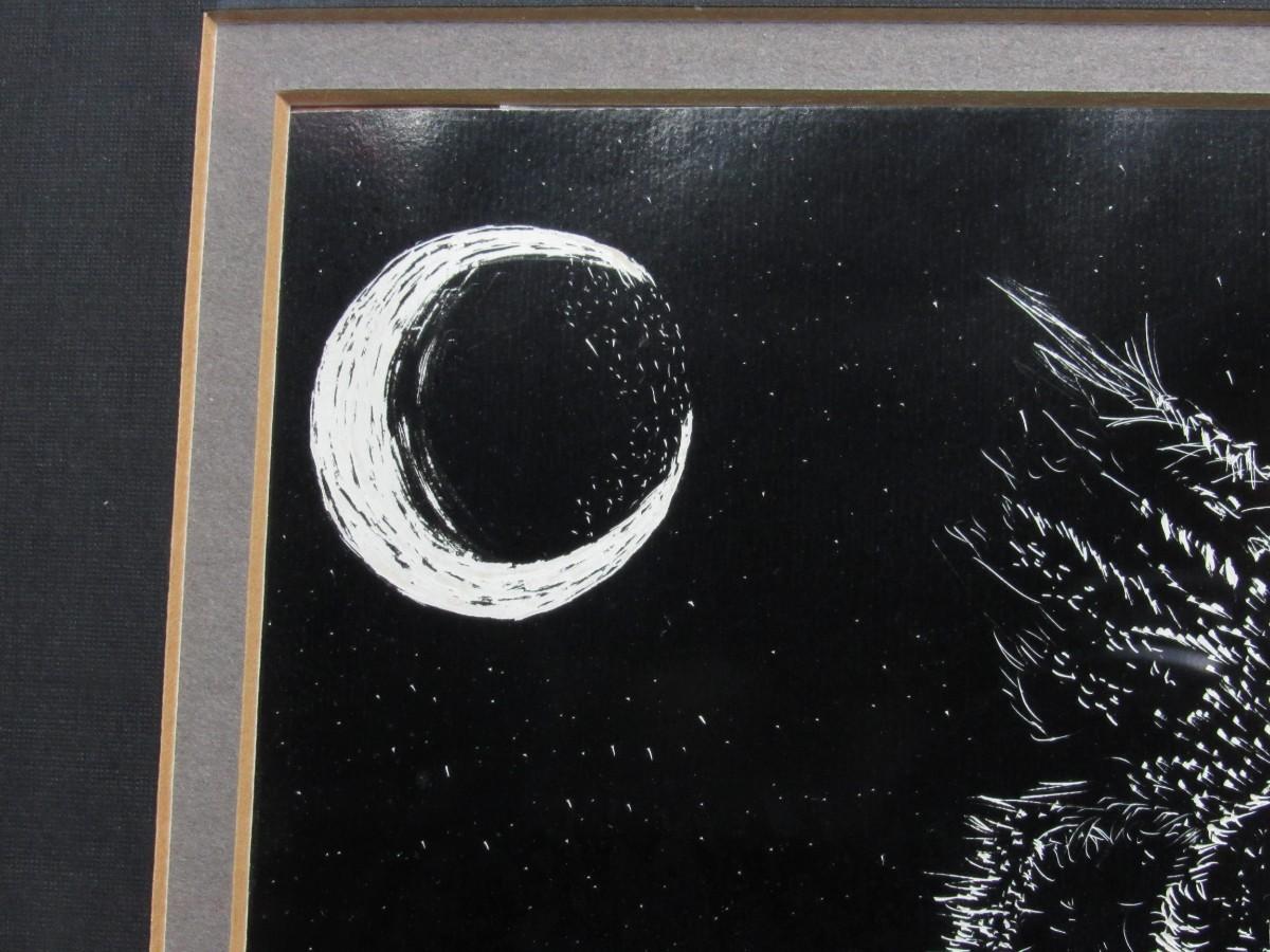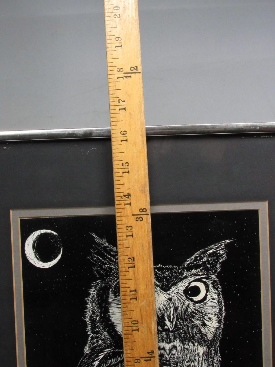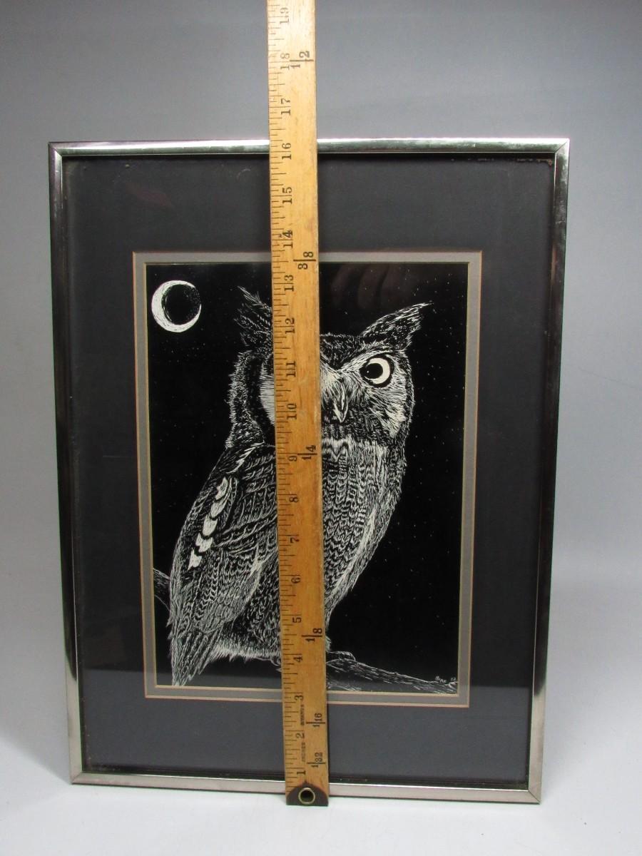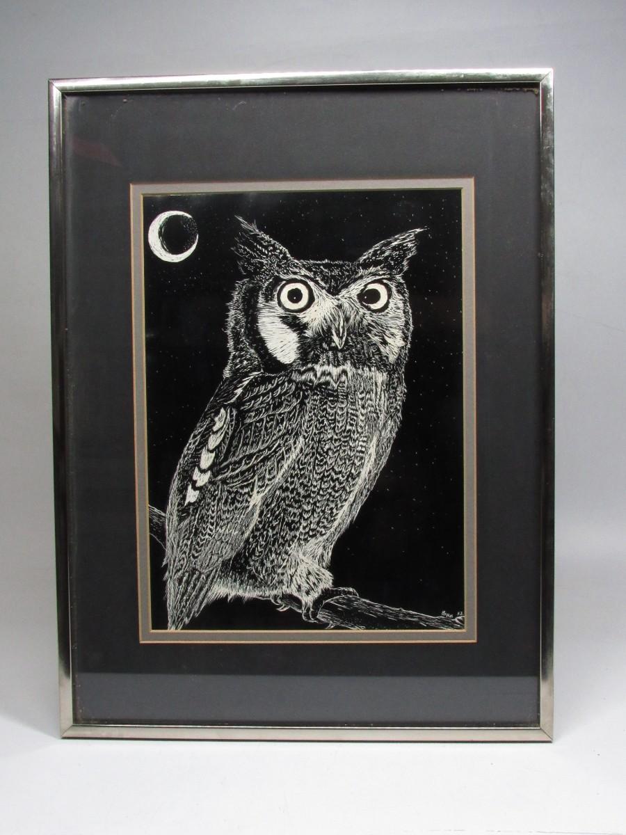 Framed Vintage Etch Board Art of Wild Owl with Moon