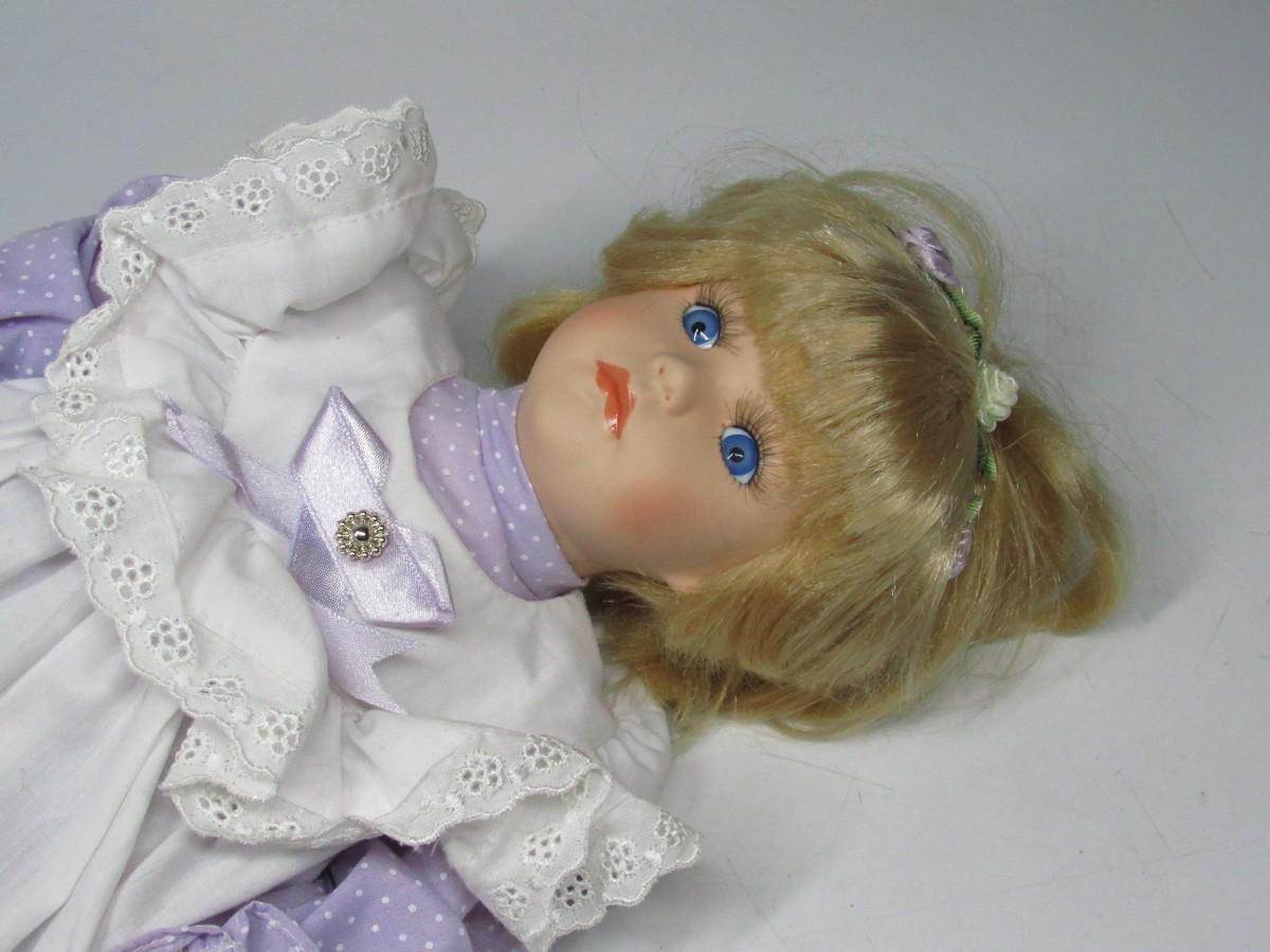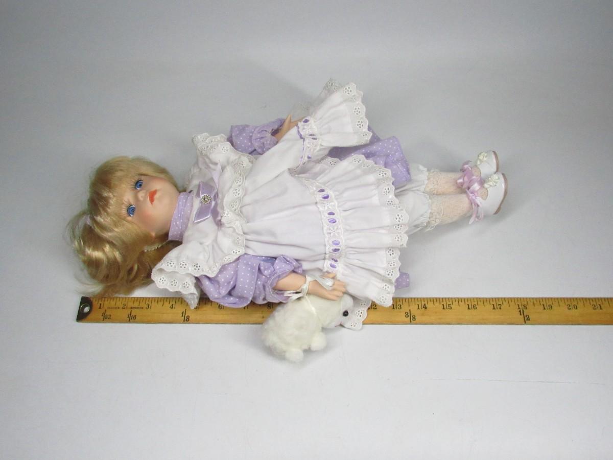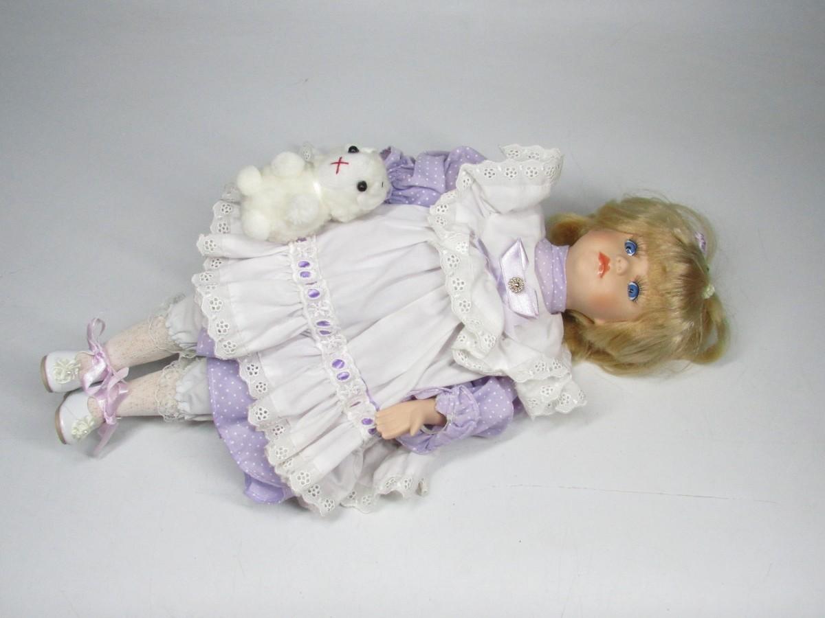 Retro Brinn's Dolls Little Girl in Purple Dress Carrying Lamb Stuffed Animal