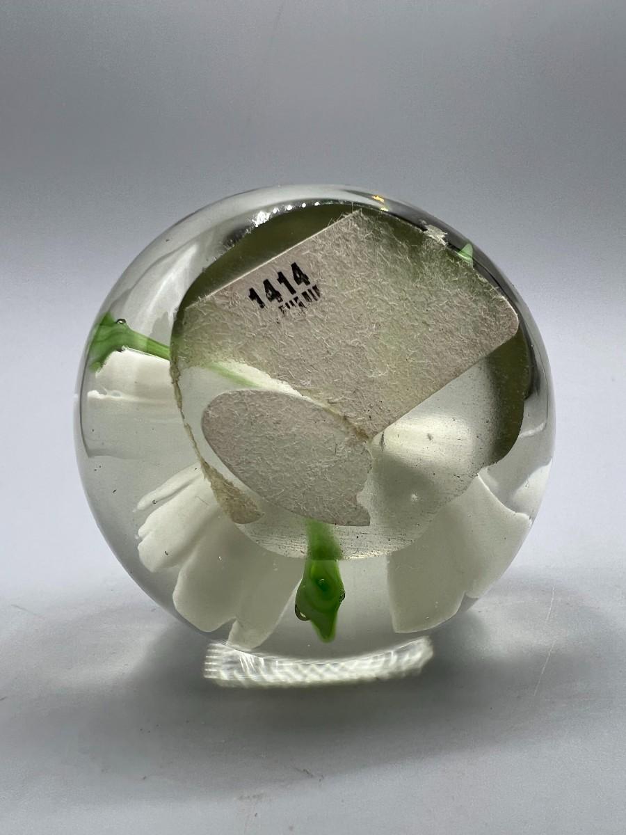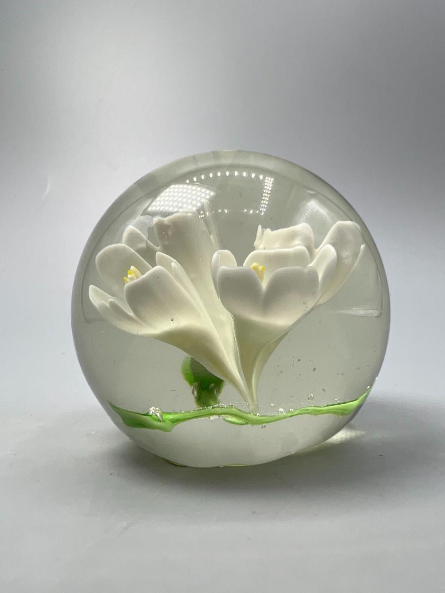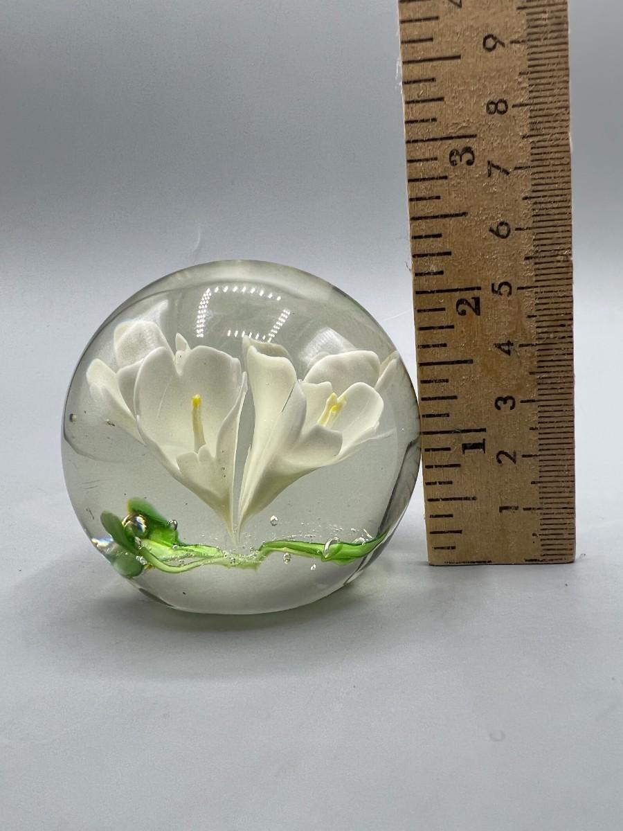 Small Retro Art Glass Round Globe White Flower Paper Weight