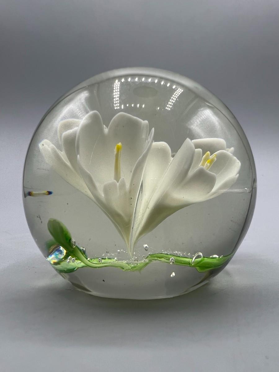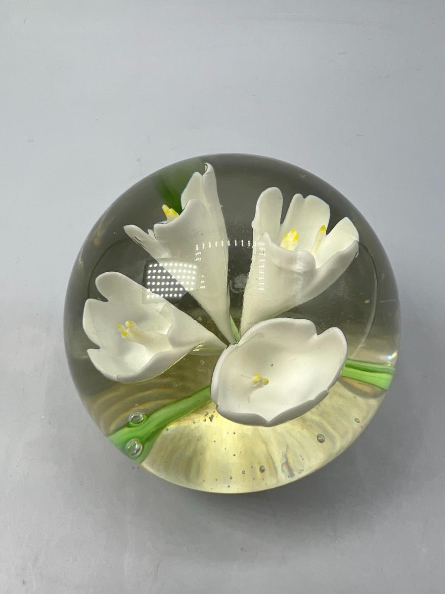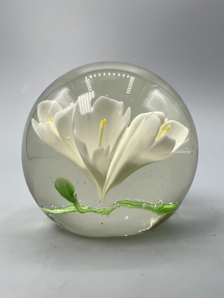 Small Retro Art Glass Round Globe White Flower Paper Weight