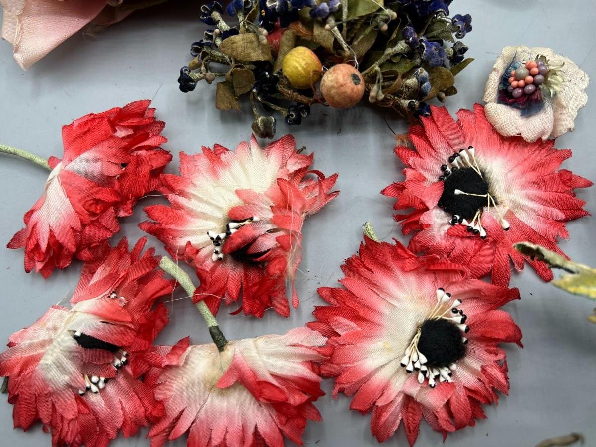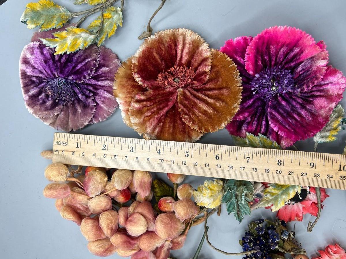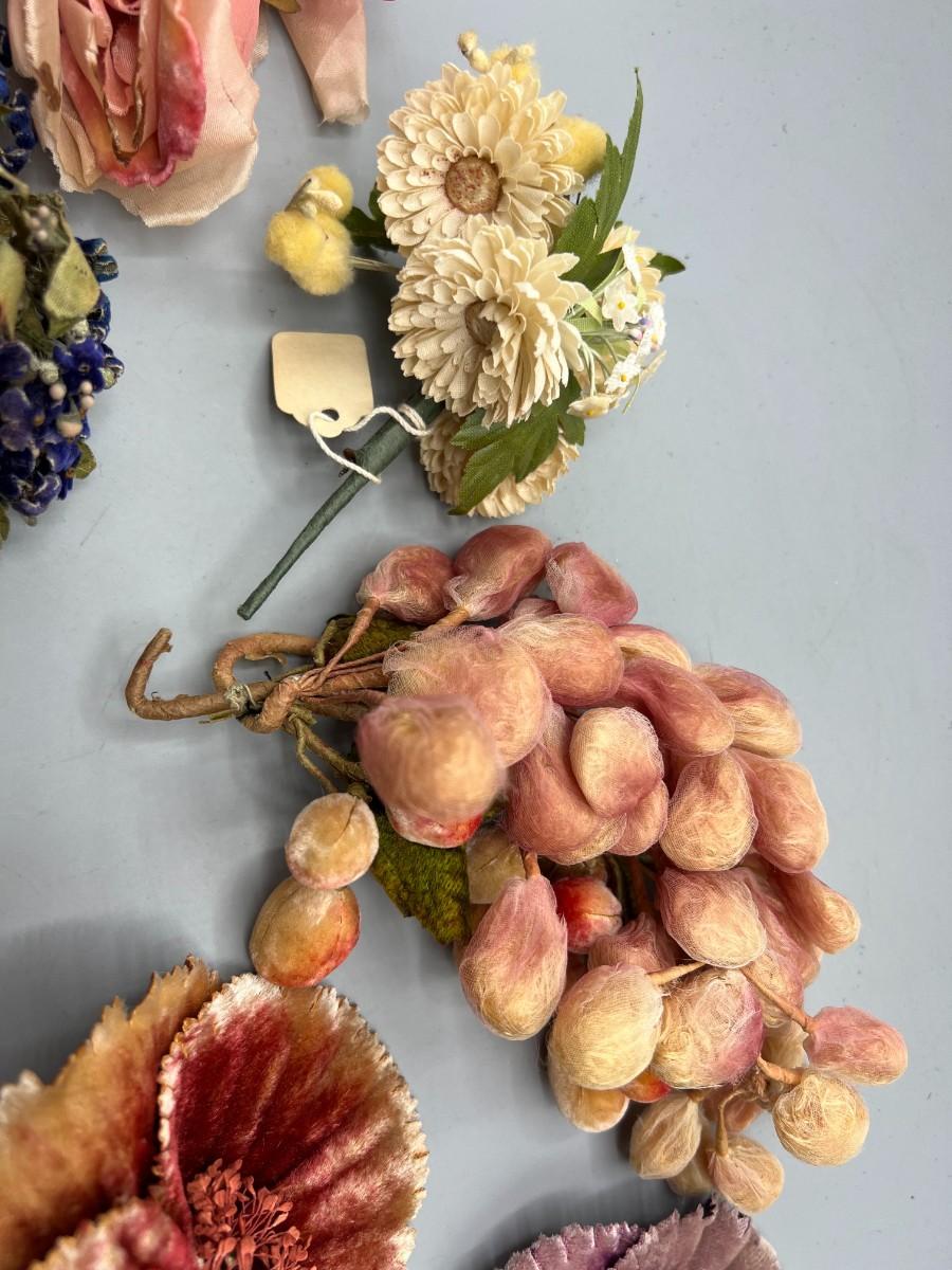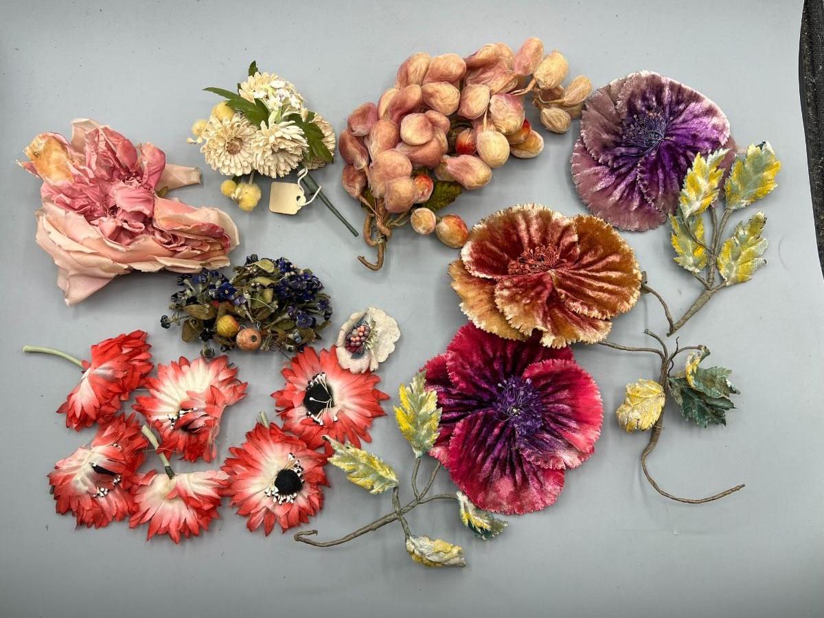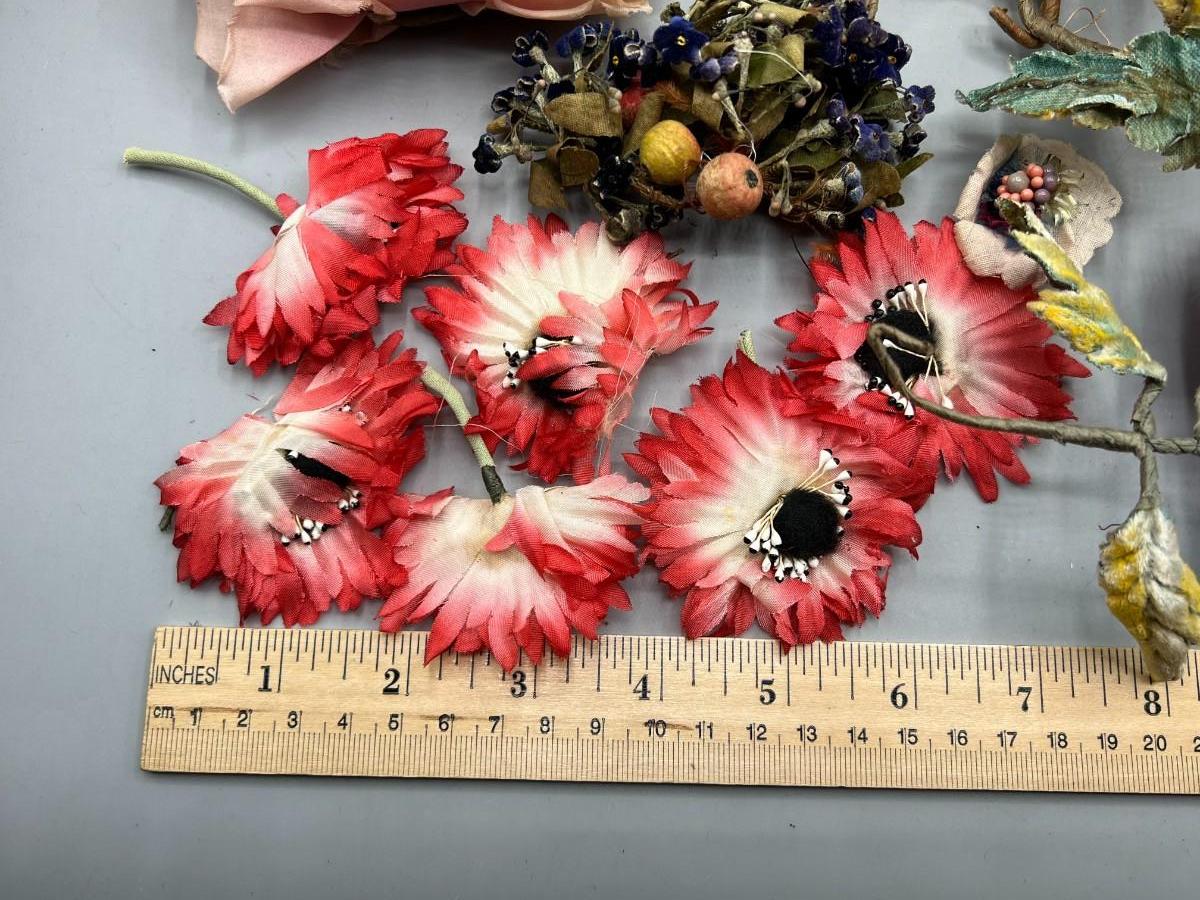 Lot of Vintage Victorian Colorful Fabric Faux Flower Fruit Accessory Hat & Dress Pieces