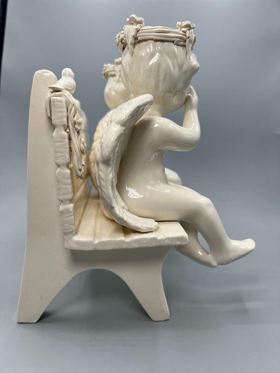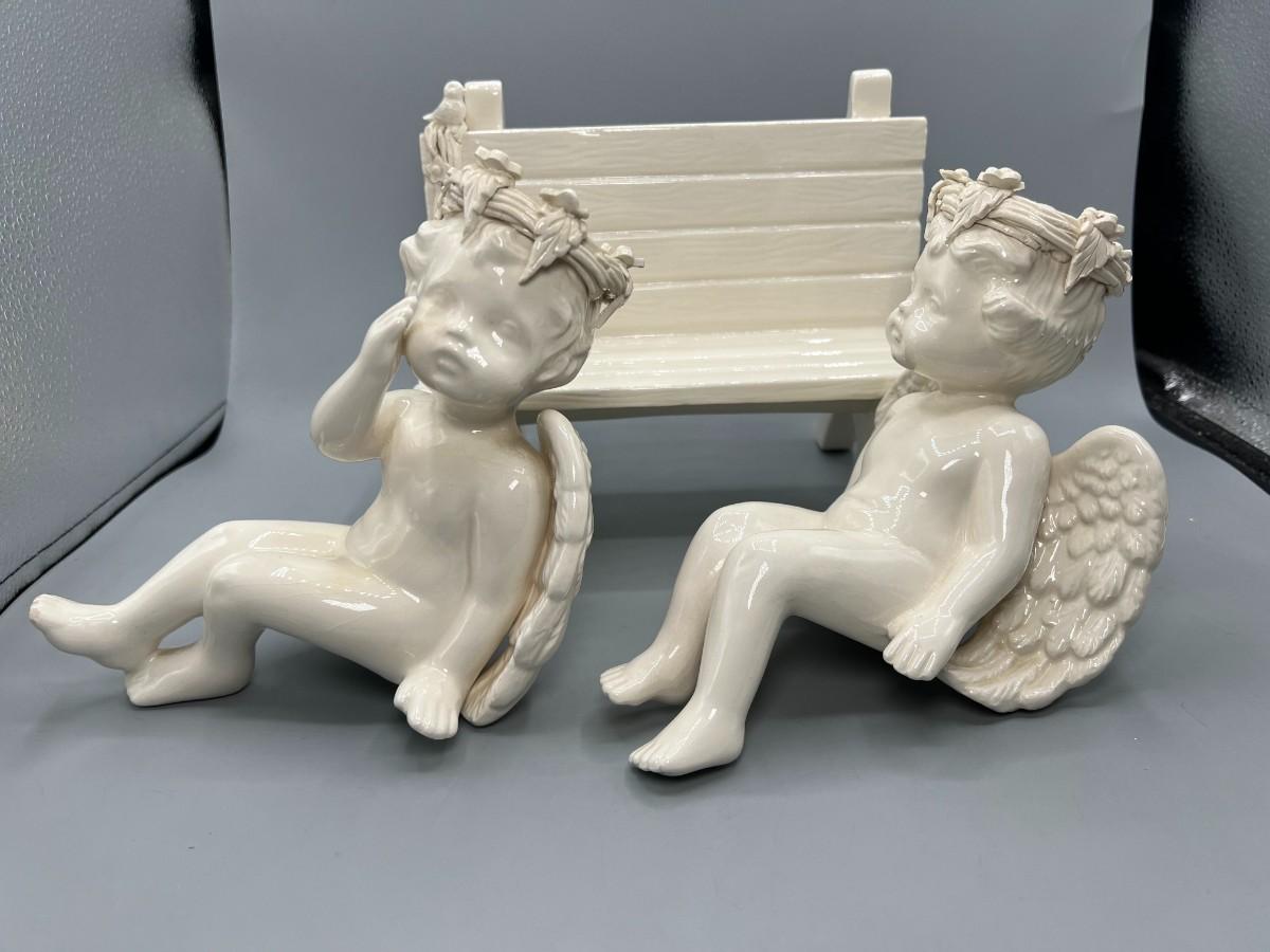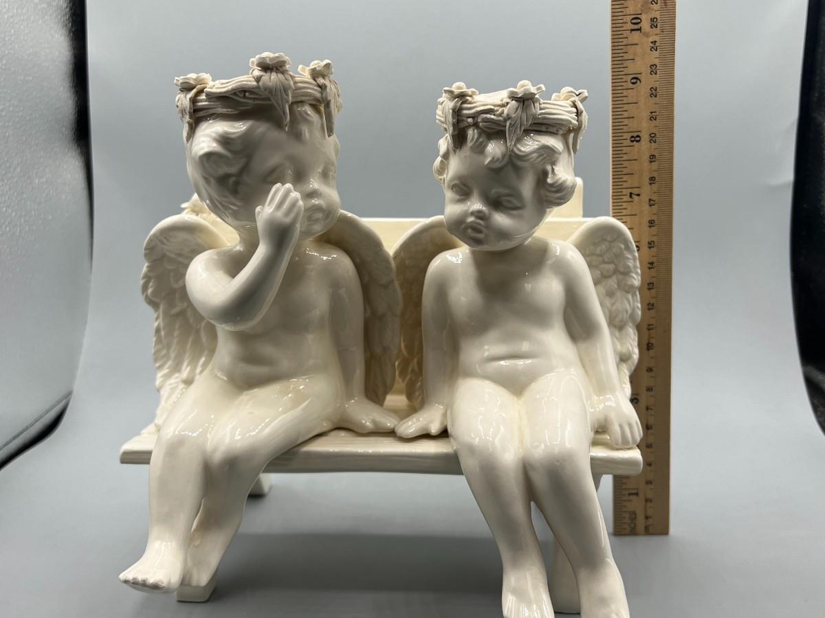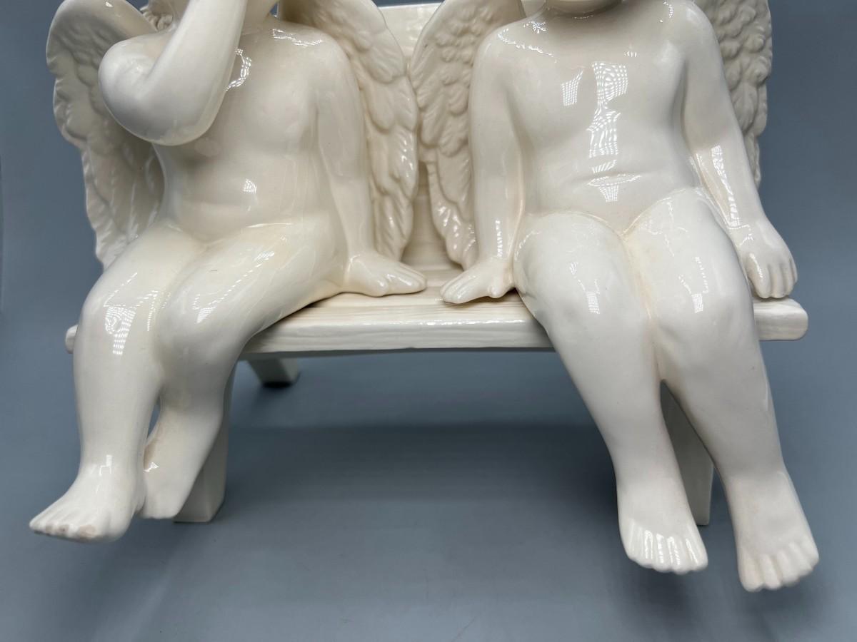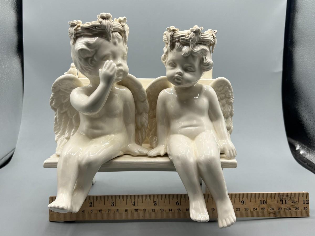 Vintage Ceramic Religious Cherub Angels Sitting on Bench Medium Sized Signed Three Piece Figurine Statue