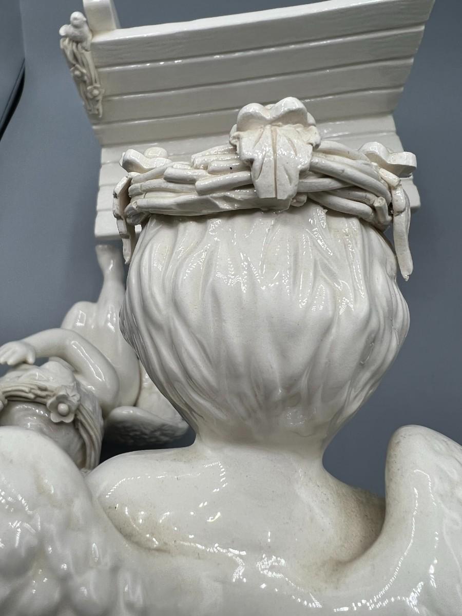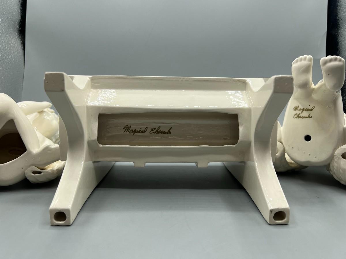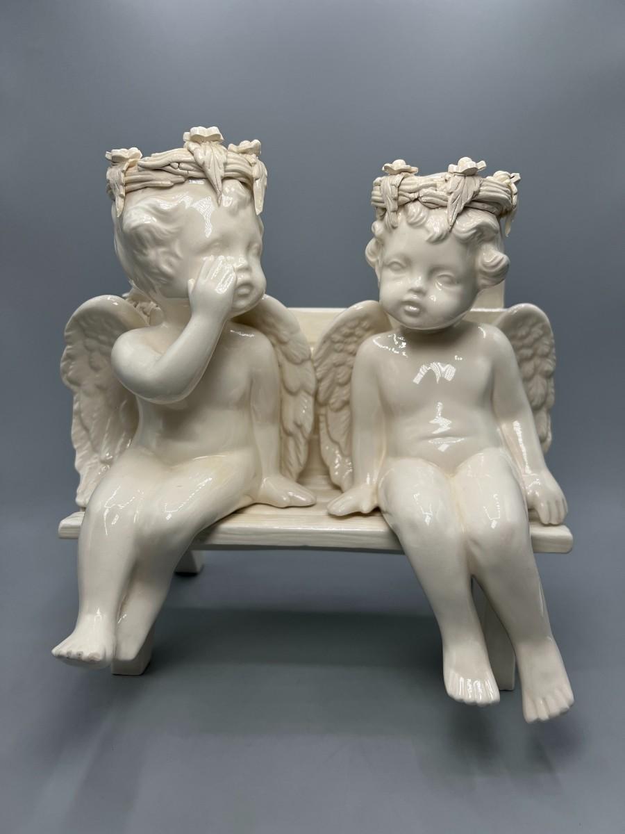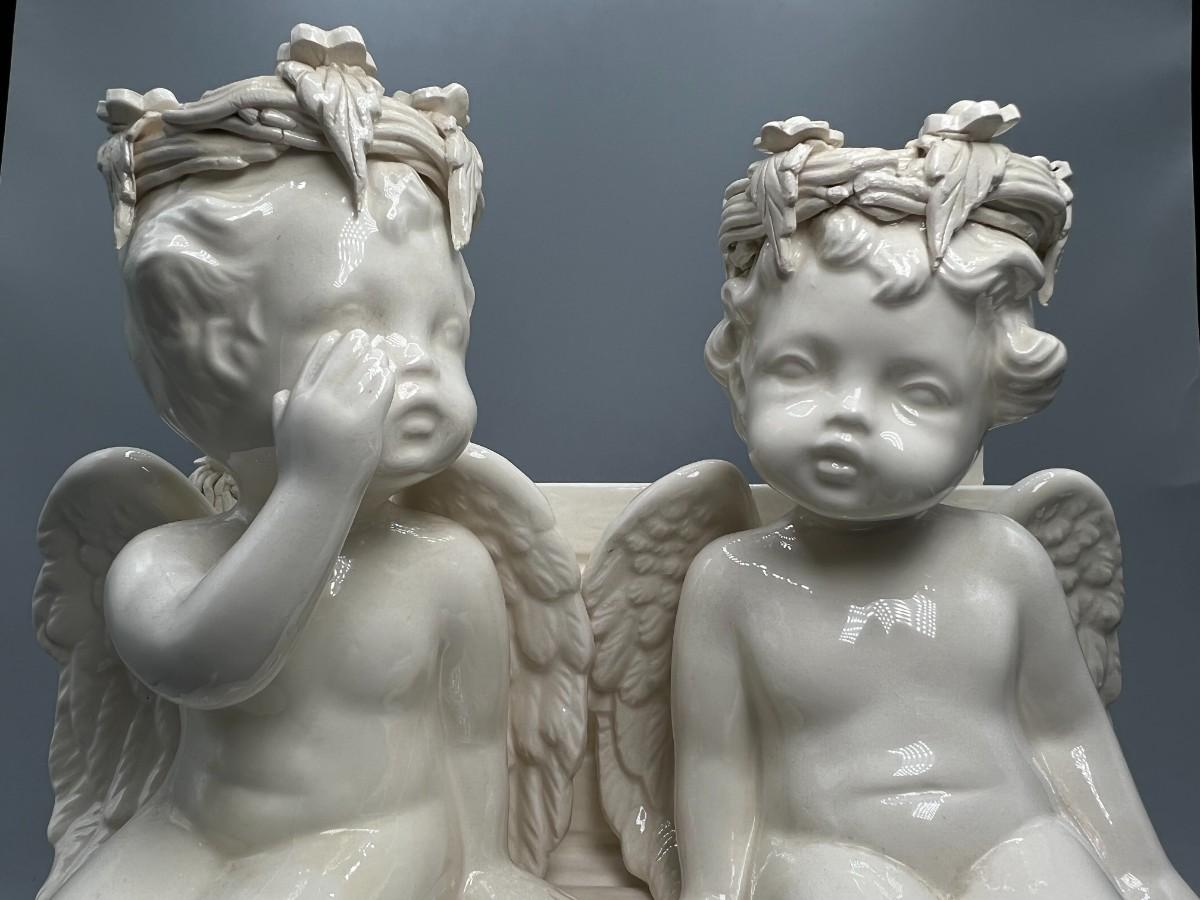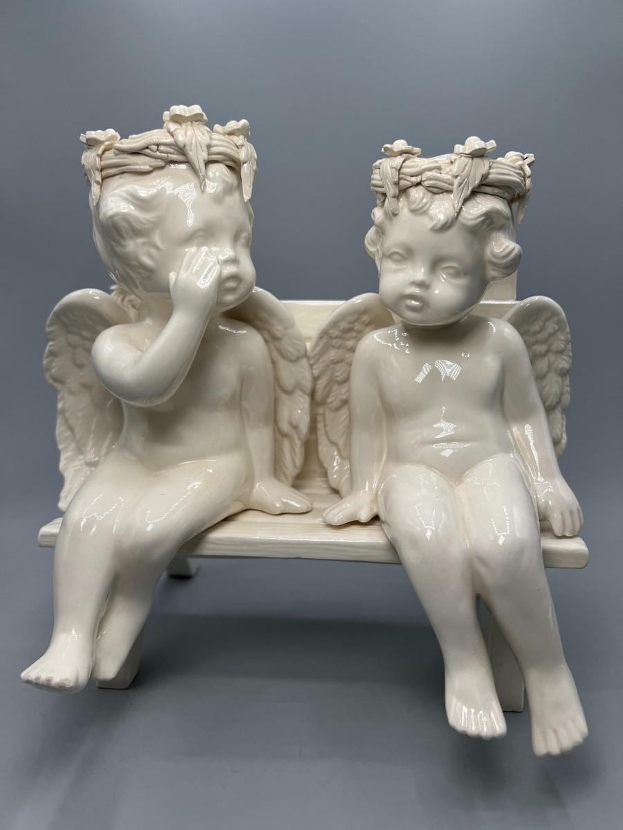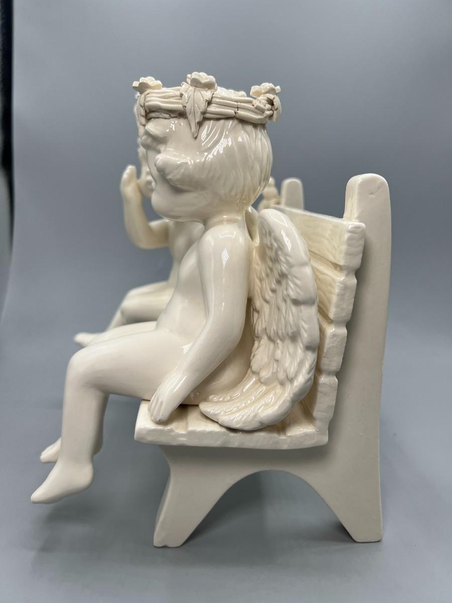 Vintage Ceramic Religious Cherub Angels Sitting on Bench Medium Sized Signed Three Piece Figurine Statue