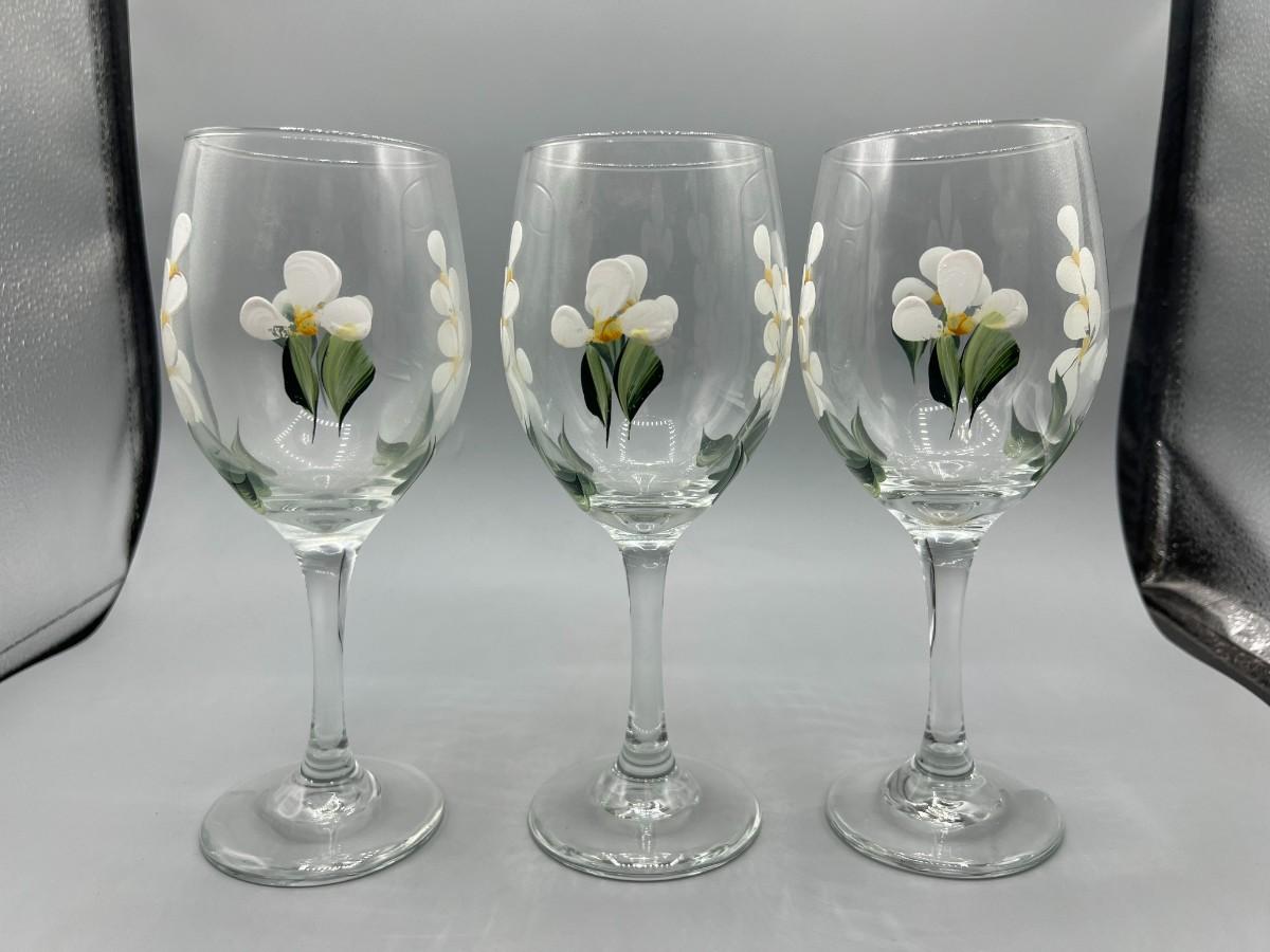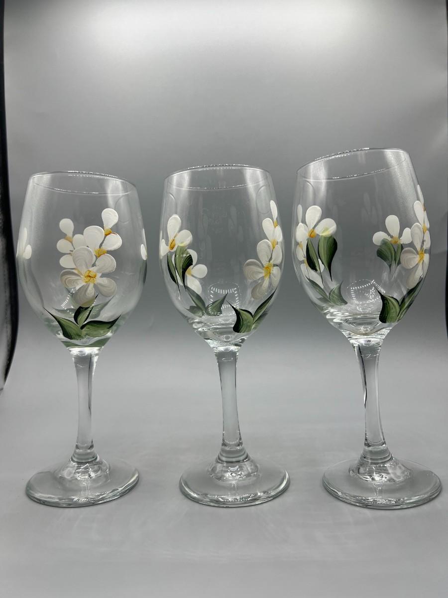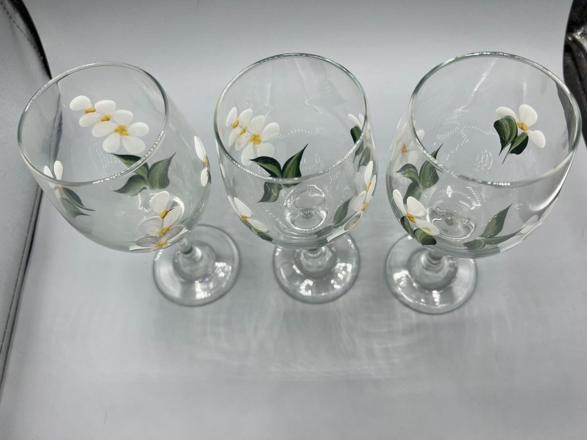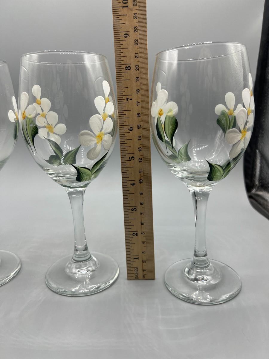 Set of Vintage Hand Painted White Daisy Flowers Stemmed Drinking Vino Wine Glasses