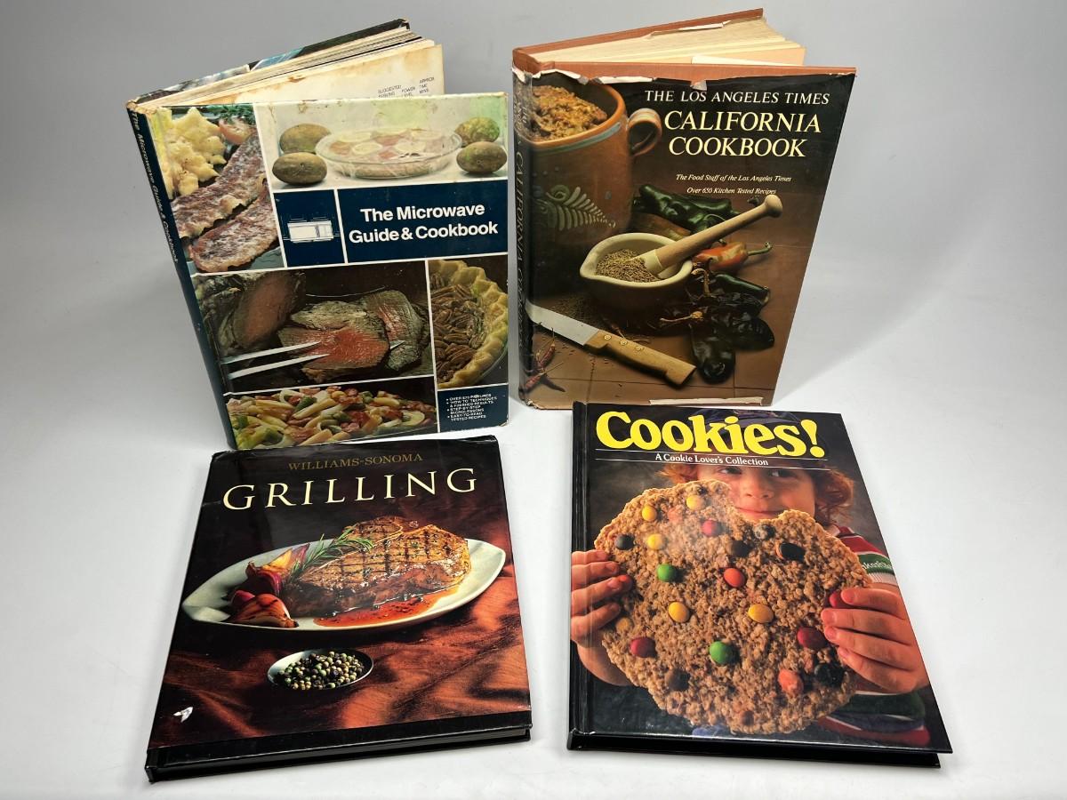 Set of 4 Vintage Retro Hardback Cookbooks Microwave Grilling Cookies Los Angeles Times. Wear along edges. Good previously used condition.