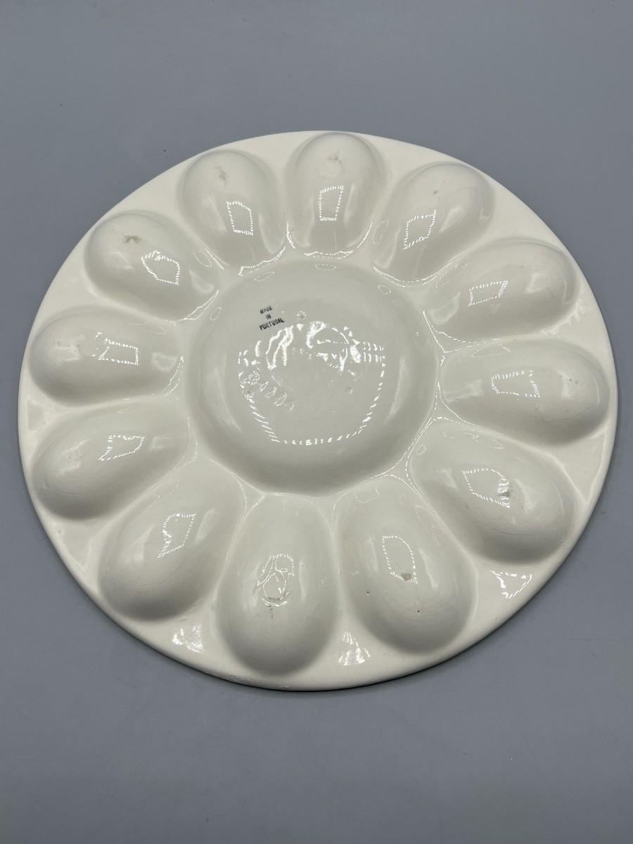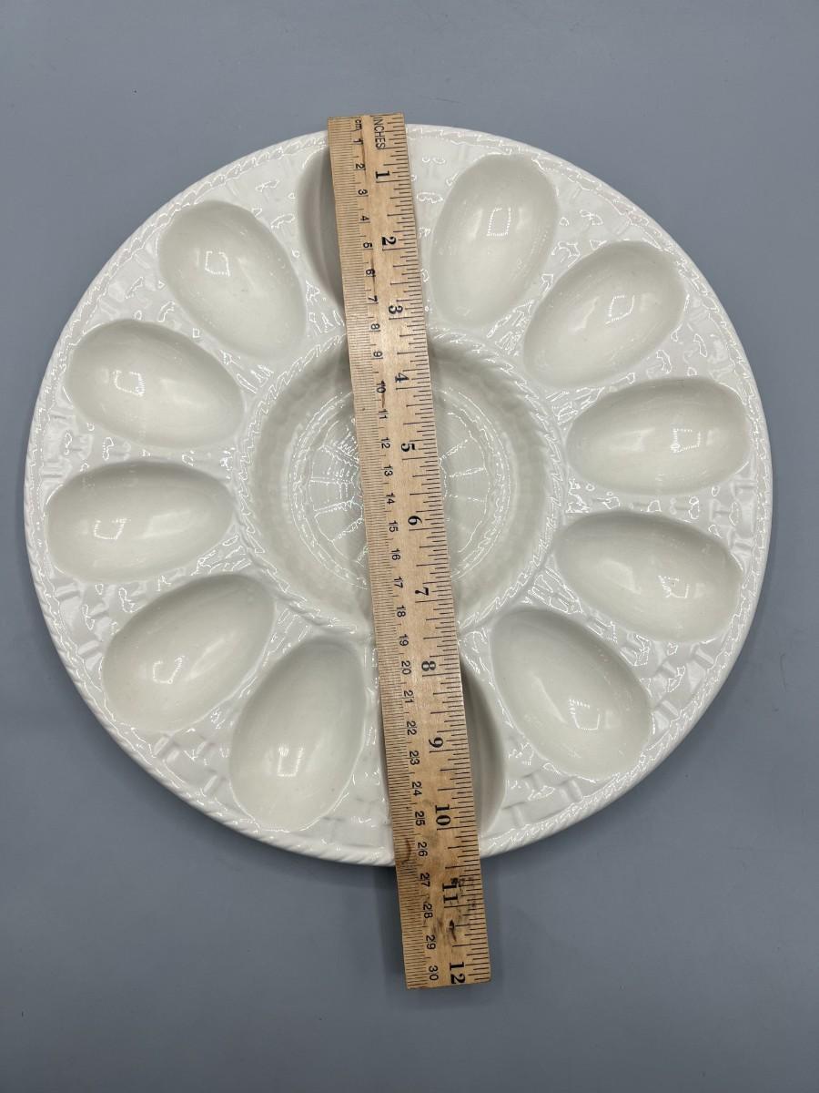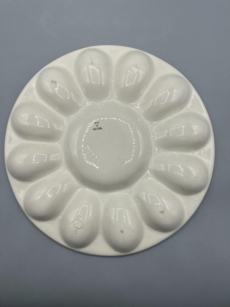 White Ceramic Made in Portugal Deviled Egg Serving Plate. Holds 12 eggs with a garnish spot in center. Good condition.