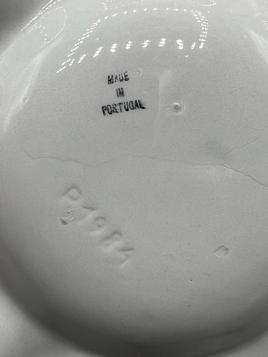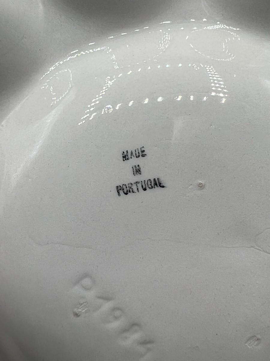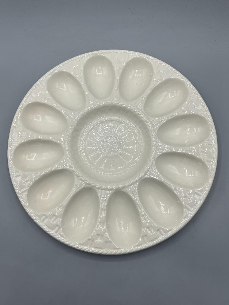 White Ceramic Made in Portugal Deviled Egg Serving Plate. Holds 12 eggs with a garnish spot in center. Good condition.