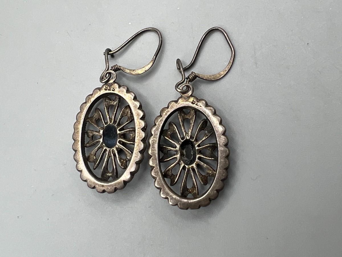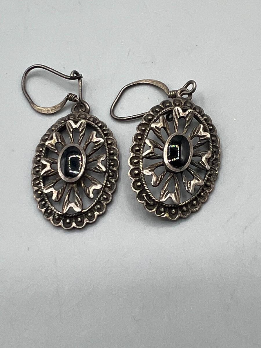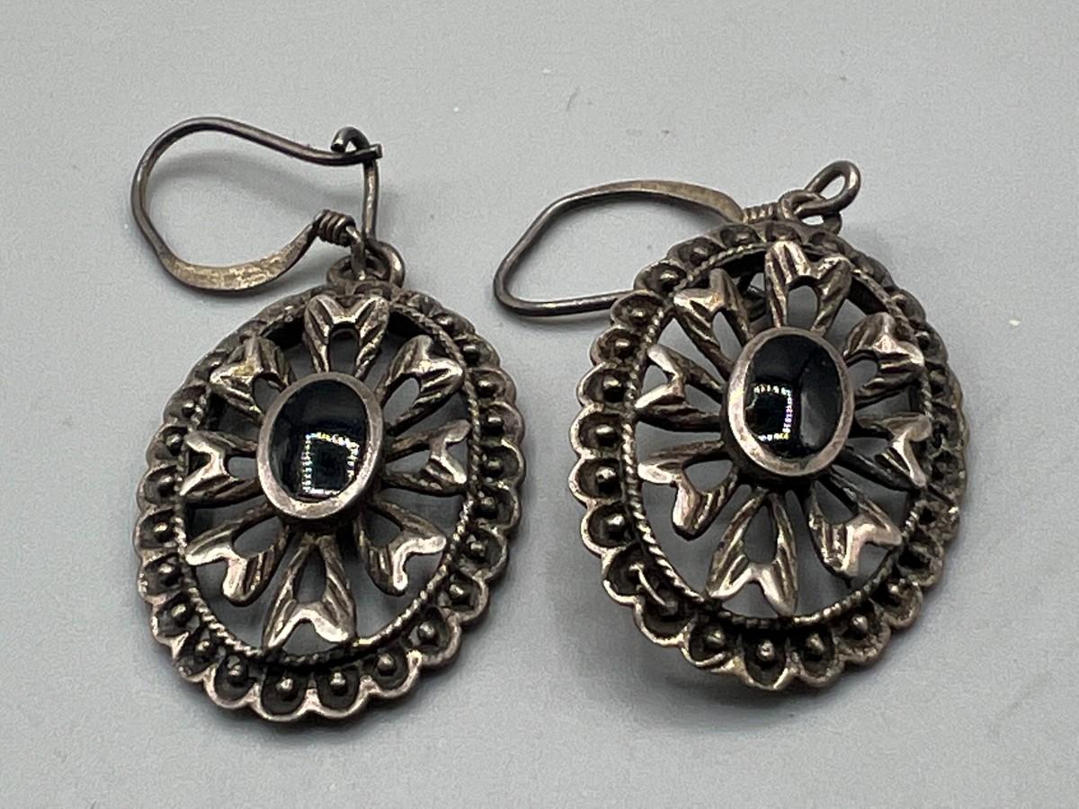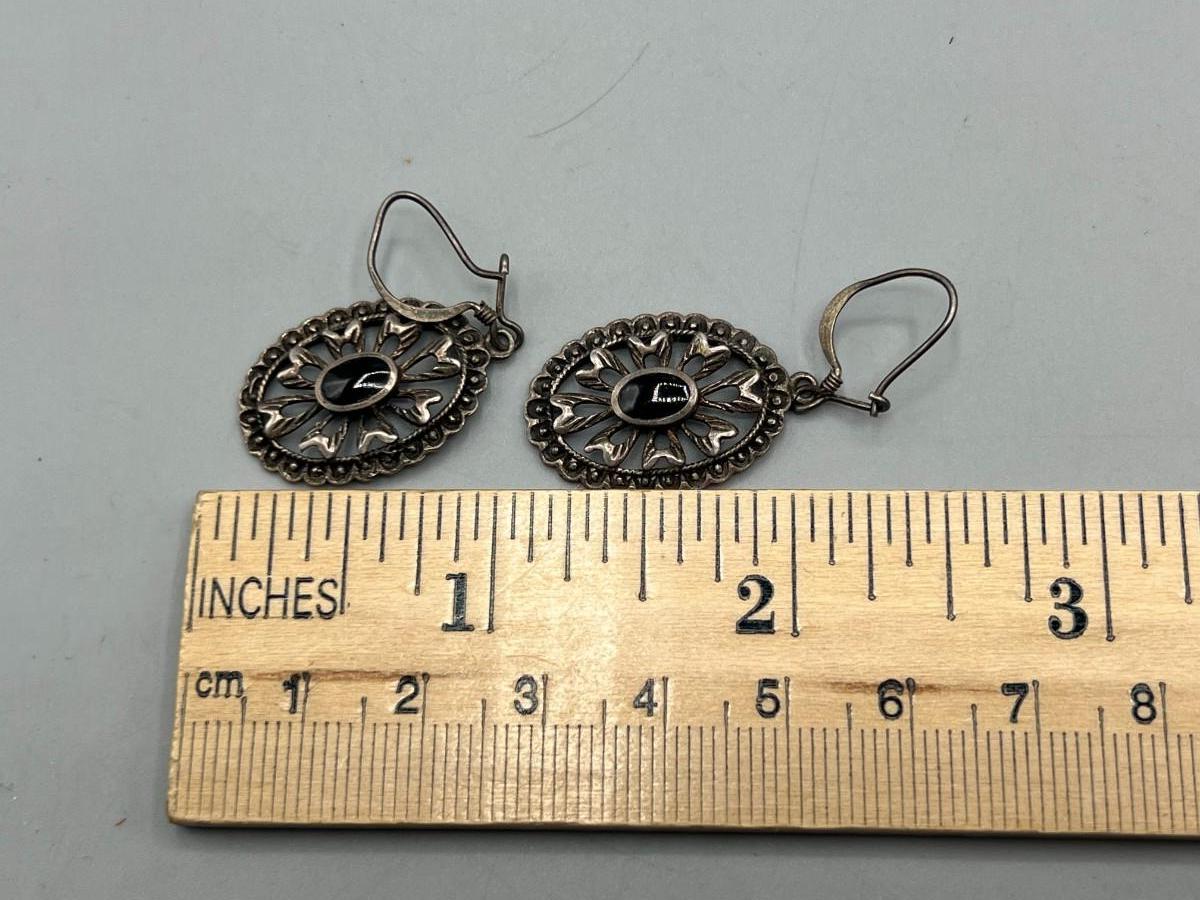 Sterling Silver 925 & Onyx Center Medallion Drop Dangle Earrings. In good condition. Marked 925.
