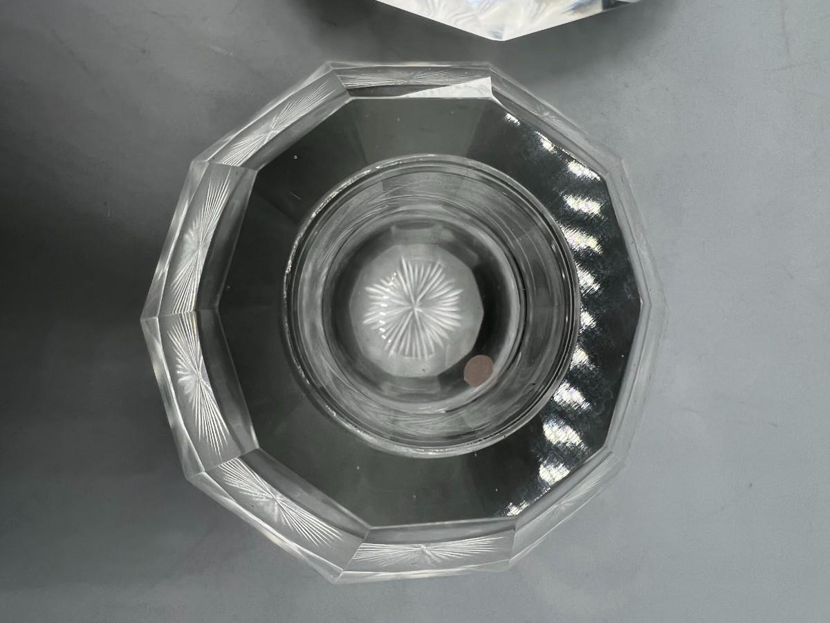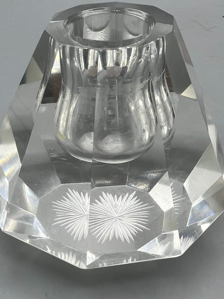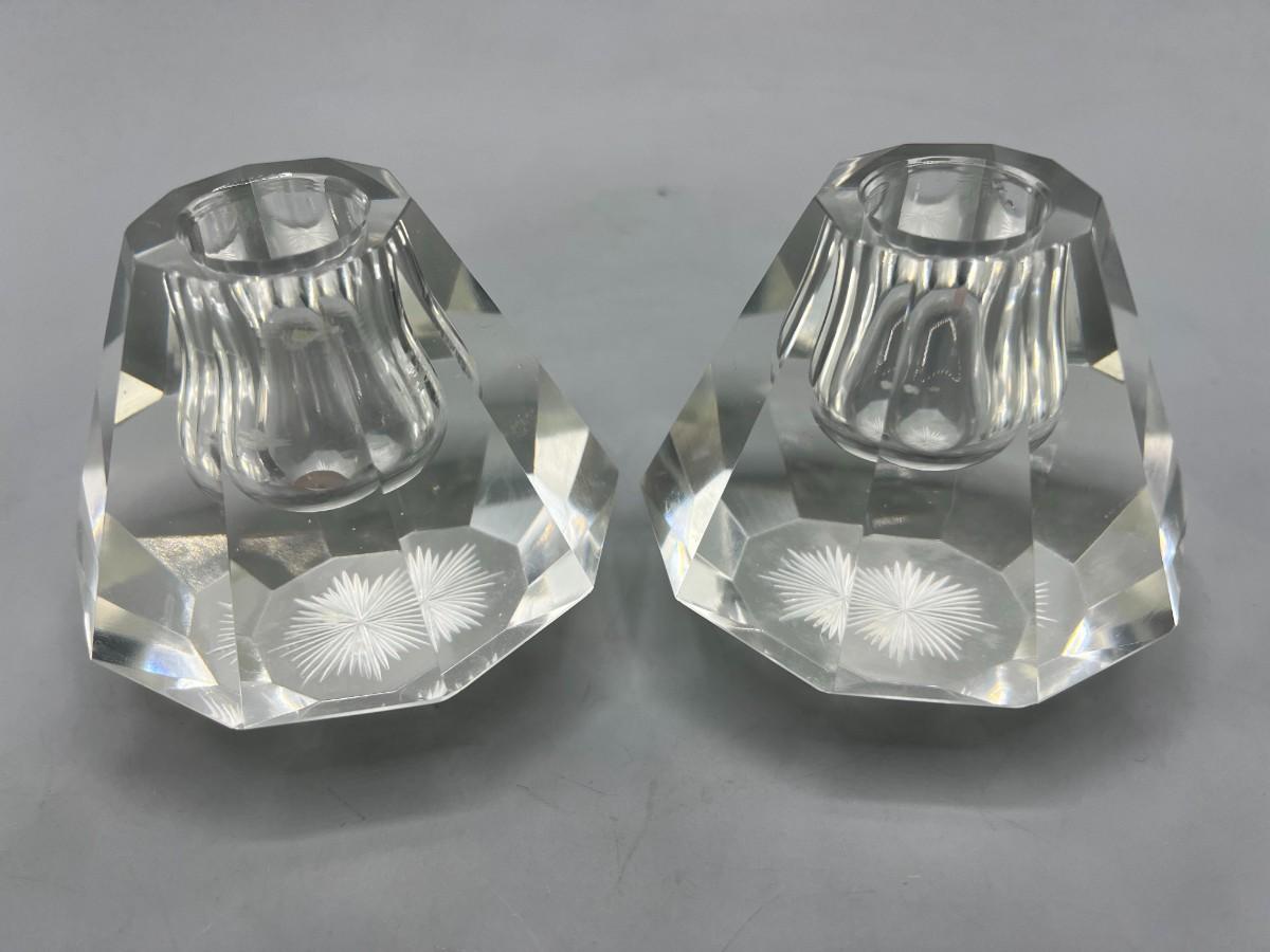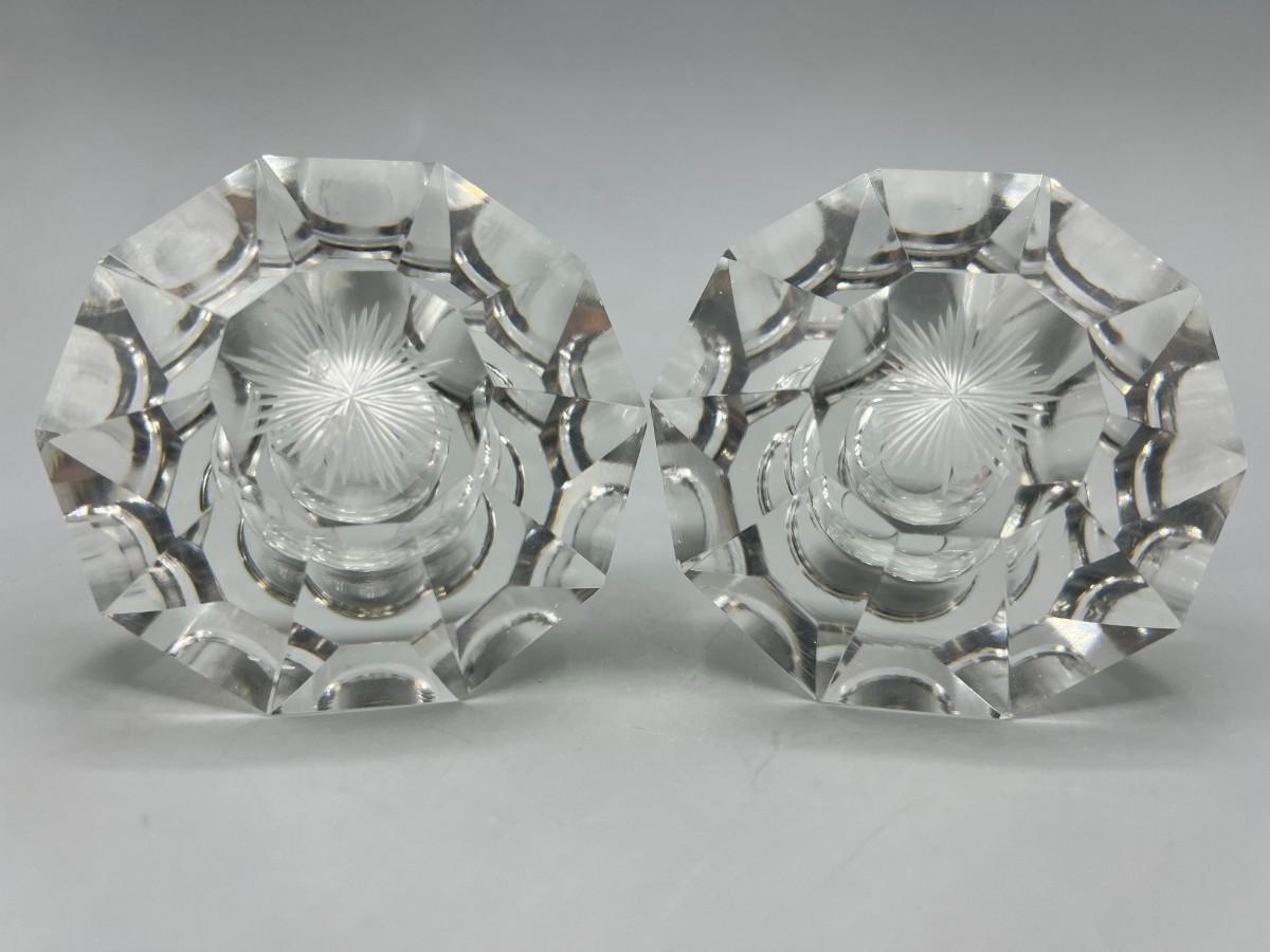 Pair of Vintage Mid Century Crystal Glass Hexagonal Pyramid Candlestick Holders