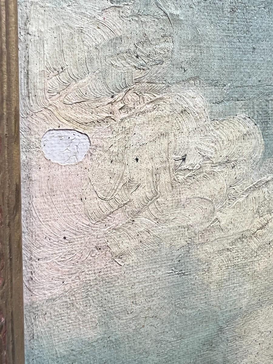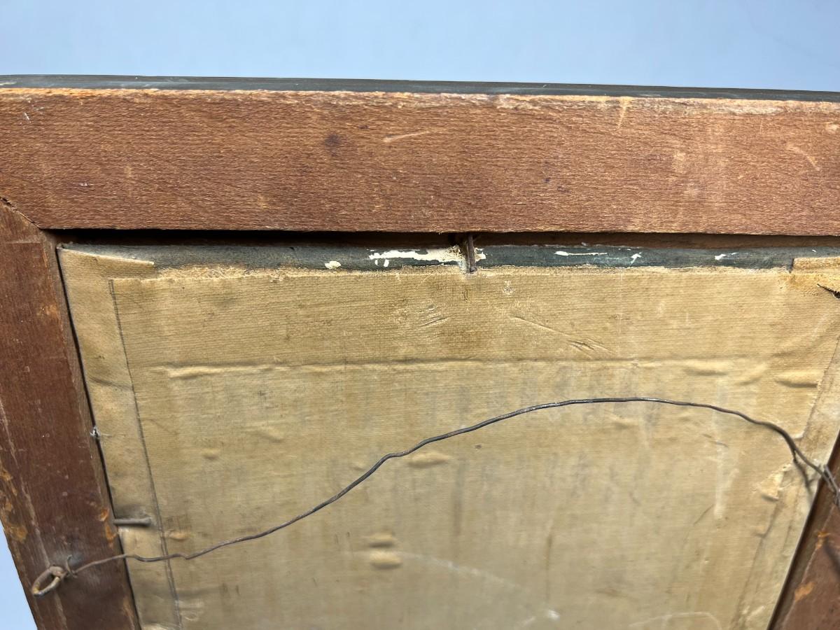 There is some vintage wear to the frame and canvas, but there is no significant damage and is in overall good collectible or displayable condition. Check pictutres for more details and for sizing.