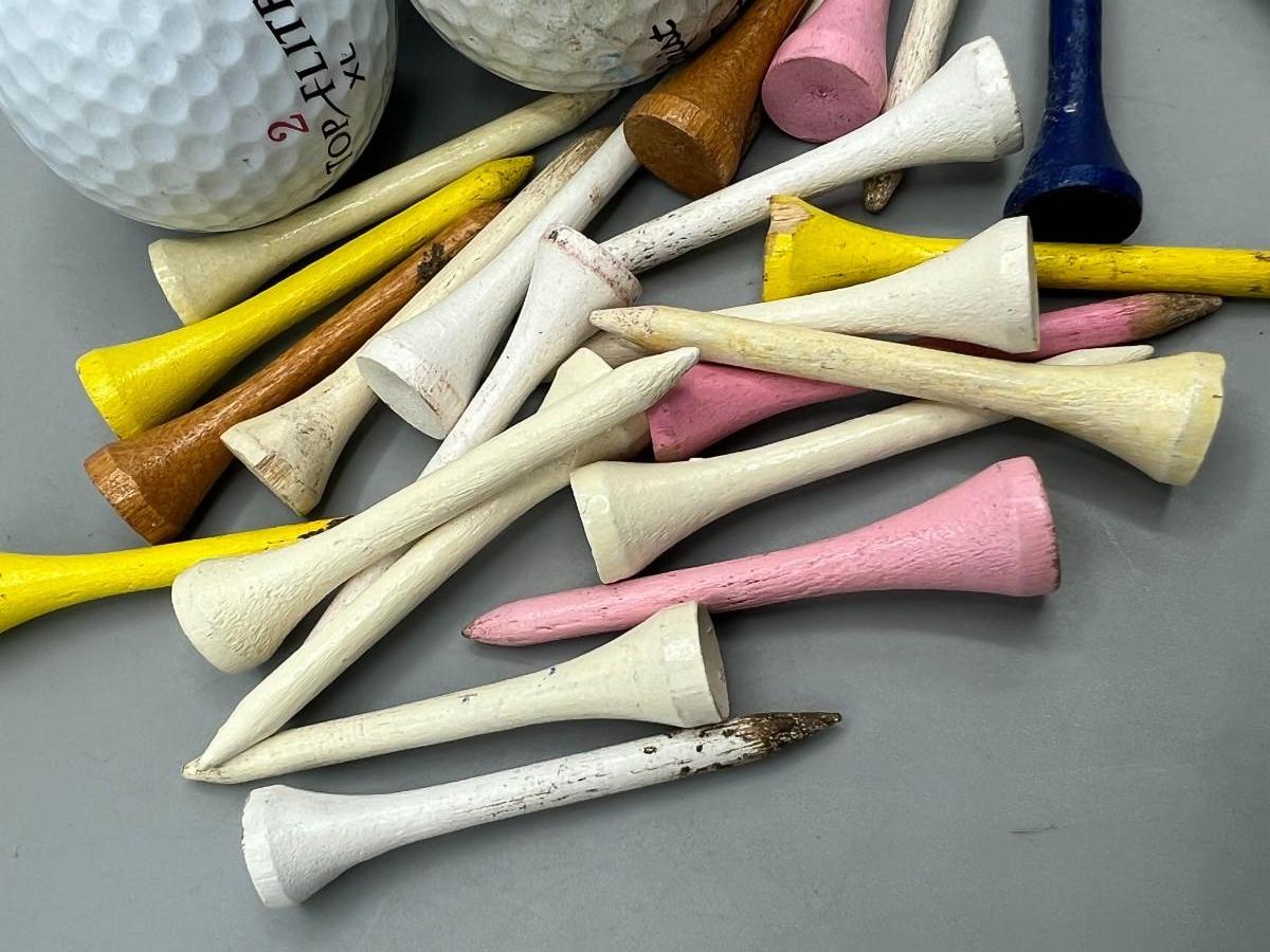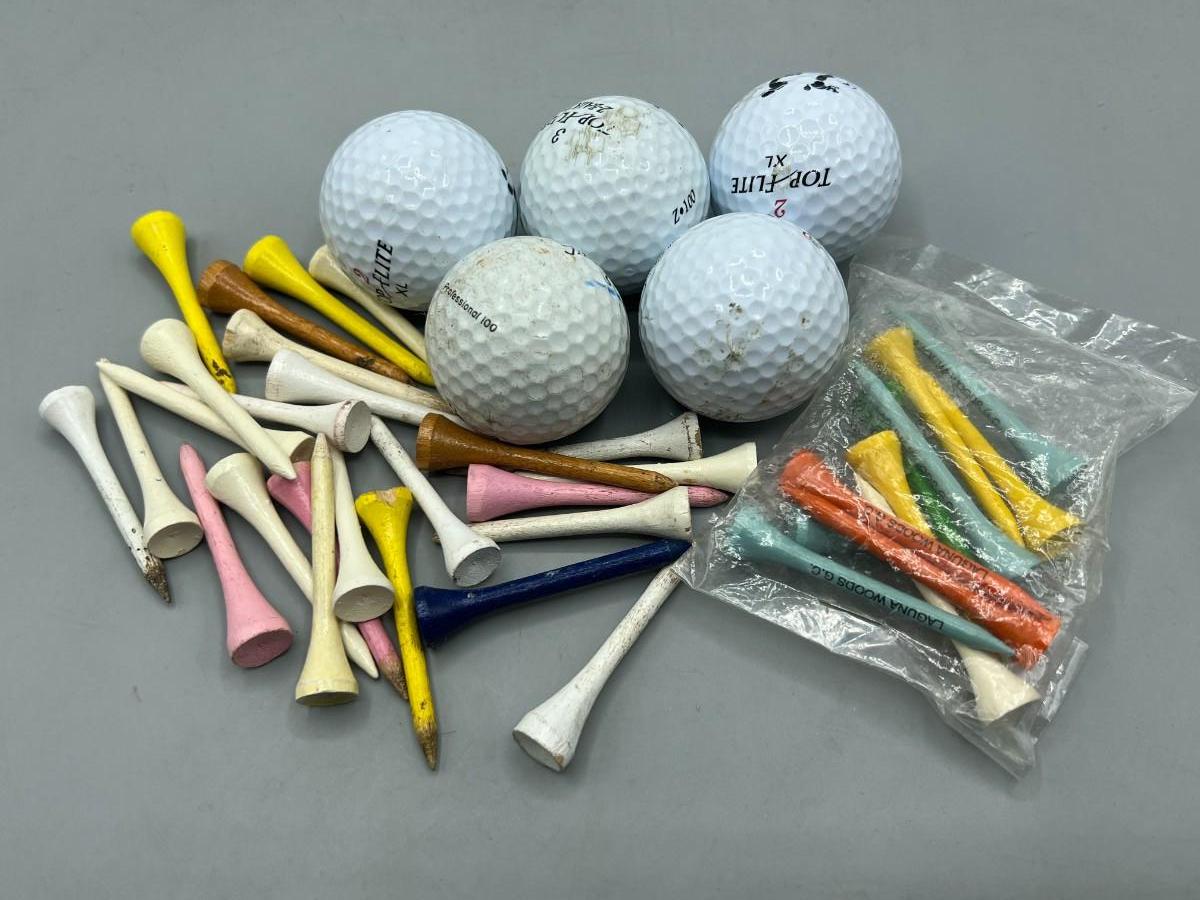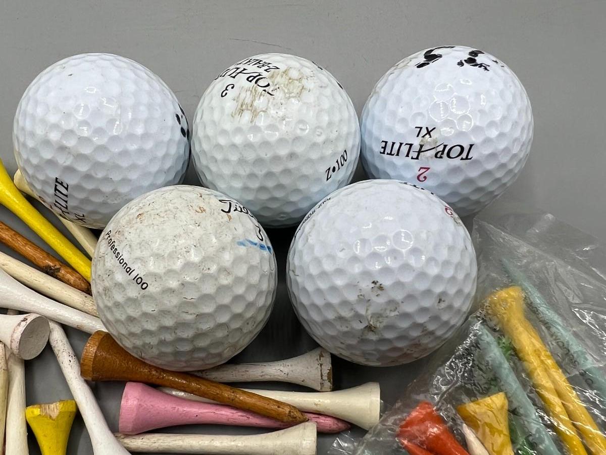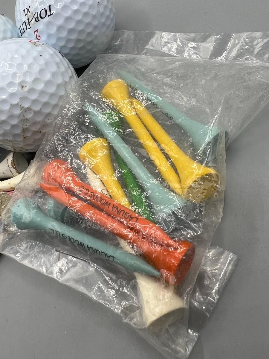 Mixed Lot of Used Gold Balls & Wood Tees. 5 balls and a tee assortment.