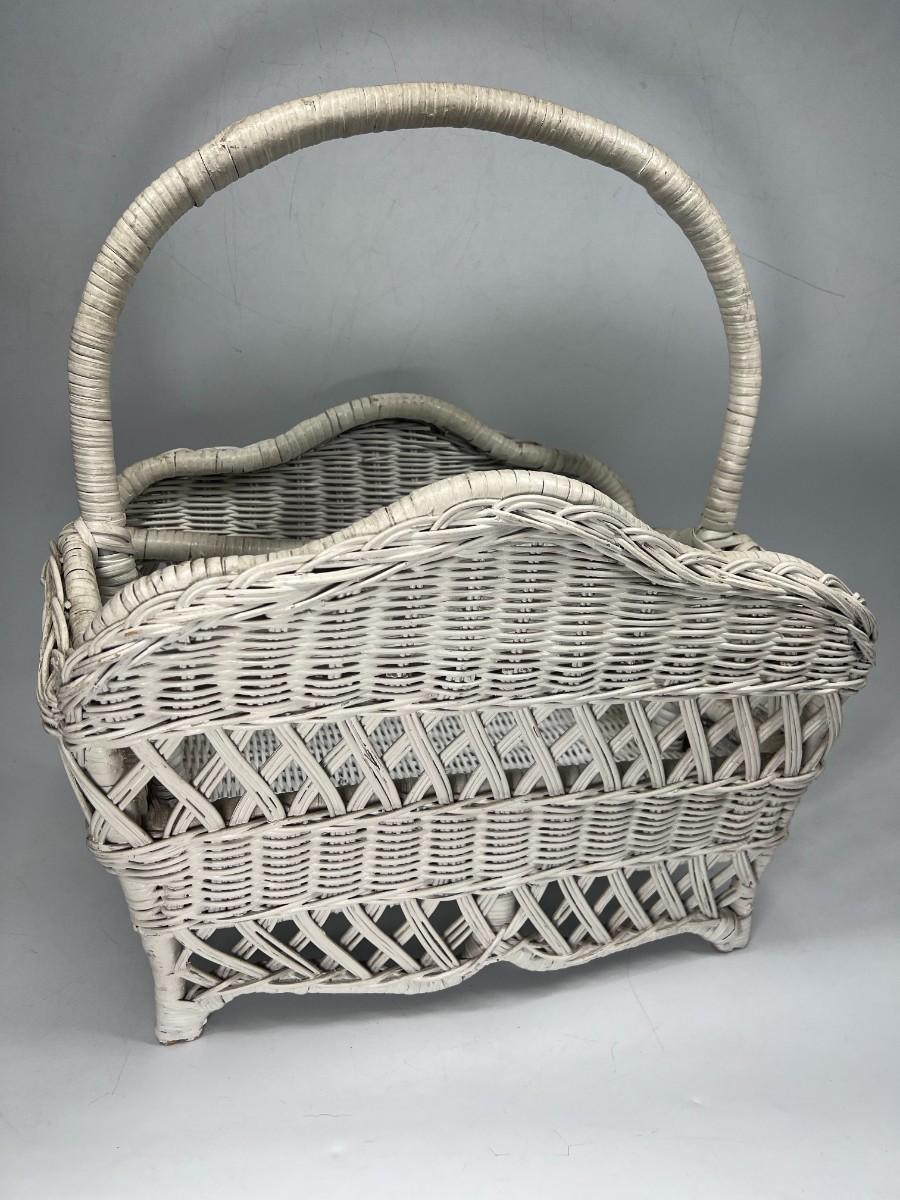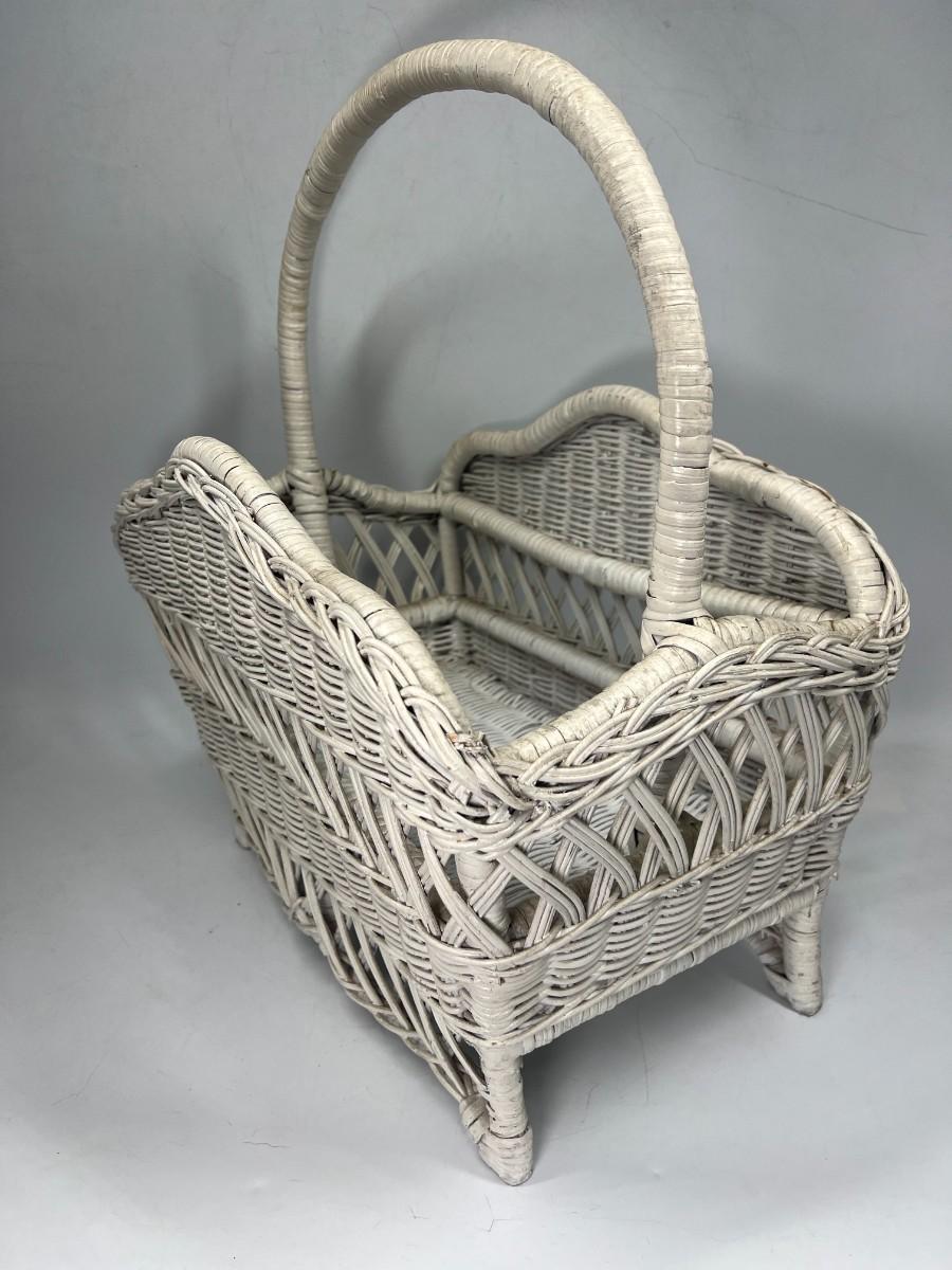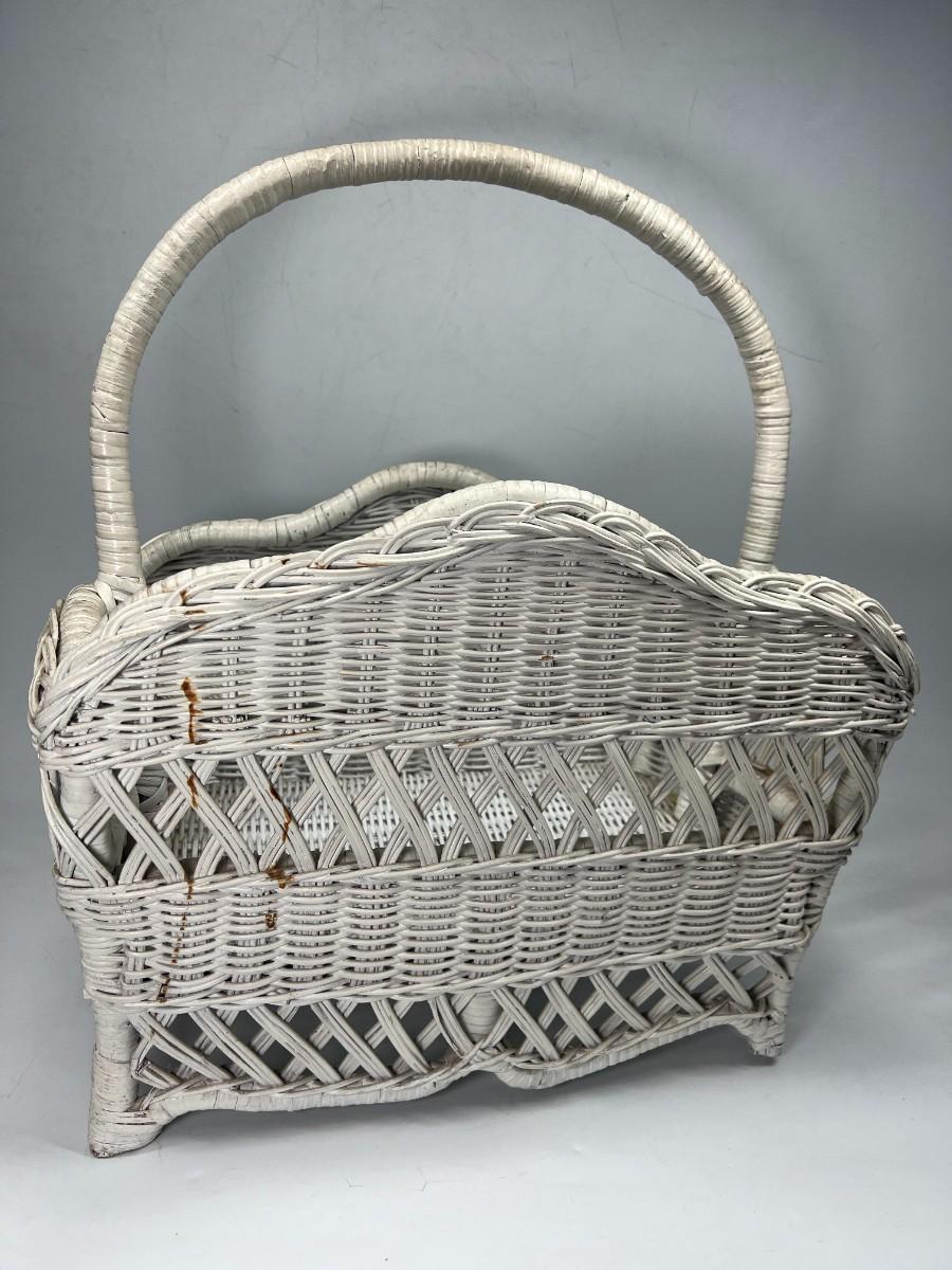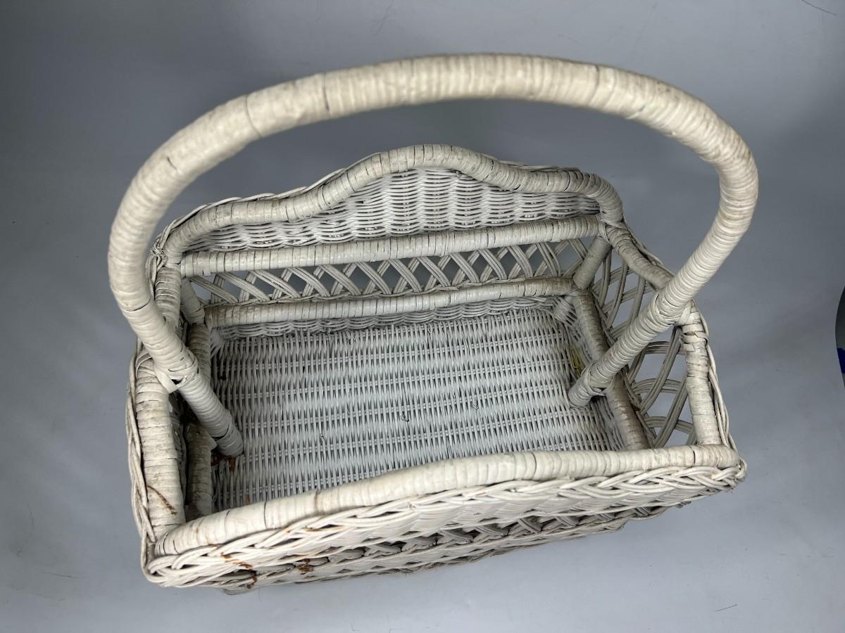 Large White Woven Wicker Rattan Newspaper Magazine Basket. In aged condition. A little dusty, could be repainted as desired. About 18" size.