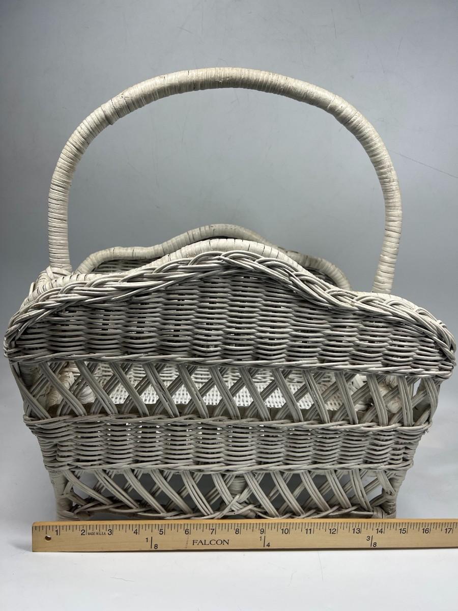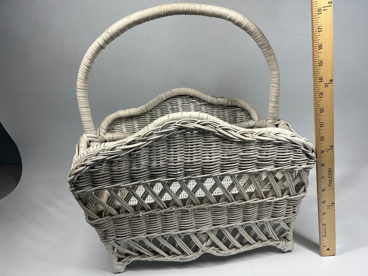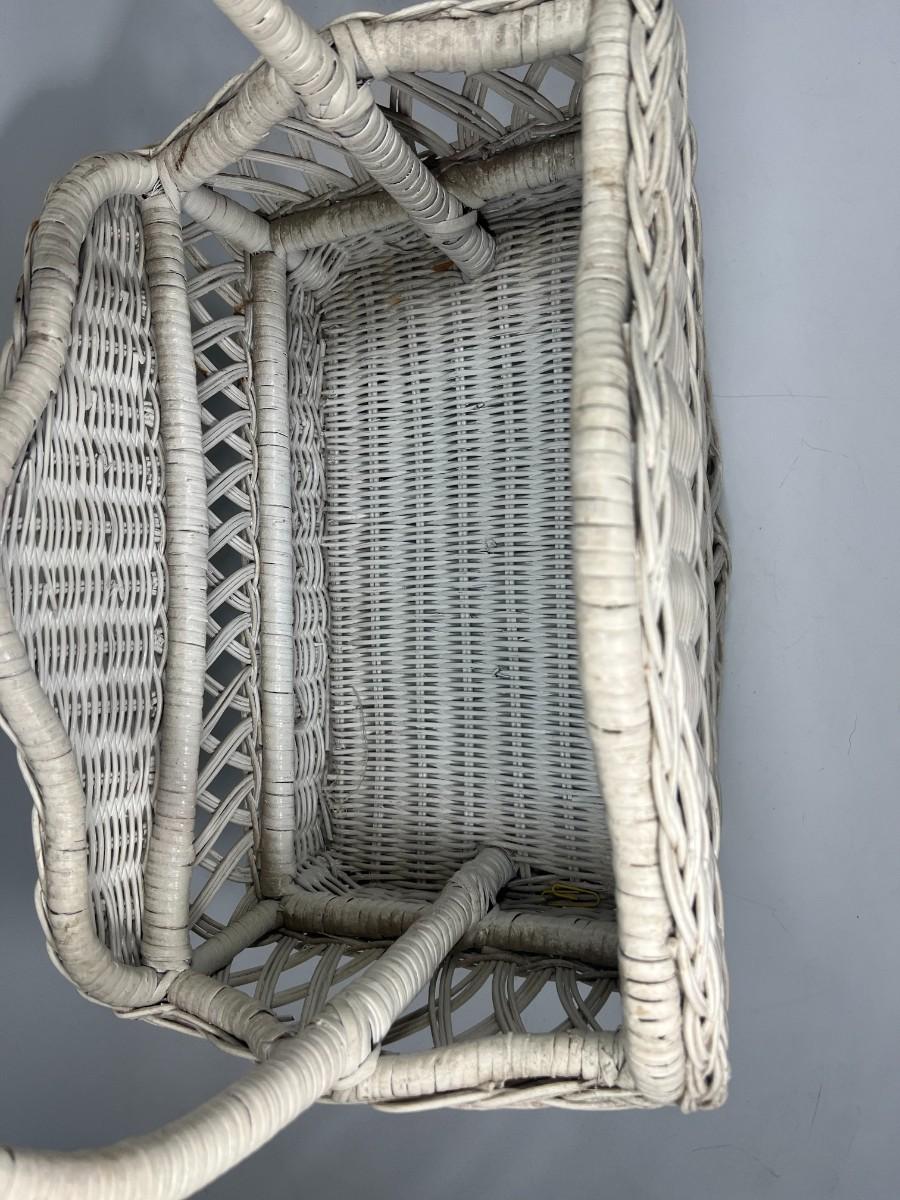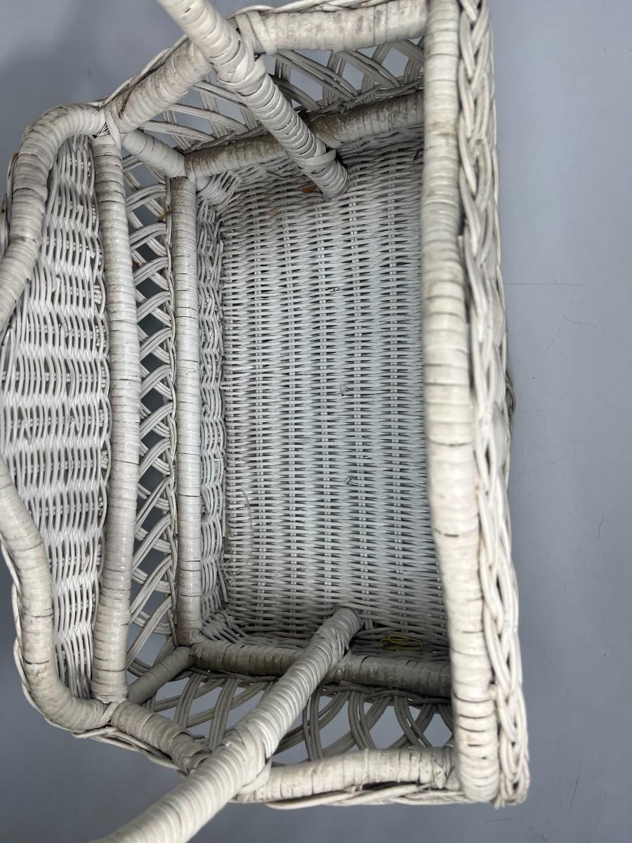 Large White Woven Wicker Rattan Newspaper Magazine Basket. In aged condition. A little dusty, could be repainted as desired. About 18" size.