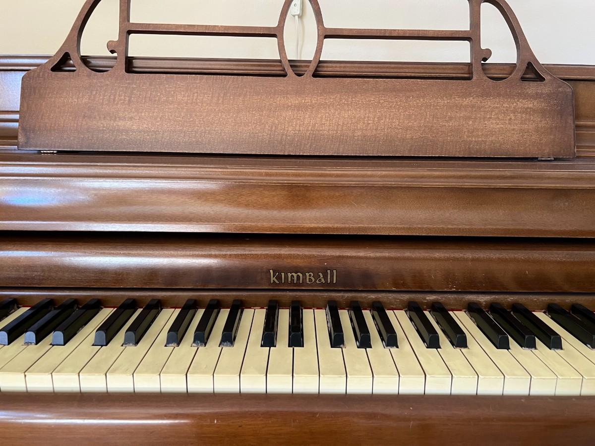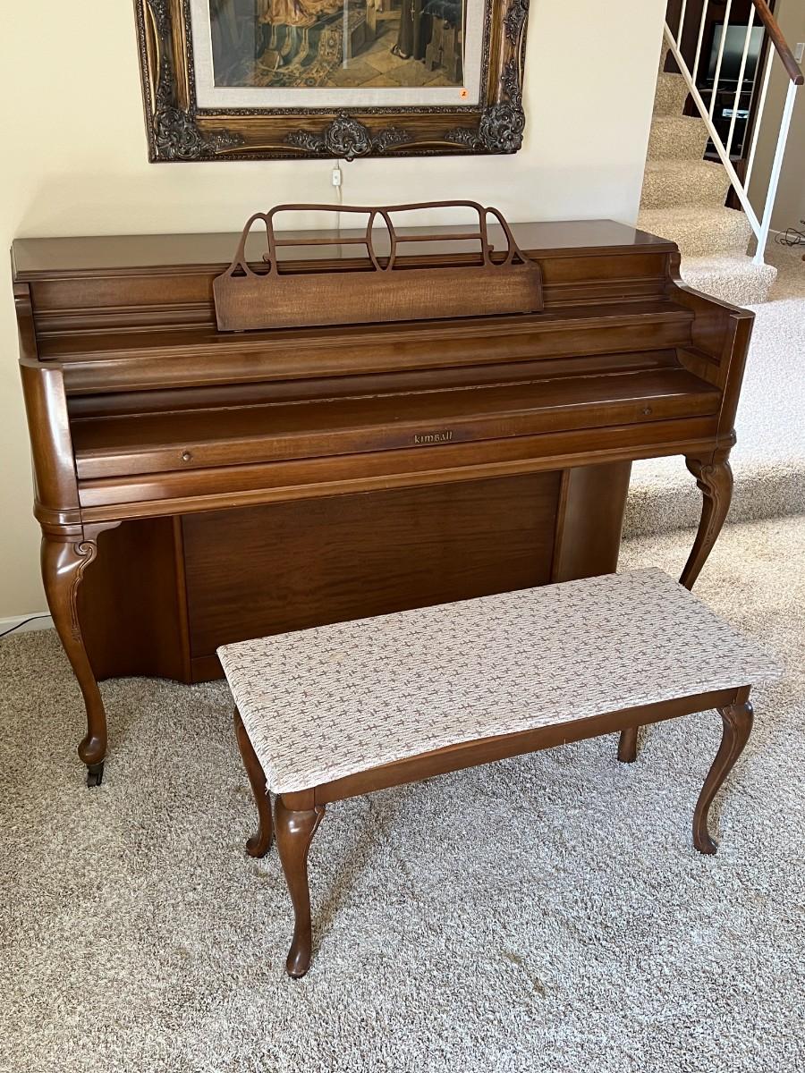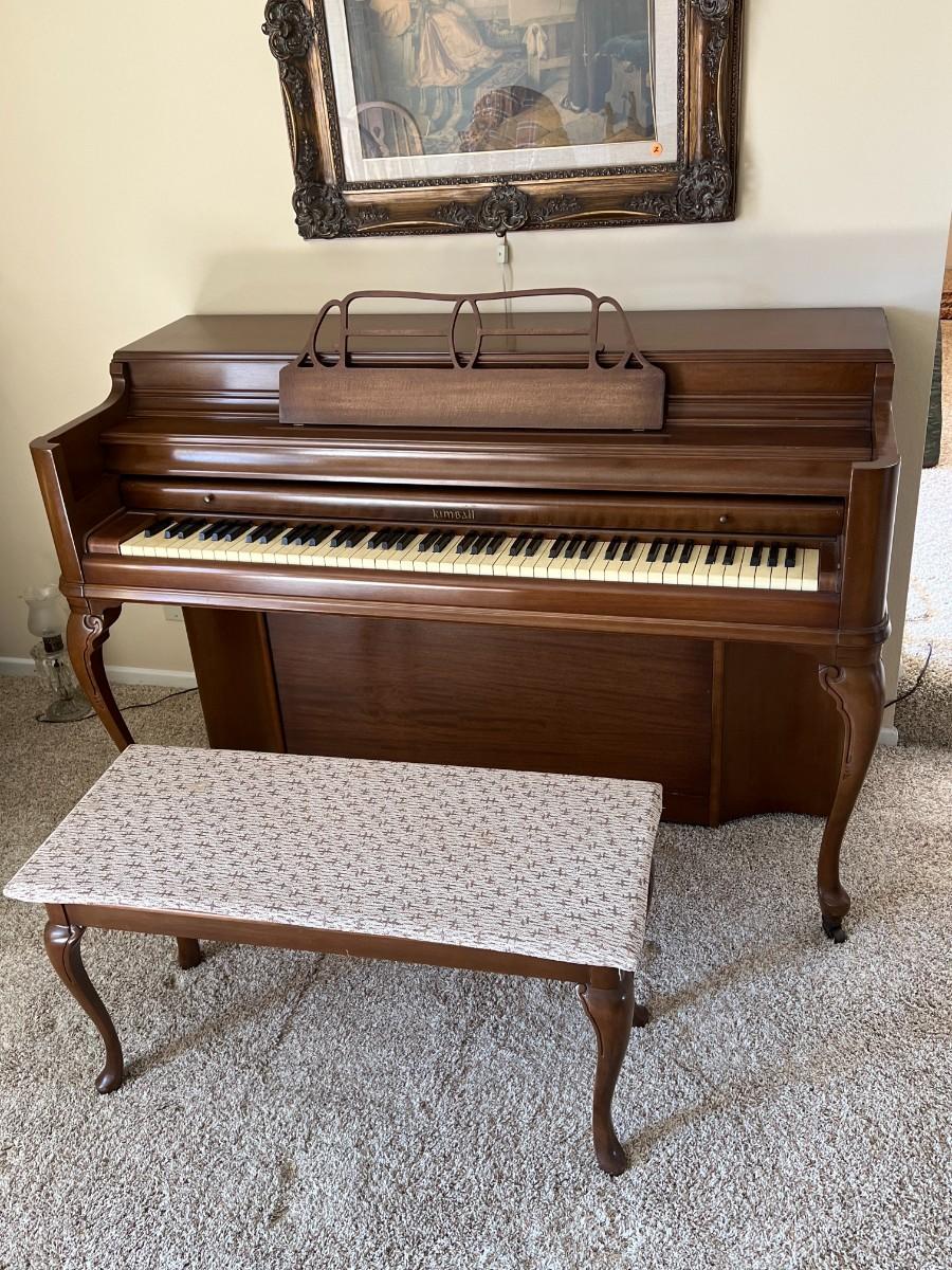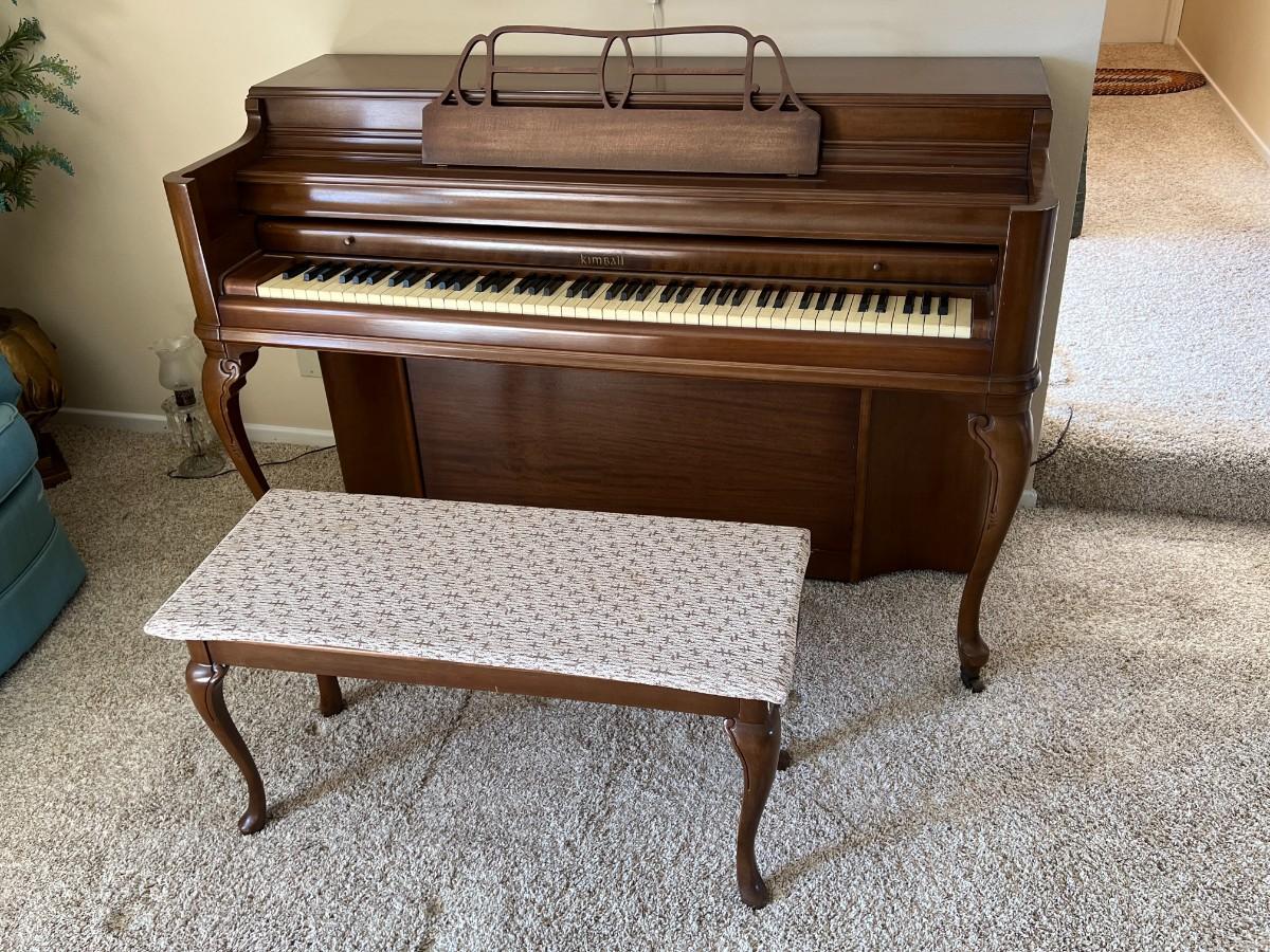 Vintage 1953 Kimball French Provincial Style Upright Spinet Piano with Piano Bench