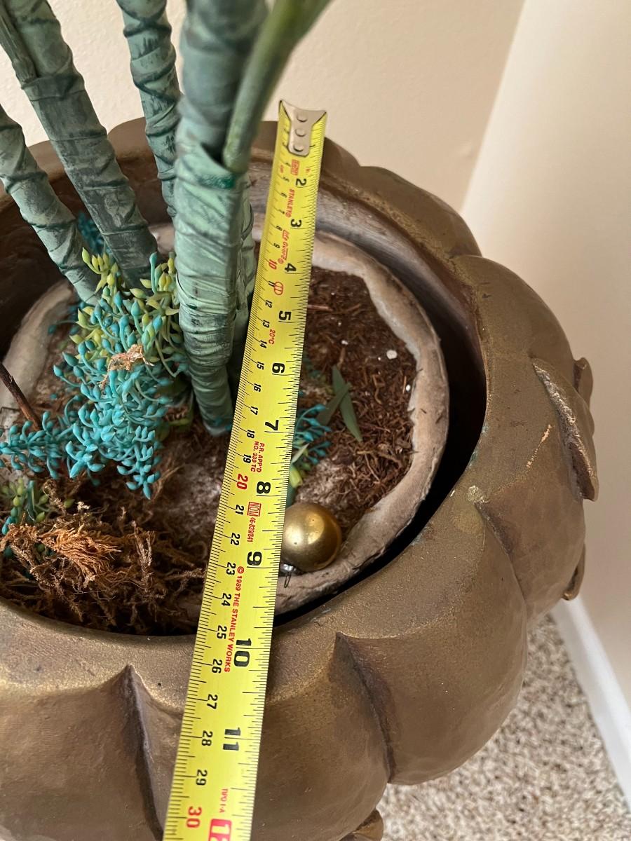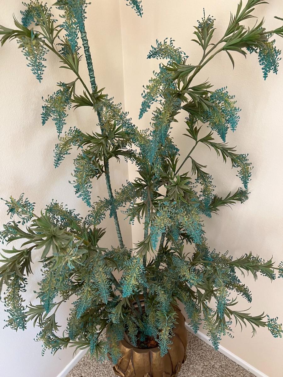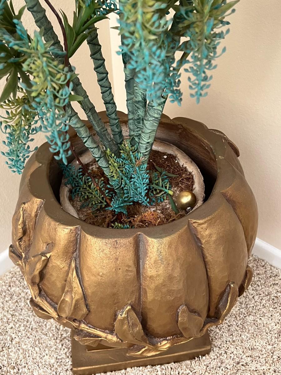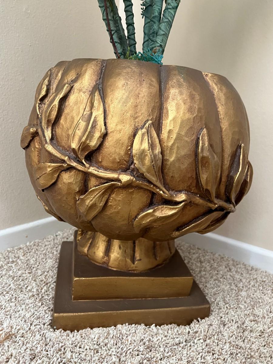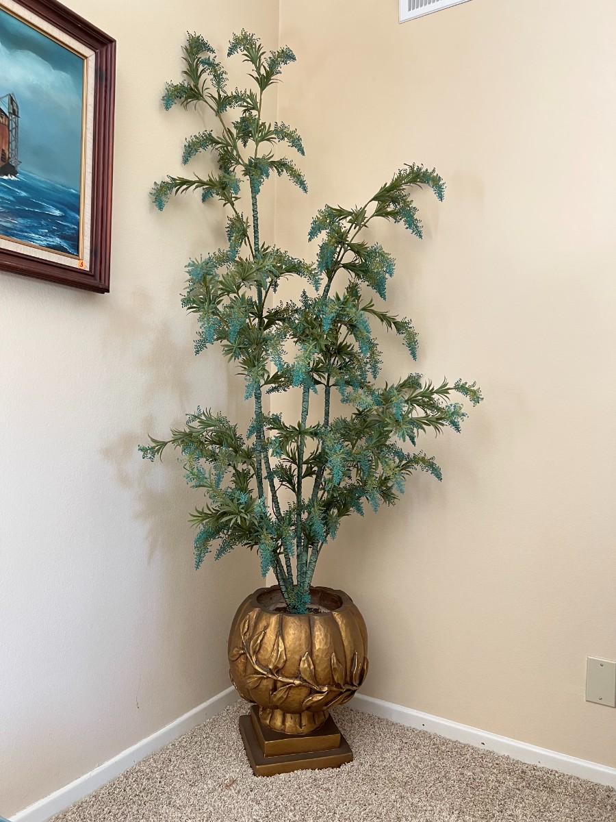 There is no significant damage to the planter or the faux plant (guessing the plant is supposed to be Scherfflera) and is in overall good displayable condition. Stands at about 6 feet tall in its awesome gold pot/vase. Check pictures for more details and for sizing.