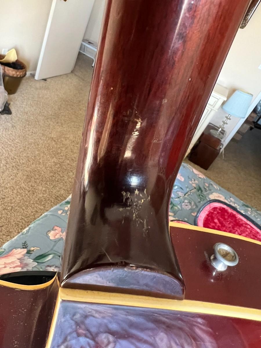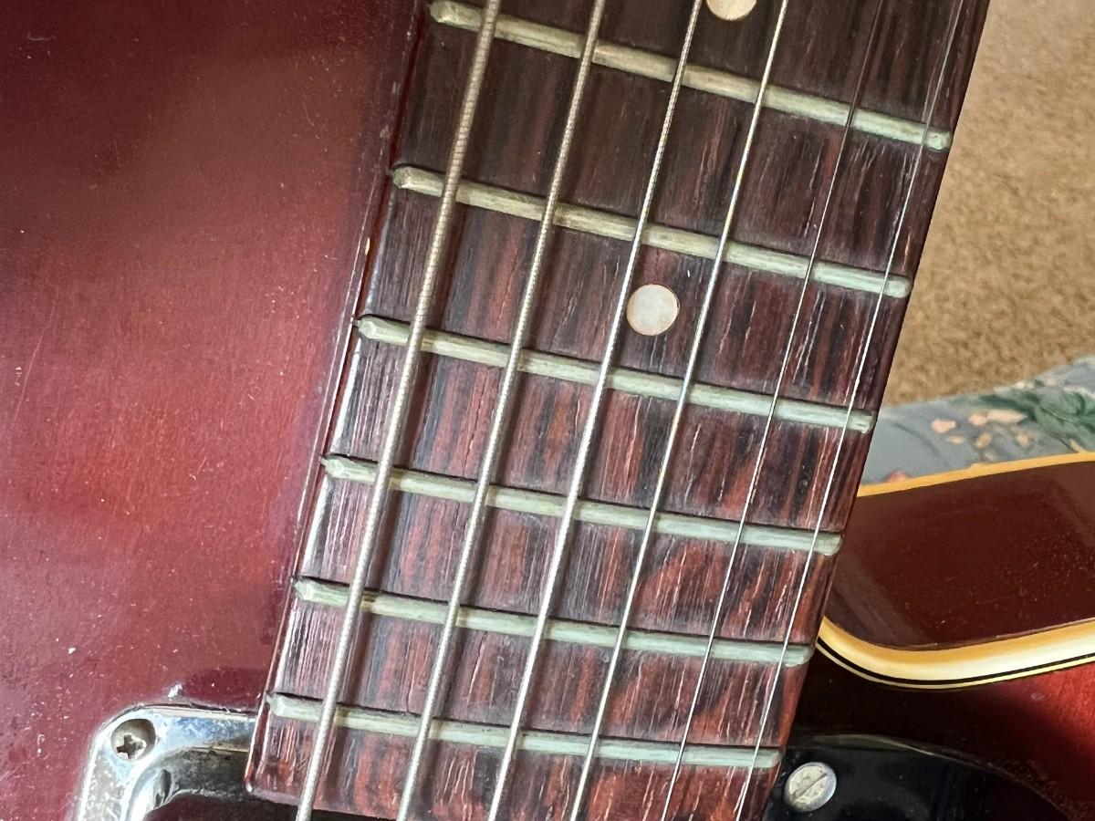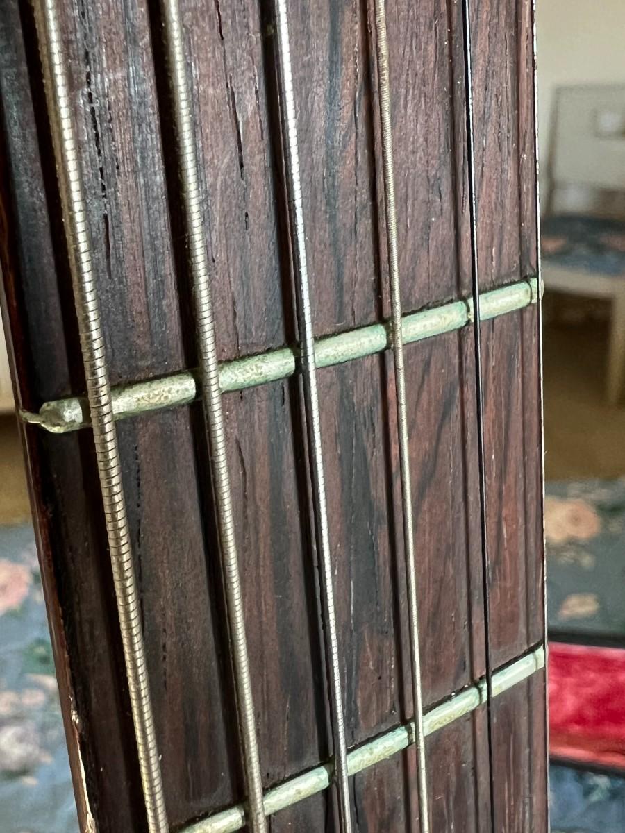 There are some signs of use to the guitar, but there is no significant damage and is in overall good collectible condition. There is green corrosion to the frets and the wood is dry. Has not been tested with an amplifier, check pictures for more details.