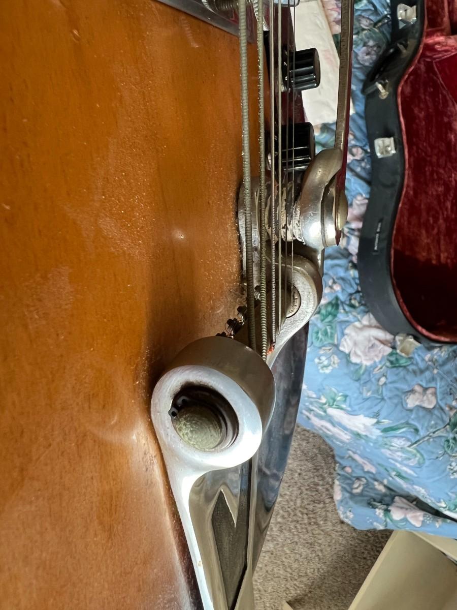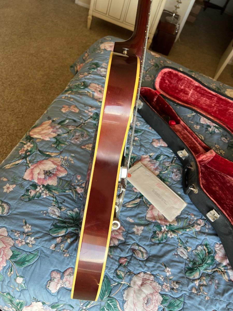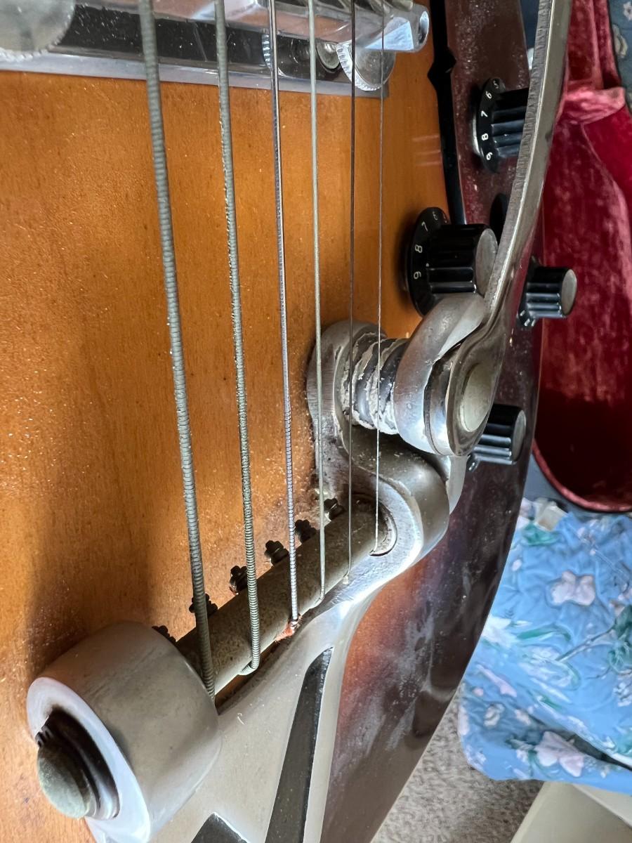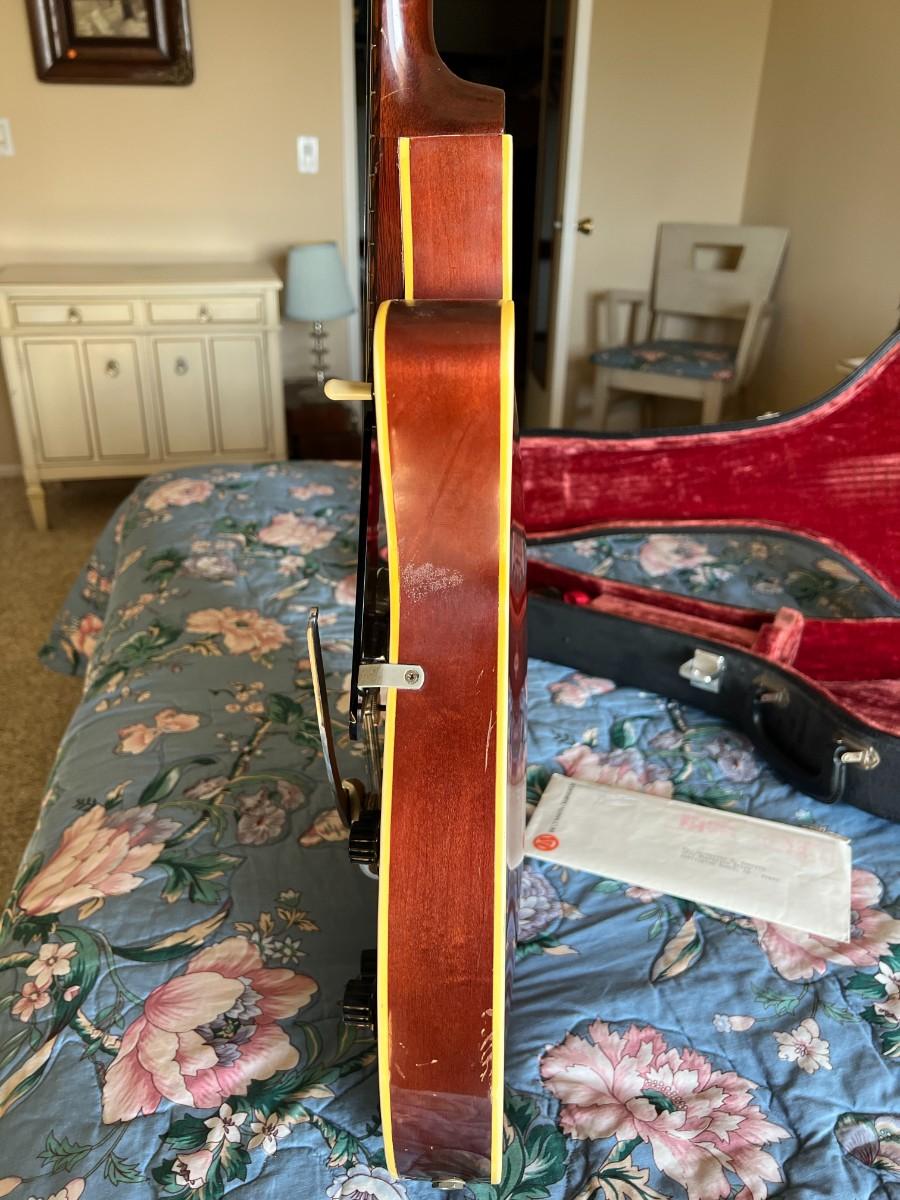 There are some signs of use to the guitar, but there is no significant damage and is in overall good collectible condition. There is green corrosion to the frets and the wood is dry. Has not been tested with an amplifier, check pictures for more details.