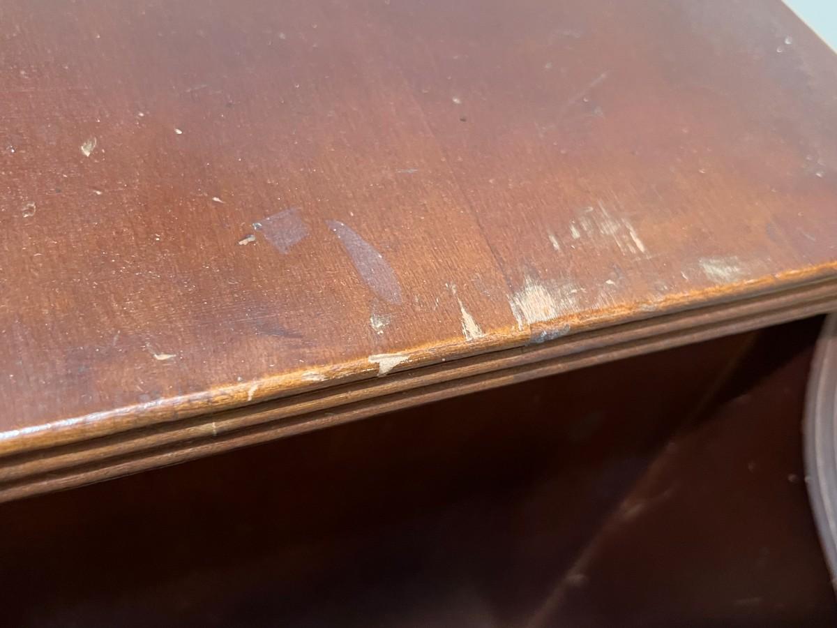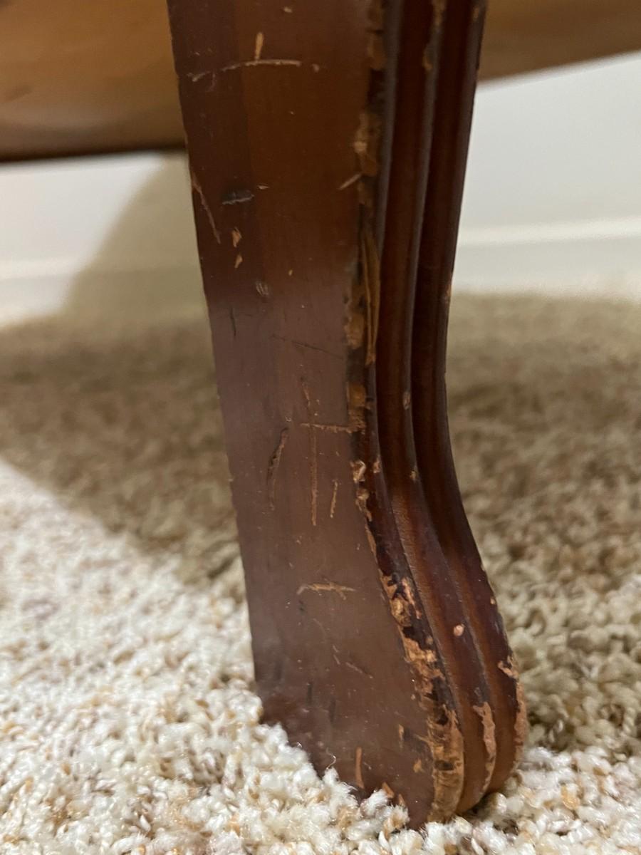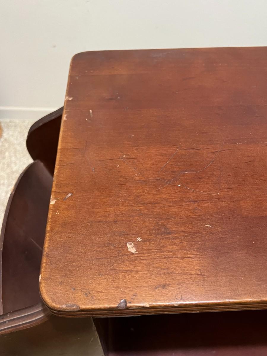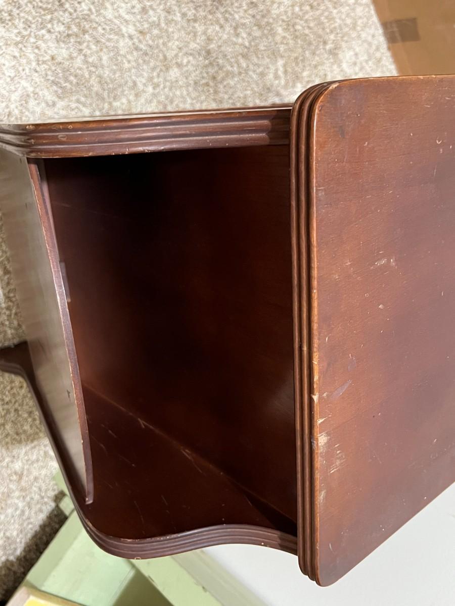 There is some vintage wear to the wood and some chipping/scratches, but there is no significant damage and is in overall good displayable or useable condition. Check pictures for more details. The side table stands at about 3 feet tall.