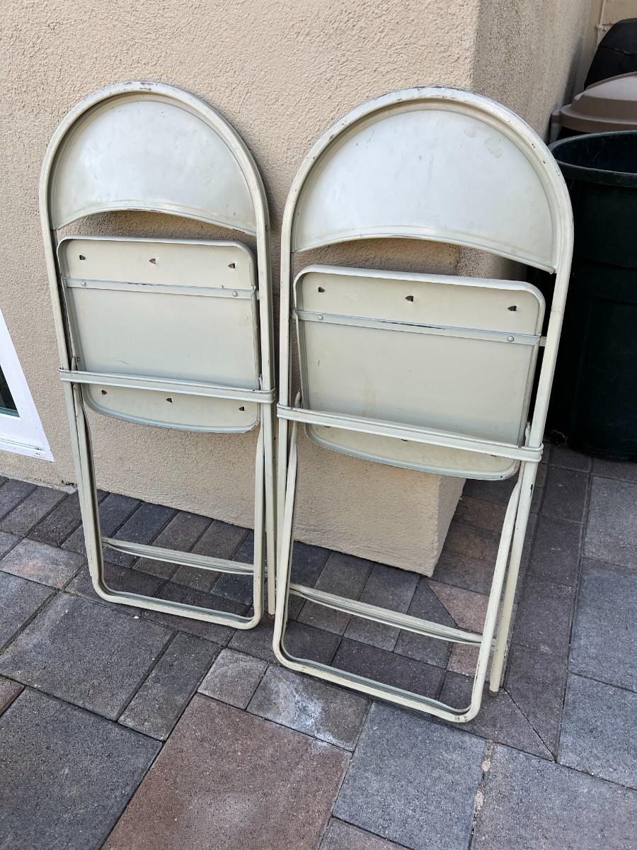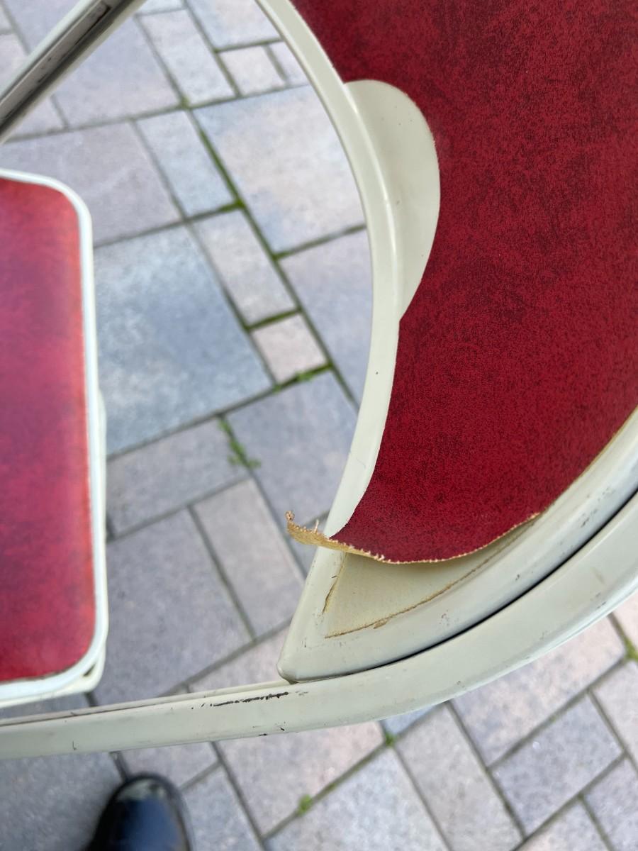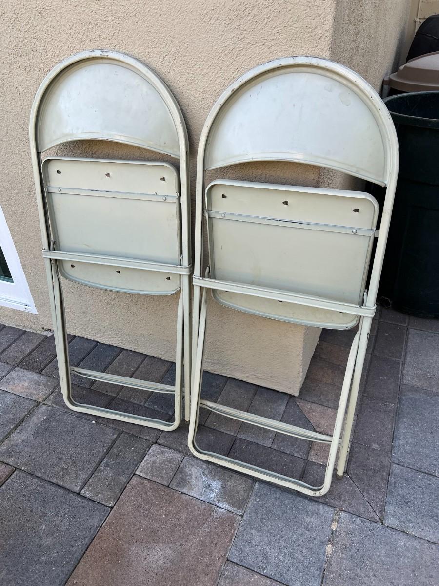 There is a rip on the table, and the material on some of the chairs is coming off. There is no other significant damage and is in overall good useable or collectible condition. Everything folds neatly and is perfect for card games or recreational use.