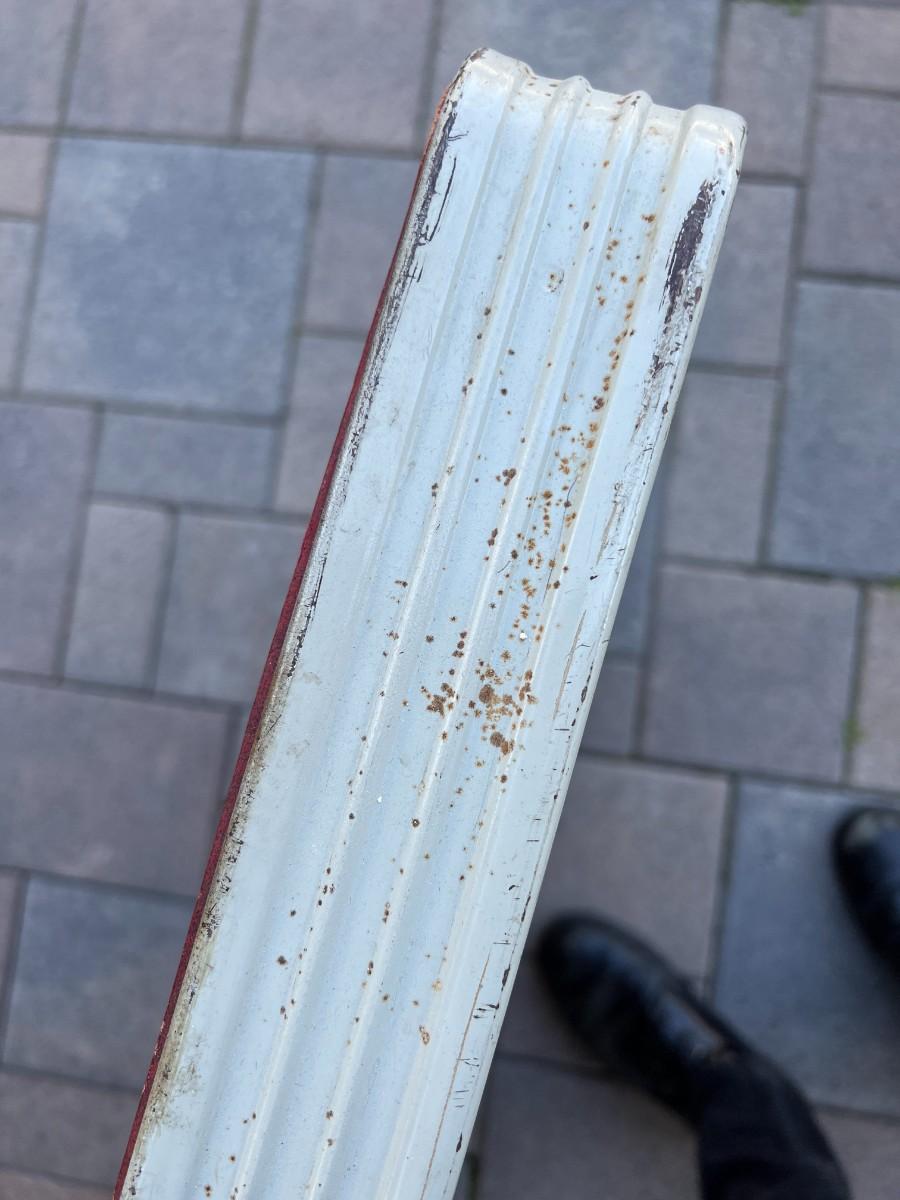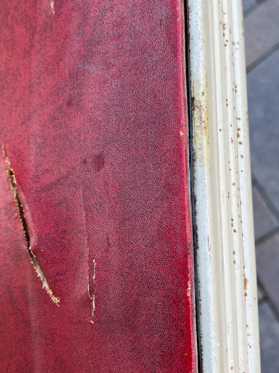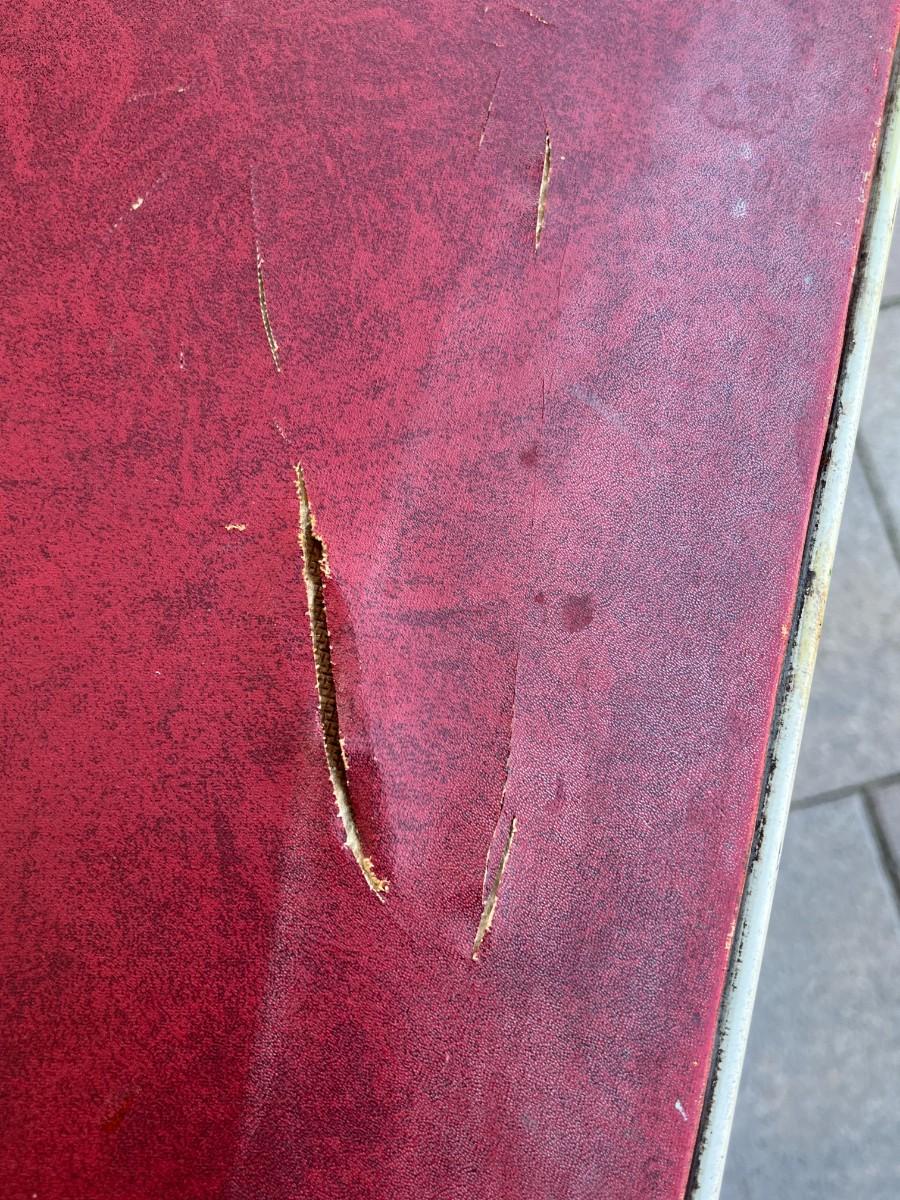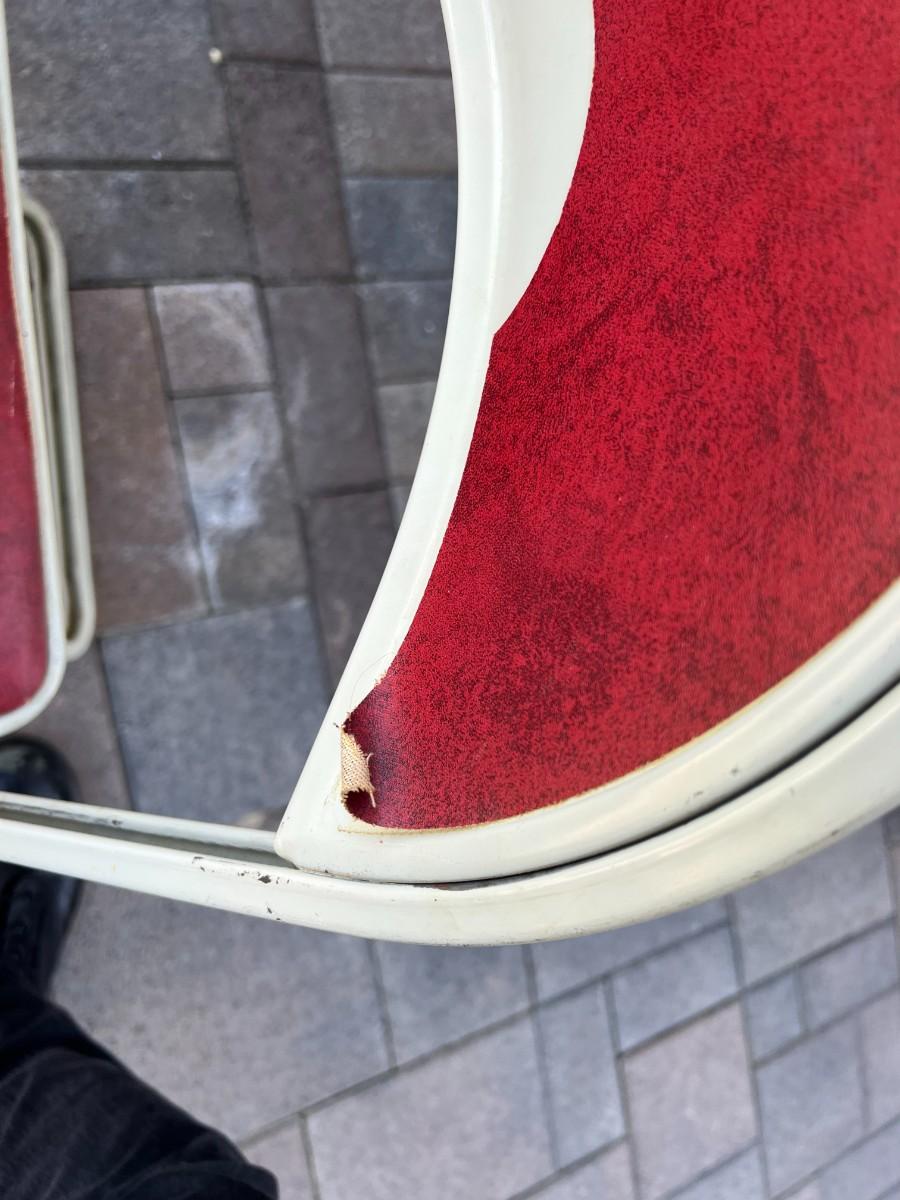 There is a rip on the table, and the material on some of the chairs is coming off. There is no other significant damage and is in overall good useable or collectible condition. Everything folds neatly and is perfect for card games or recreational use.