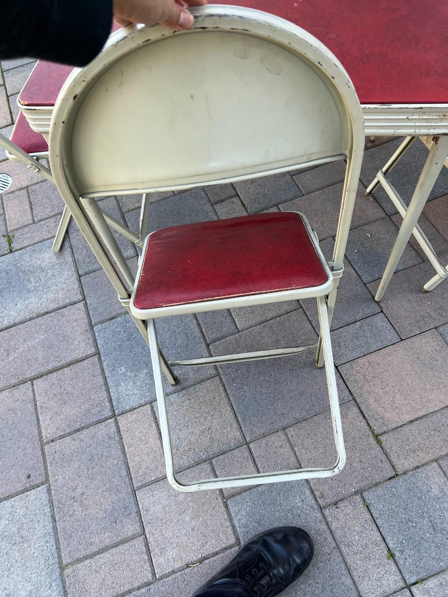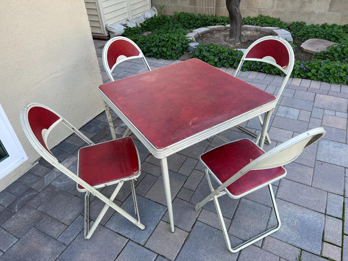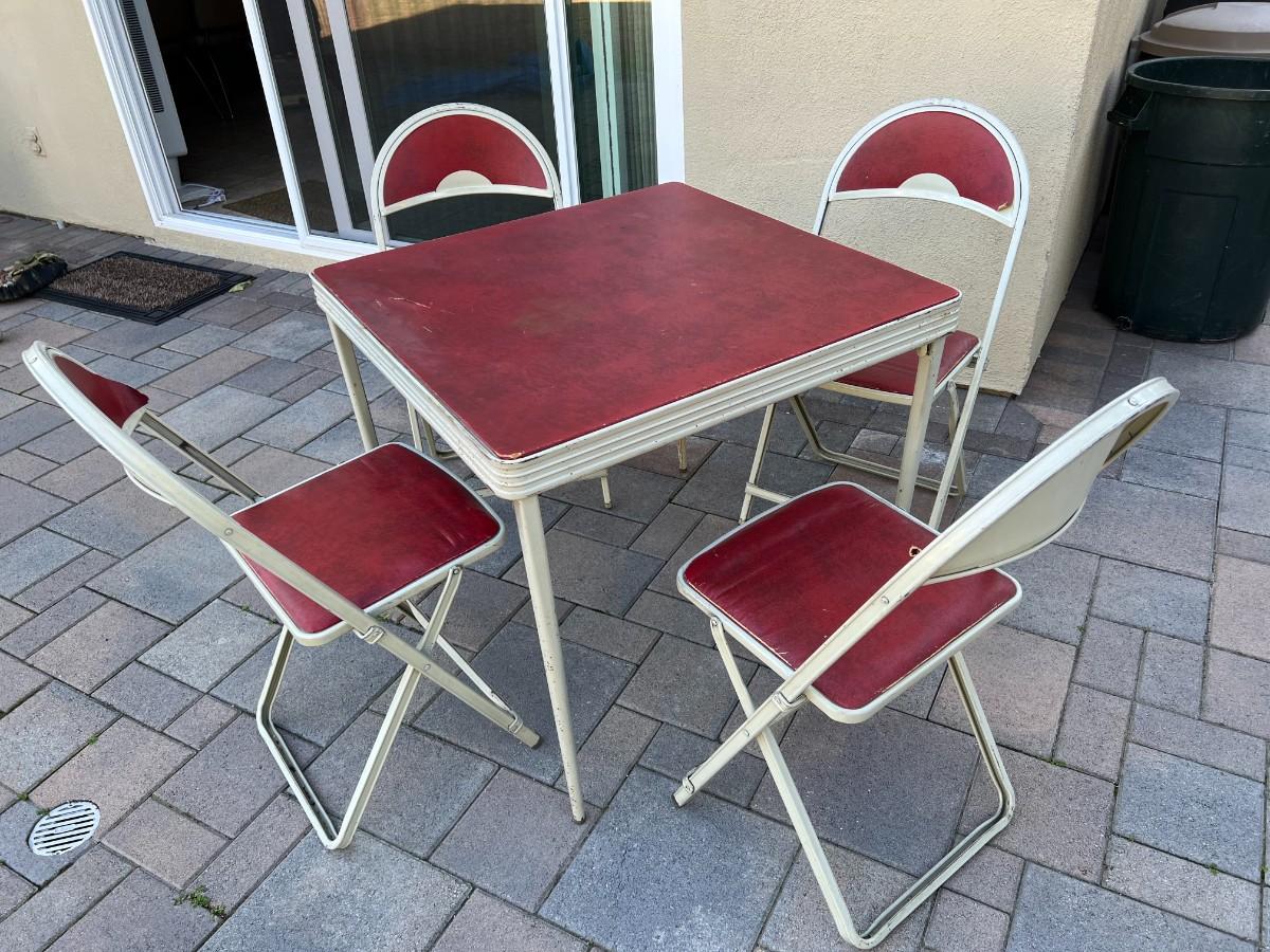Vintage The Durham Line Table Number 34 Red Motif Metal Folding Card Table & Matching Chairs Set