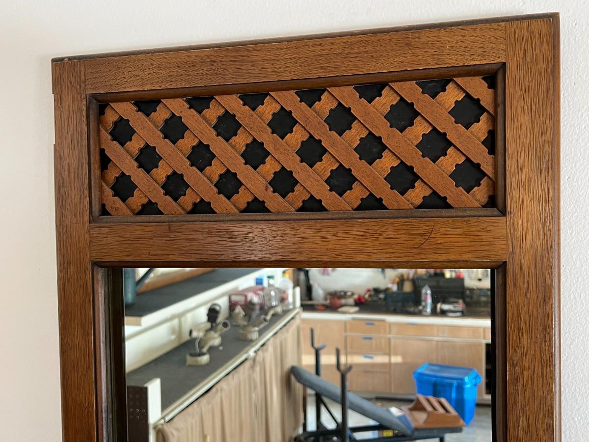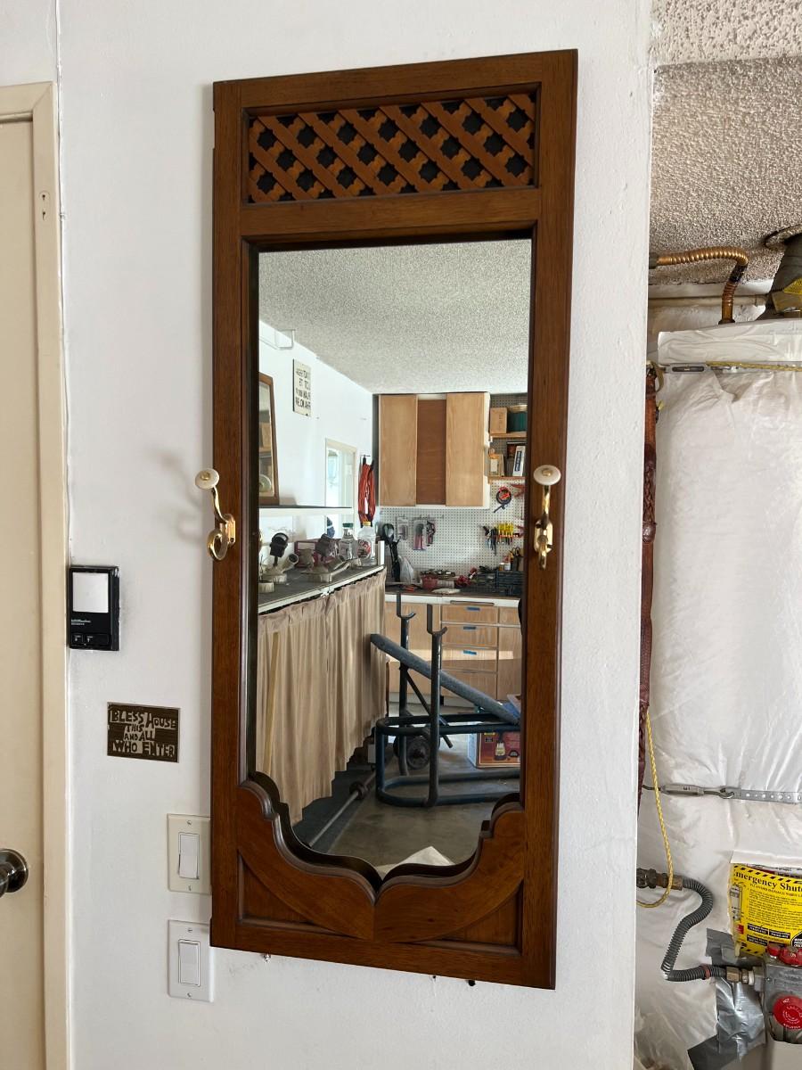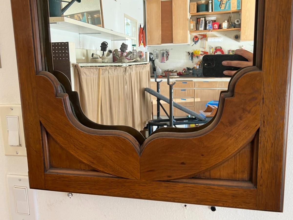 There is no significant damage to the mirror or the wood and is in overall good collectible or useable condition. Check pictures for more details and for sizing.