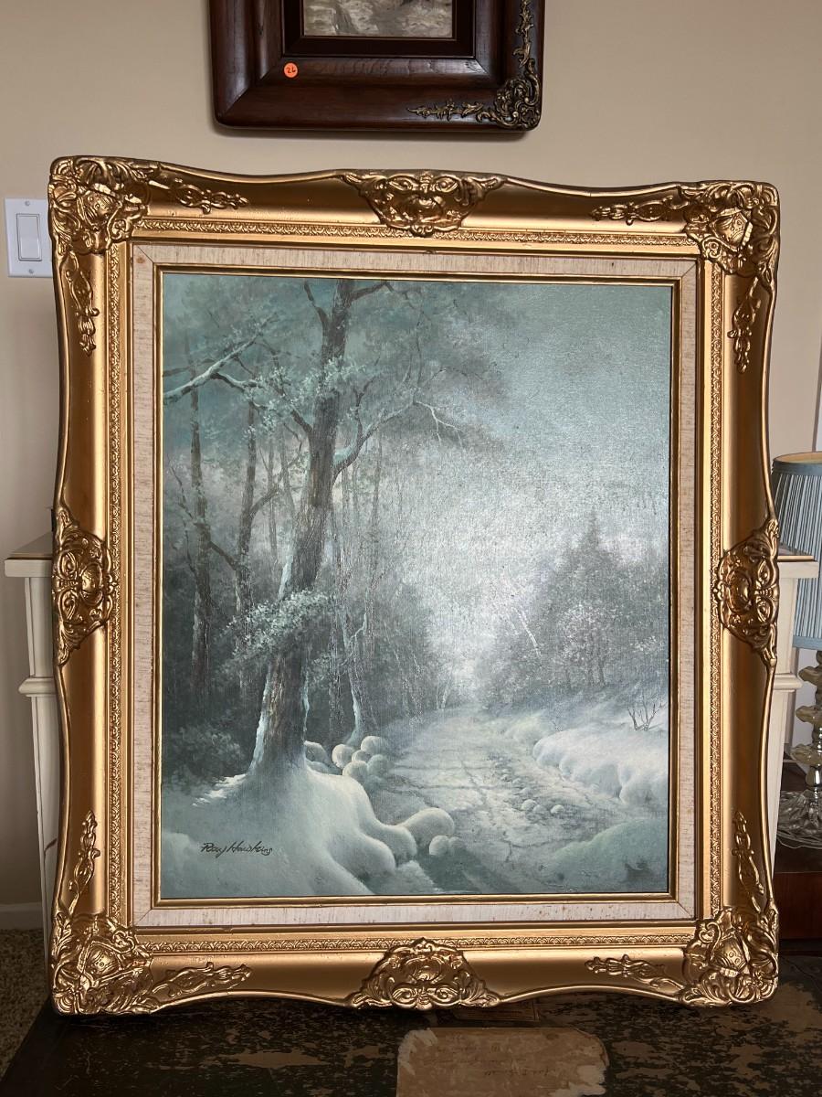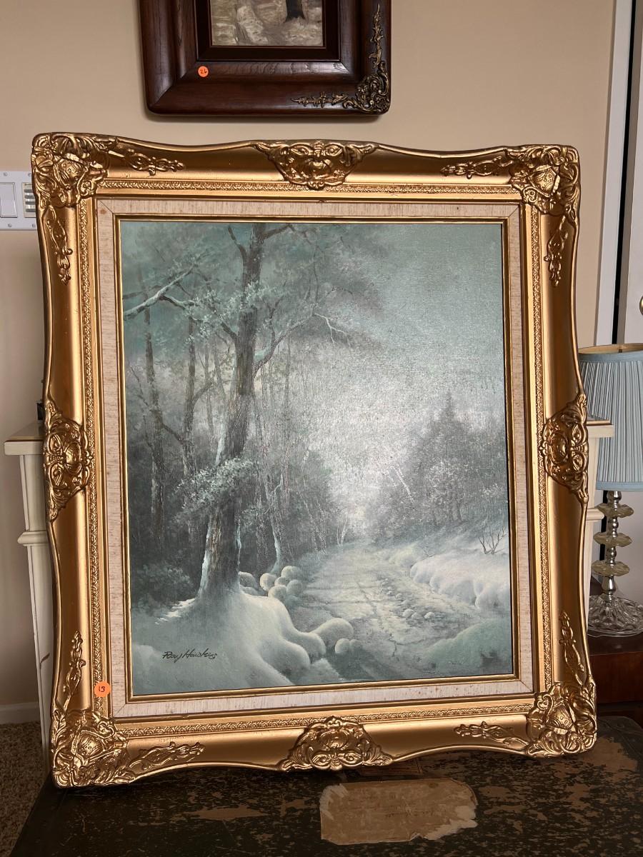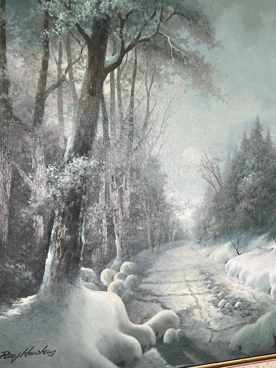 Vintage Framed Original Oil Painting Desolate Winter Snow Forest Artist Ray Hawkins